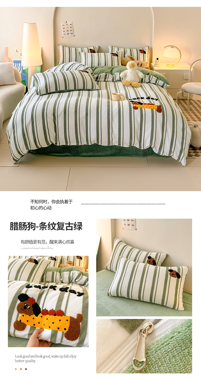 当前位置: 91家纺网 > 商品网购 > 床品套件 > 四件套 > 牛奶绒四件套 > 耀达家居 2024新款ins多巴胺毛巾绣牛奶绒四件套 腊肠狗-条纹复古绿
