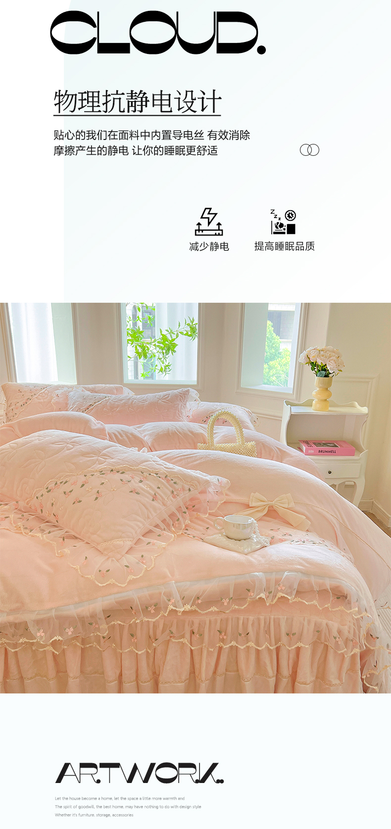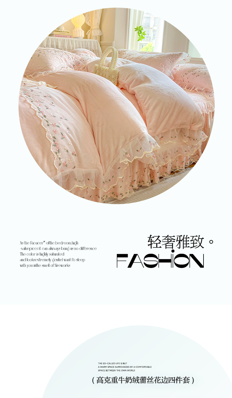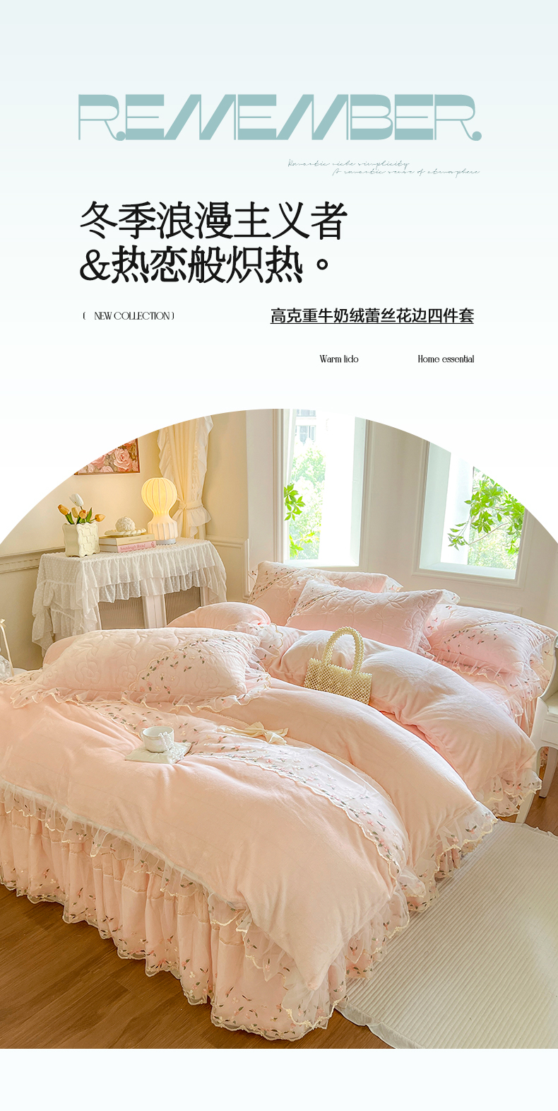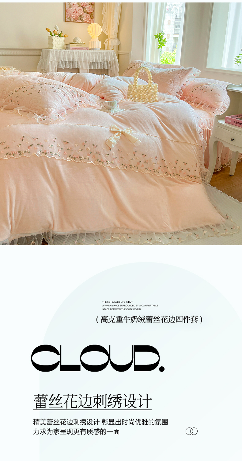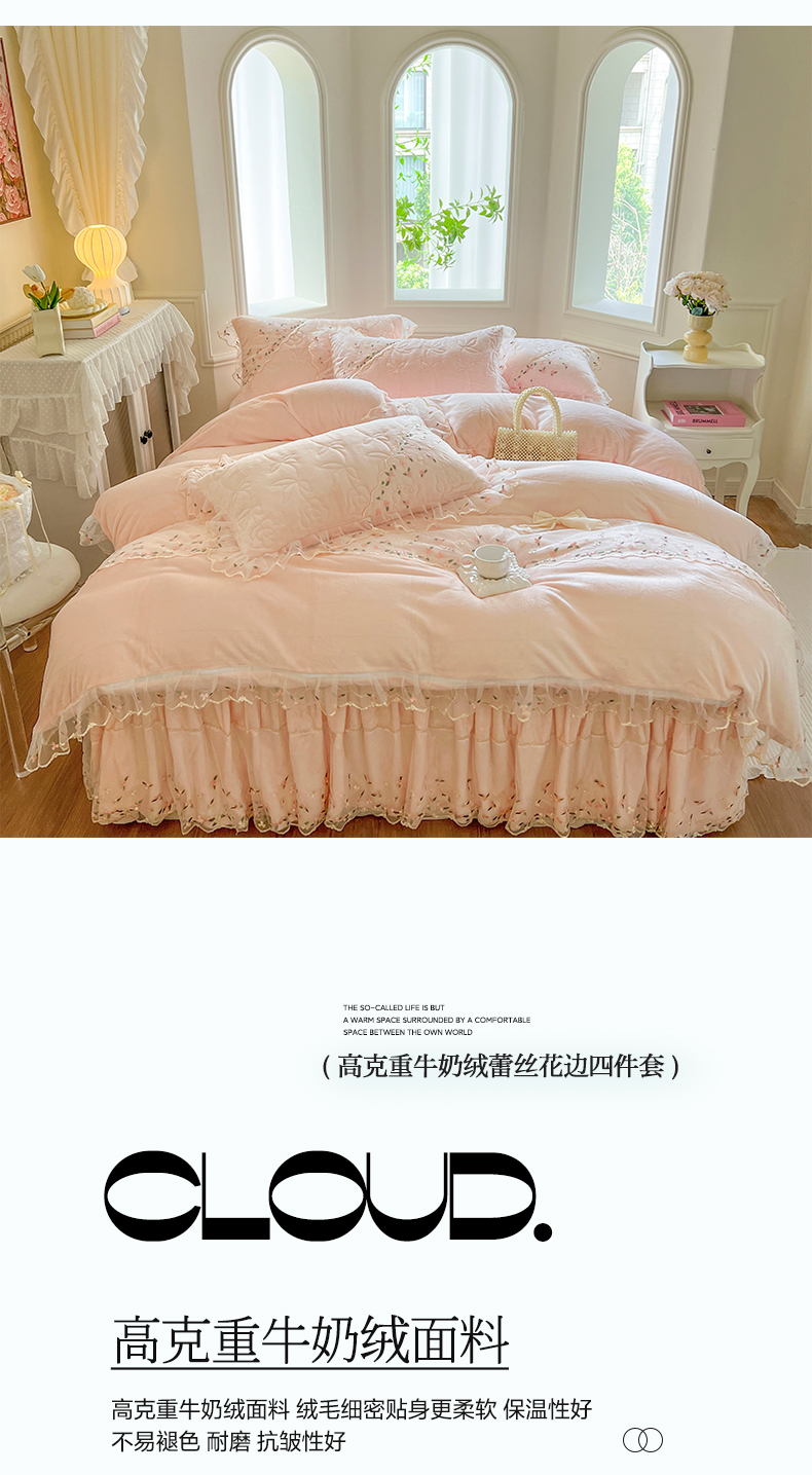 当前位置: 91家纺网 > 商品网购 > 床品套件 > 四件套 > 牛奶绒四件套 > 网红馆(ck家纺) 2025新款加厚保暖高克重牛奶绒蕾丝花边床裙款恬星系列四件套 恬星-樱落粉