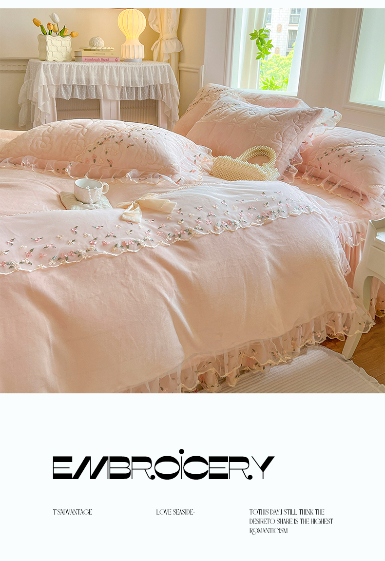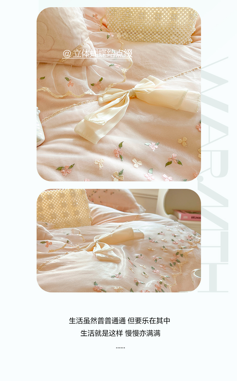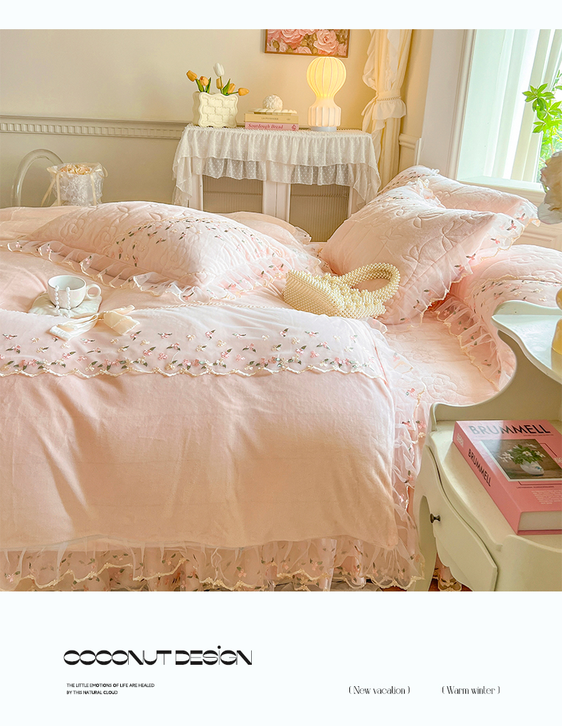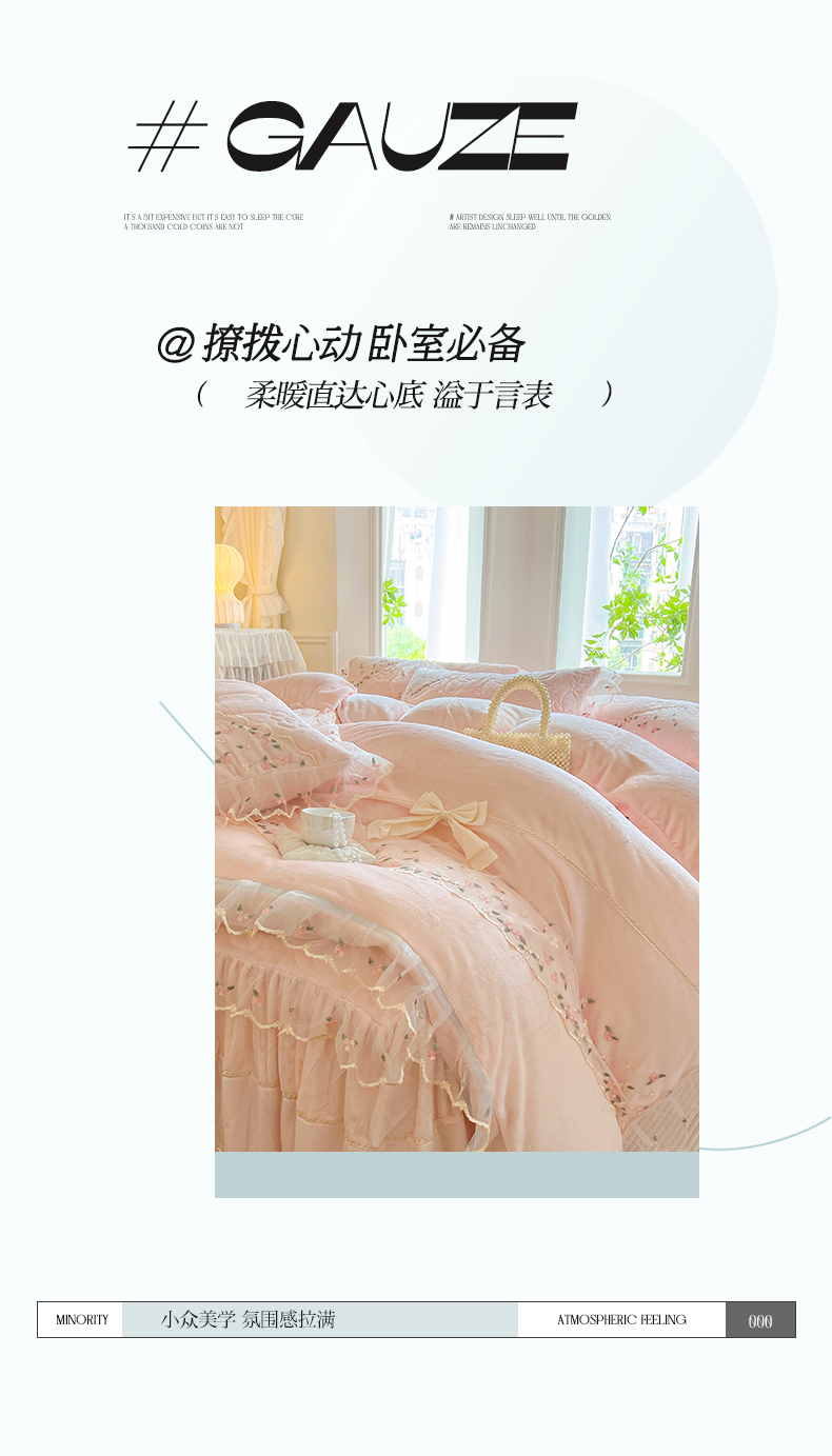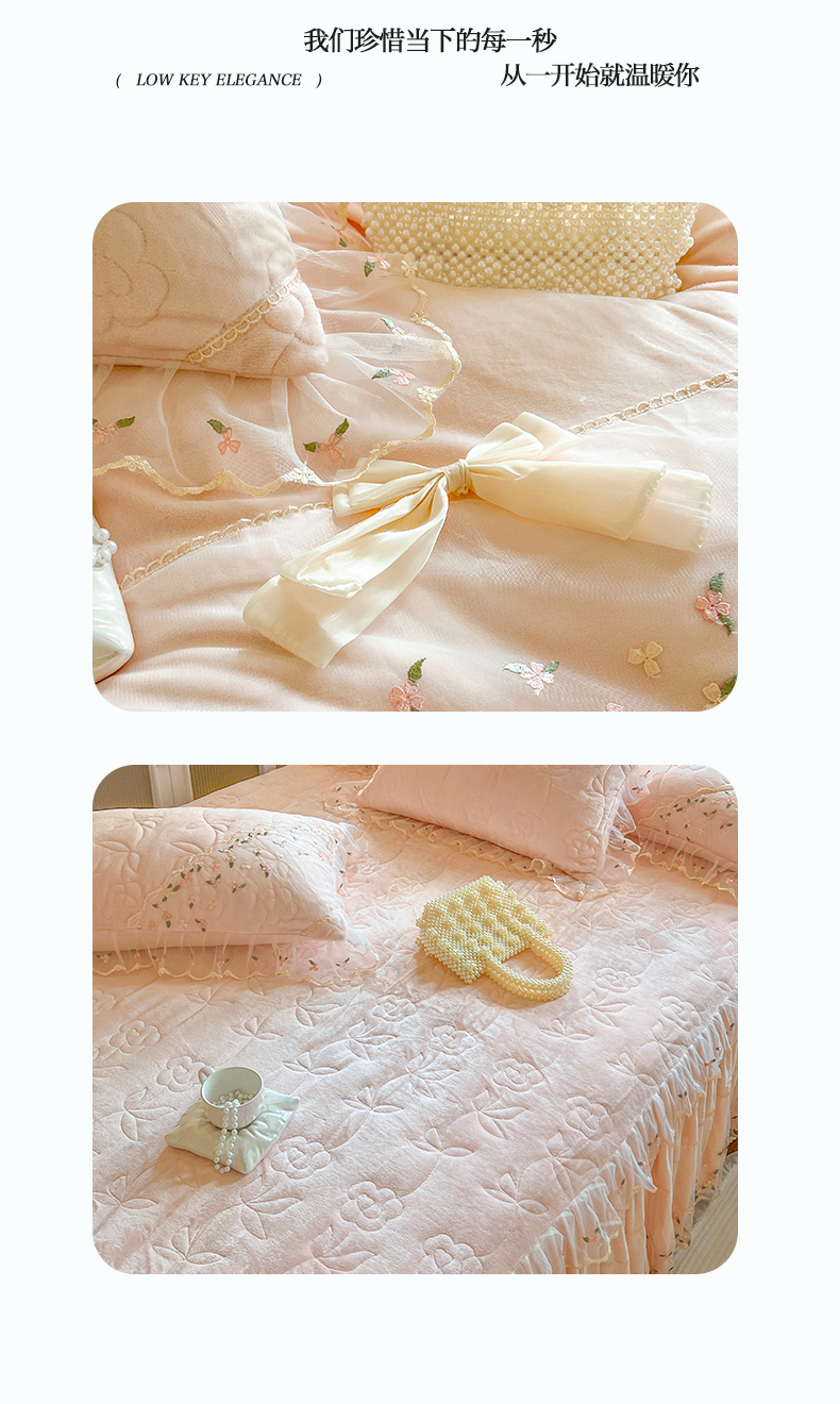 当前位置: 91家纺网 > 商品网购 > 床品套件 > 四件套 > 牛奶绒四件套 > 网红馆(ck家纺) 2025新款加厚保暖高克重牛奶绒蕾丝花边床裙款恬星系列四件套 恬星-樱落粉