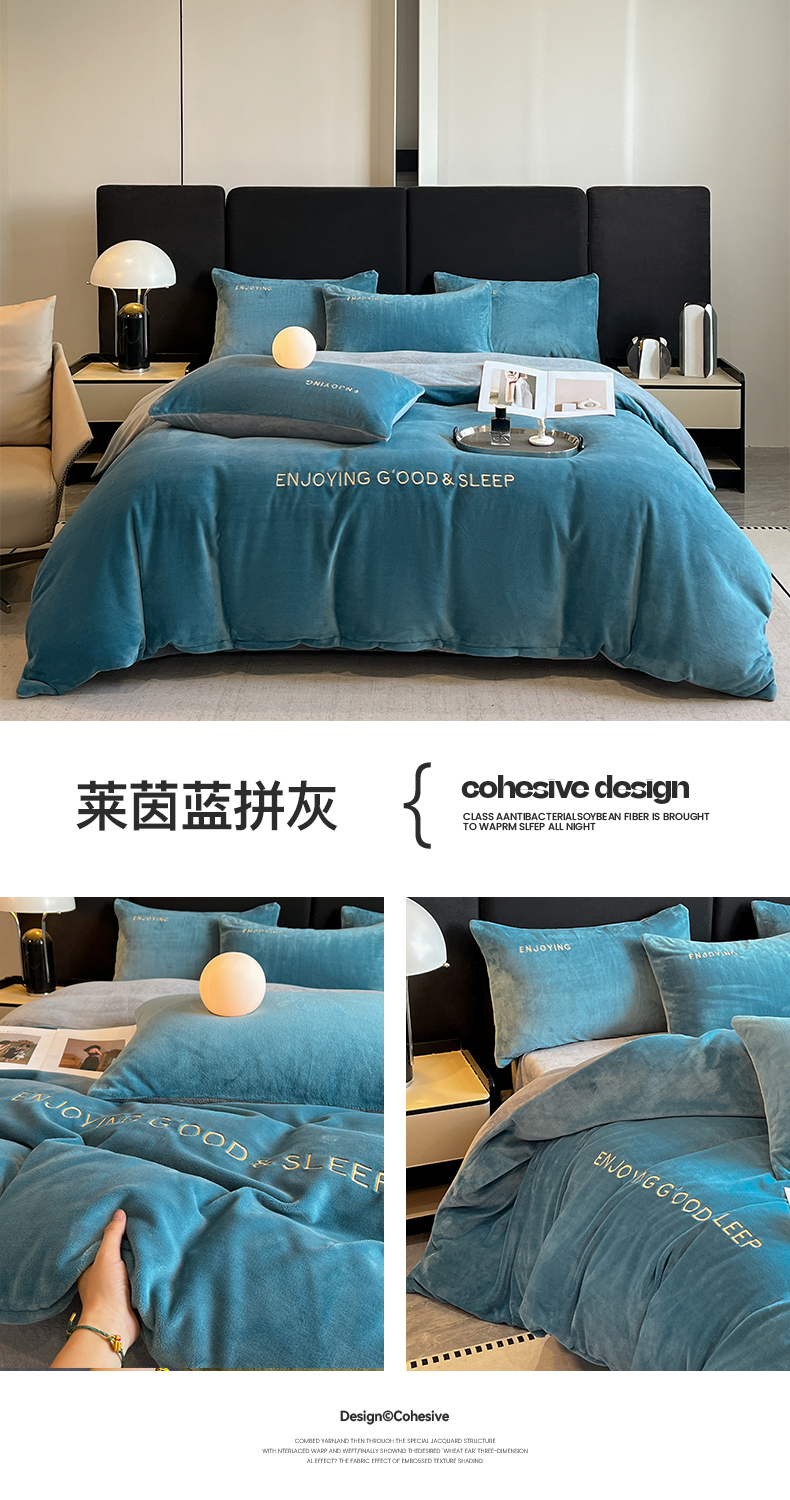 澳梵家居 2024新款牛奶绒刺绣四件套--【山岚系列】 莱茵蓝拼灰