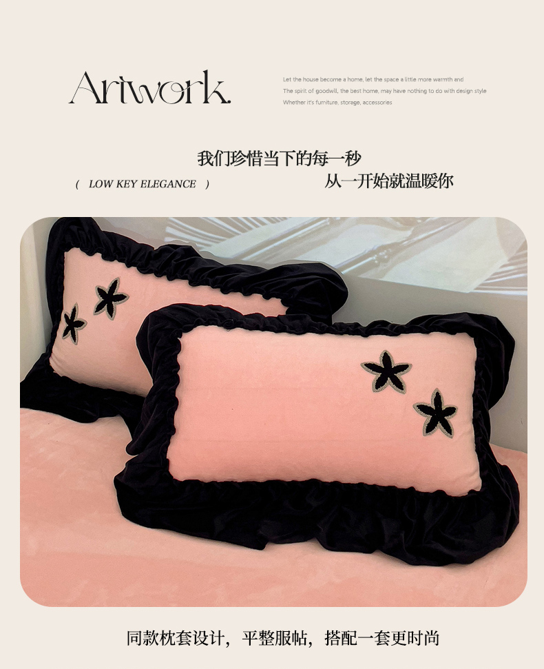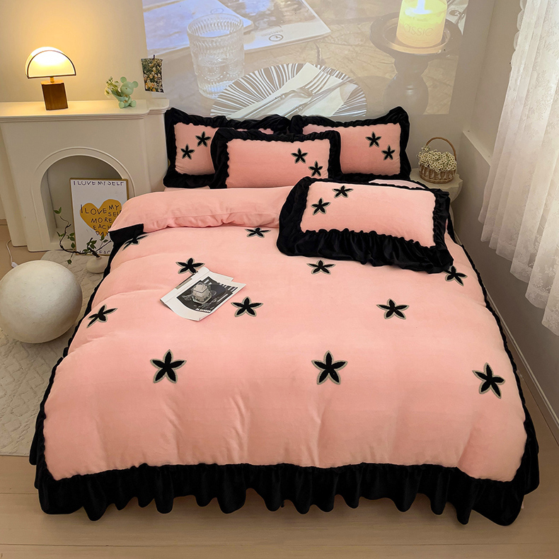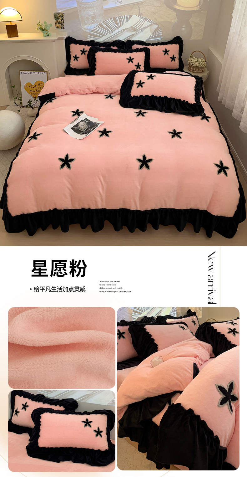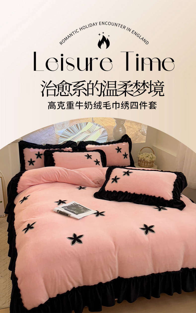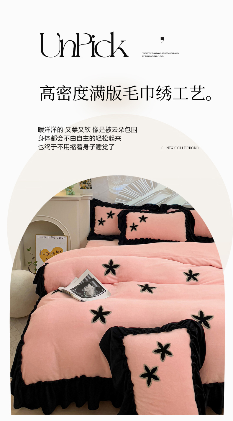 当前位置: 91家纺网 > 商品网购 > 床品套件 > 四件套 > 牛奶绒四件套 > 你好美丽 2025新款牛奶绒A类200克星愿毛巾绣花边四件套 星愿粉