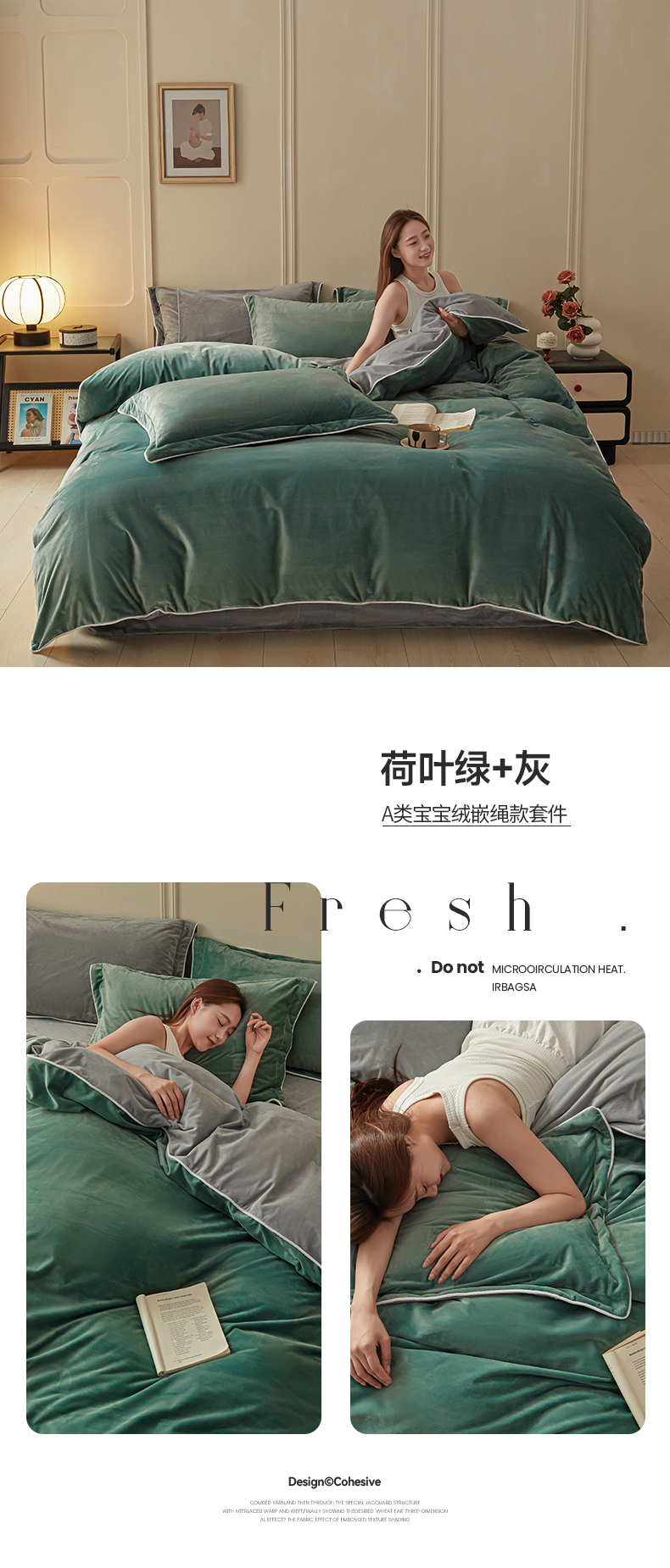 澳梵家居 澳梵家居 2024新款A类宝宝绒嵌绳款四件套--【雅致系列】 荷叶绿+灰