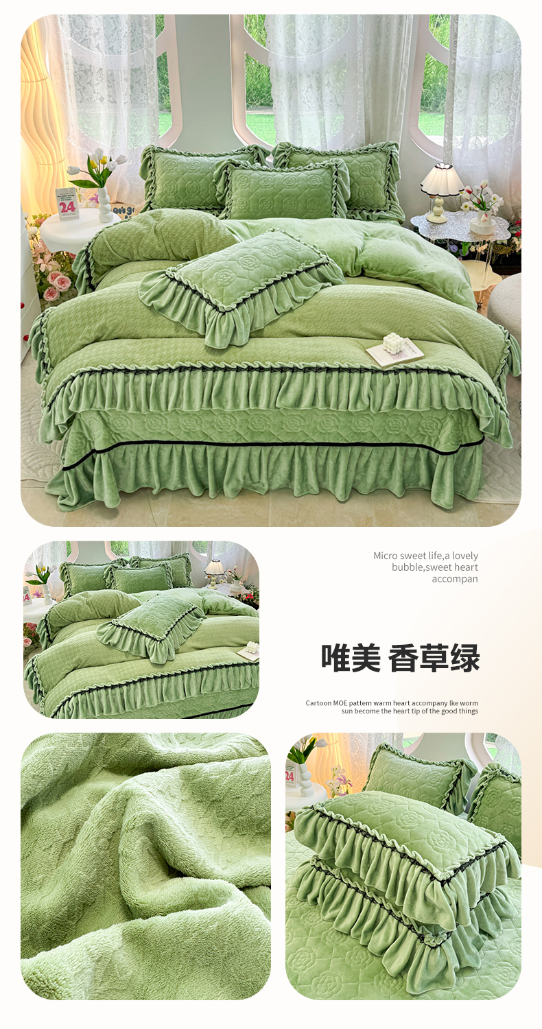 当前位置: 91家纺网 > 商品网购 > 床品套件 > 四件套 > 牛奶绒四件套 > 铠畅家纺 2025新款牛奶绒花边床盖四件套-唯美 唯美香草绿