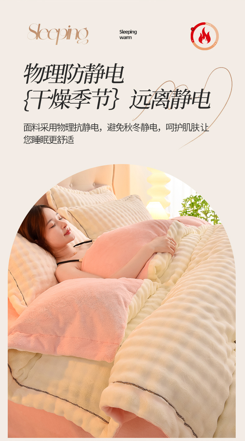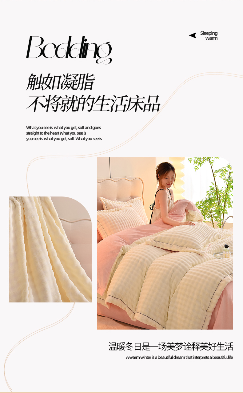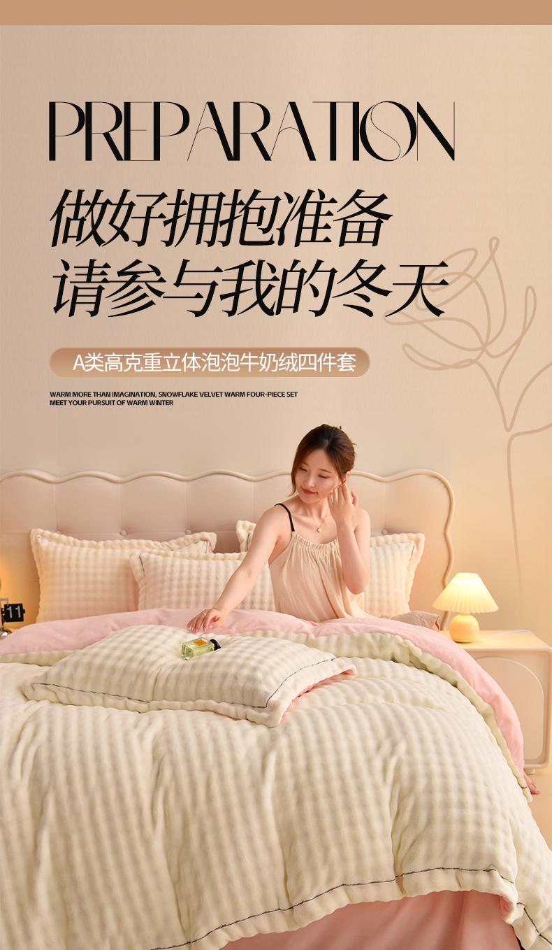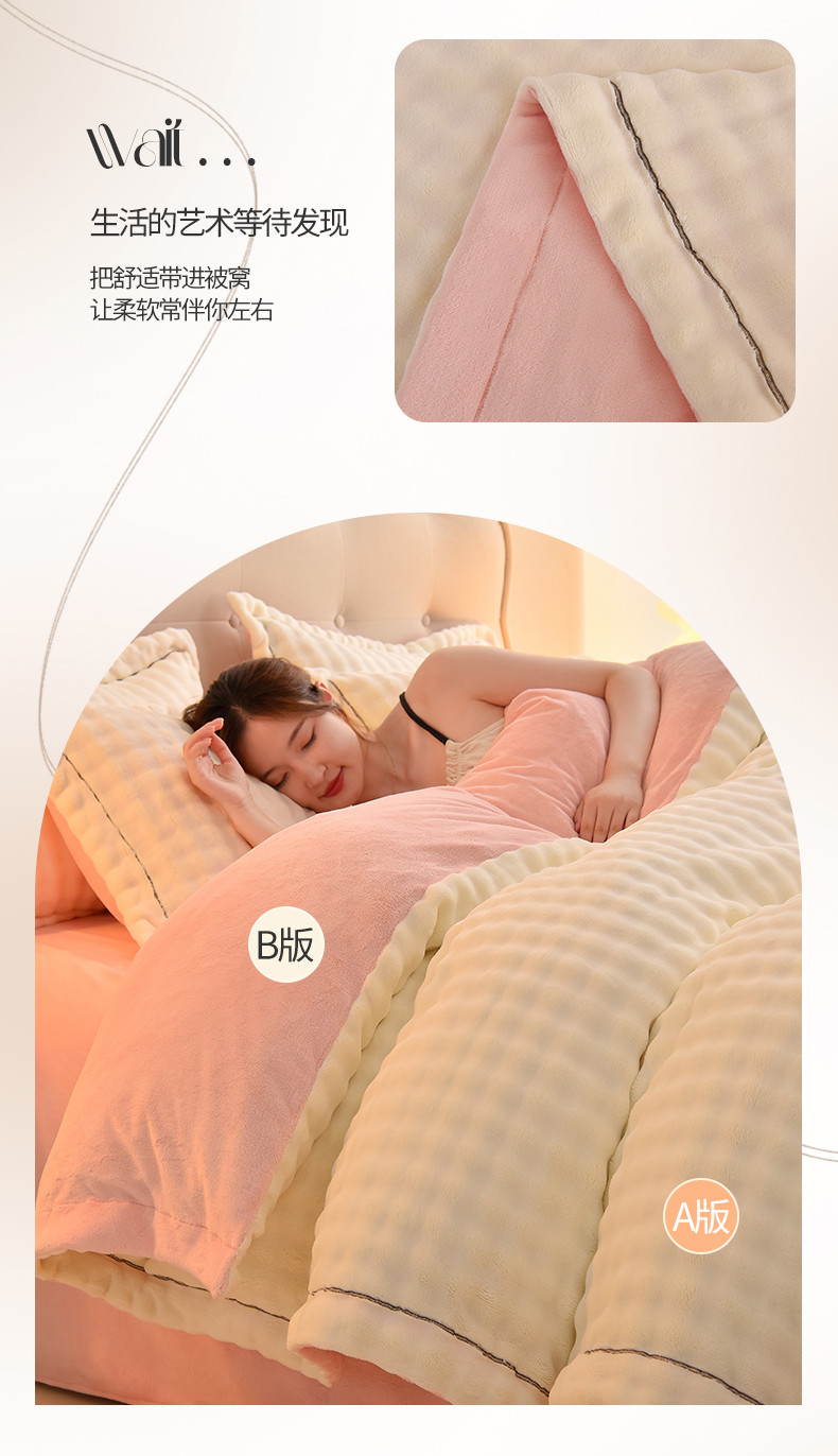 商品名称:米奈家居 2024新款A类高克重泡泡牛奶绒四件套 白拼粉