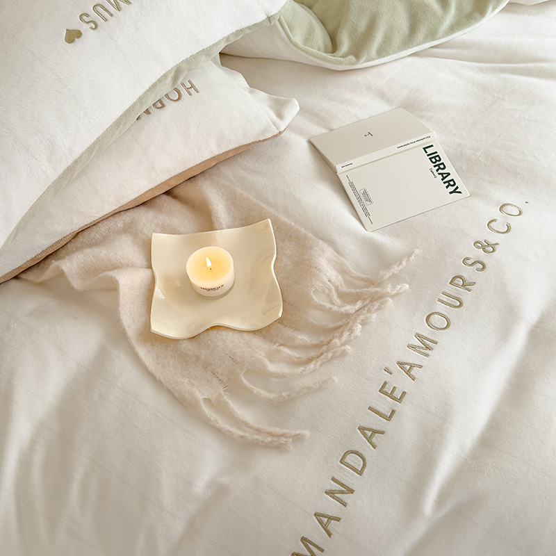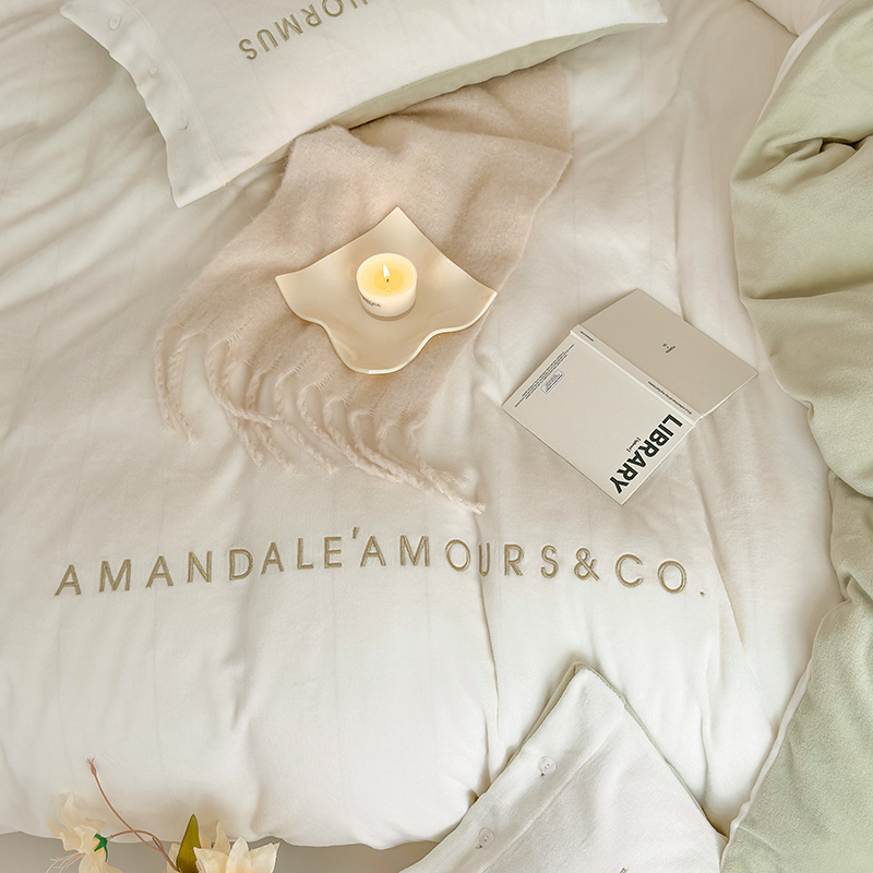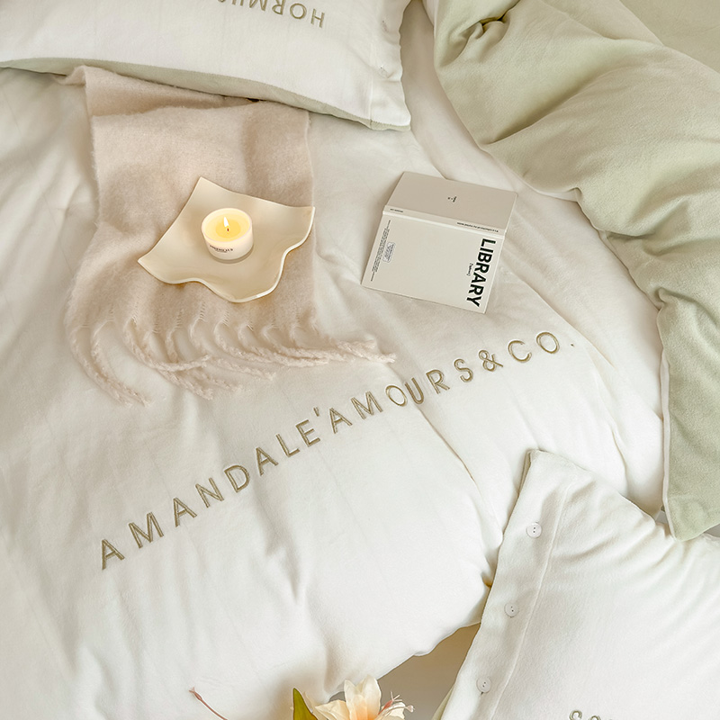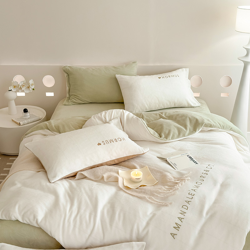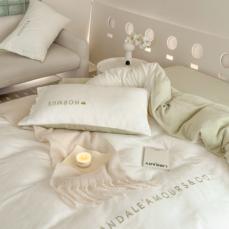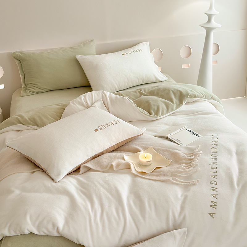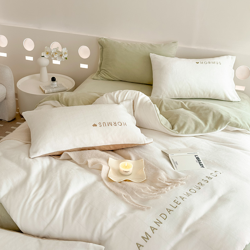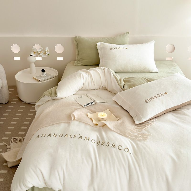 潘朵拉家纺 2024新款字母绣花纯色系列牛奶绒四件套 穆斯 白+绿