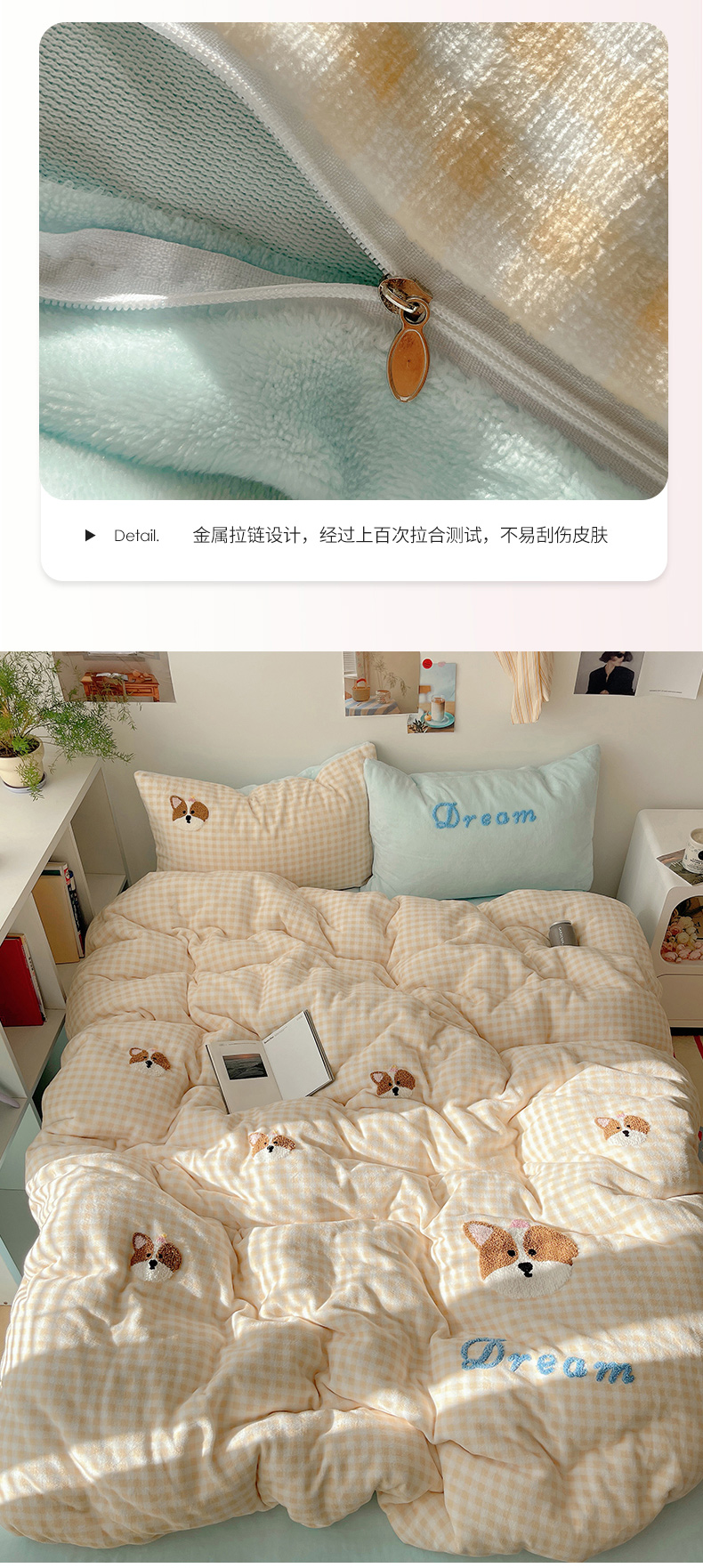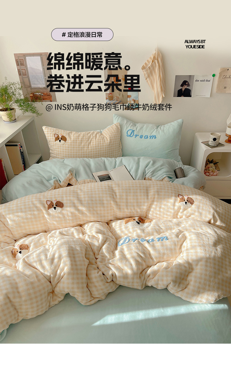 (总)顾里家纺 2024新款ins奶萌格子狗狗毛巾绣牛奶绒四件套,粉格小狗,黄格小狗,咖格小狗,蓝格小狗,绿格小狗