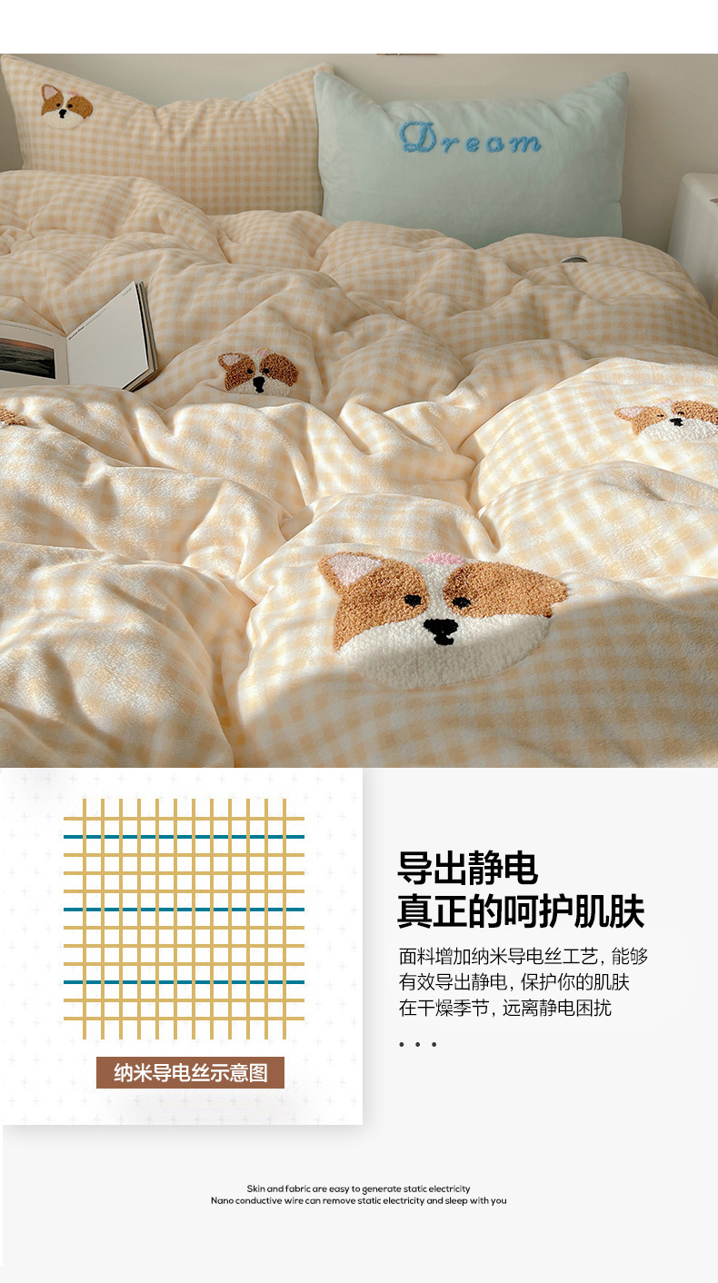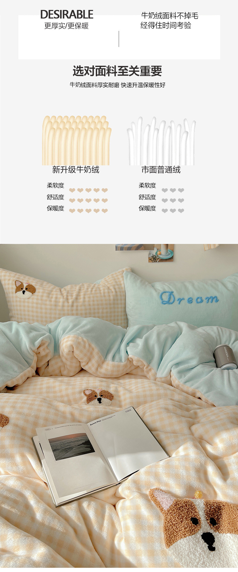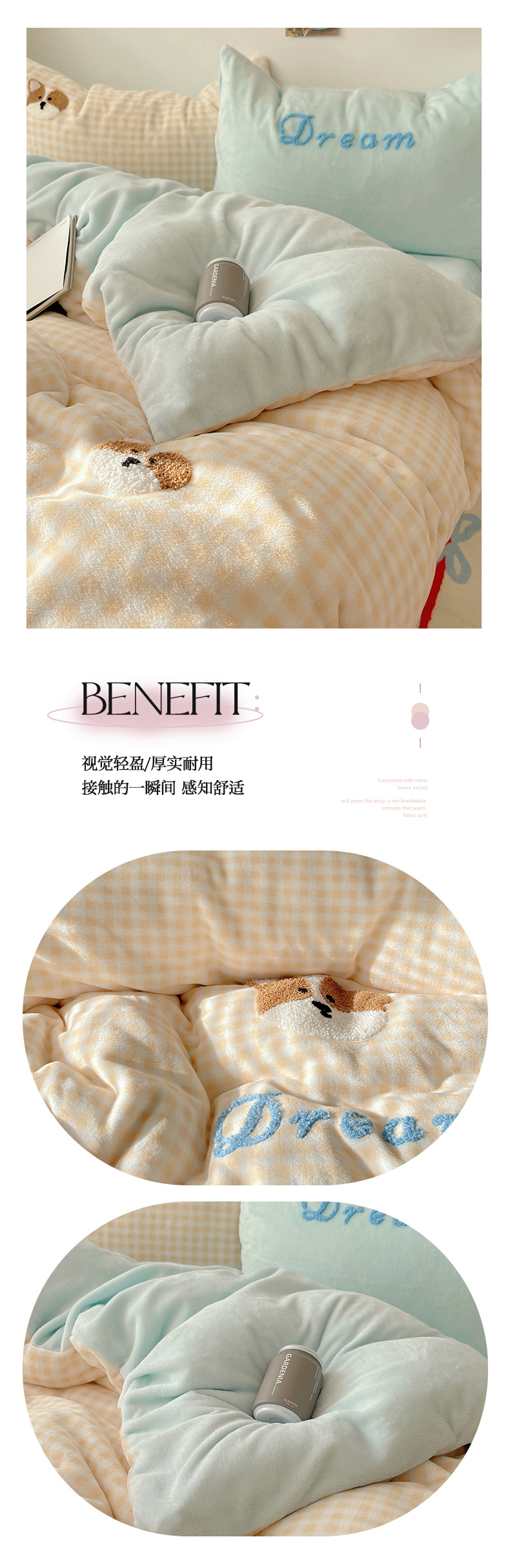 商品名称:顾里家纺 2024新款ins奶萌格子狗狗毛巾绣牛奶绒四件套 黄格小狗