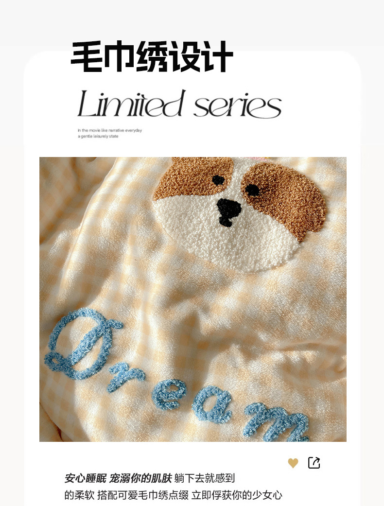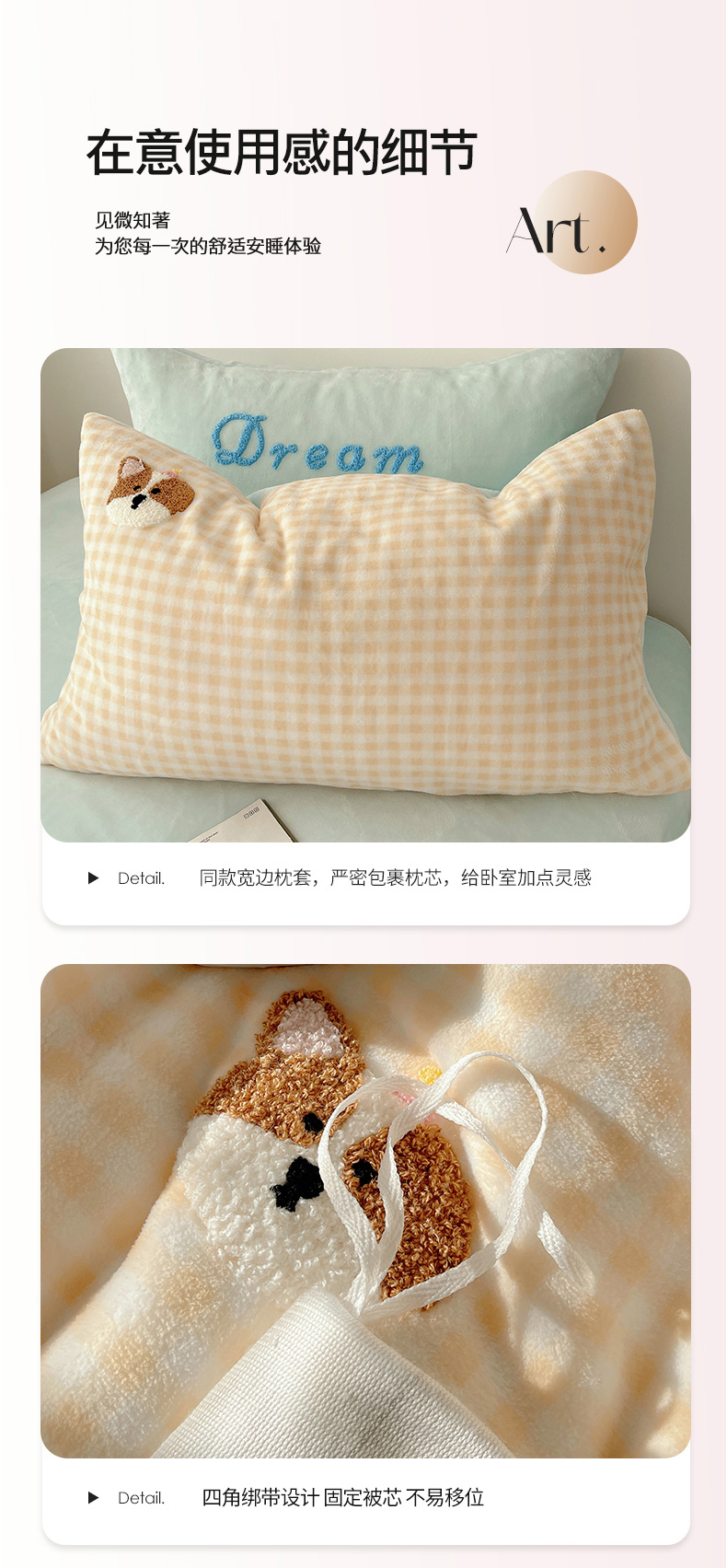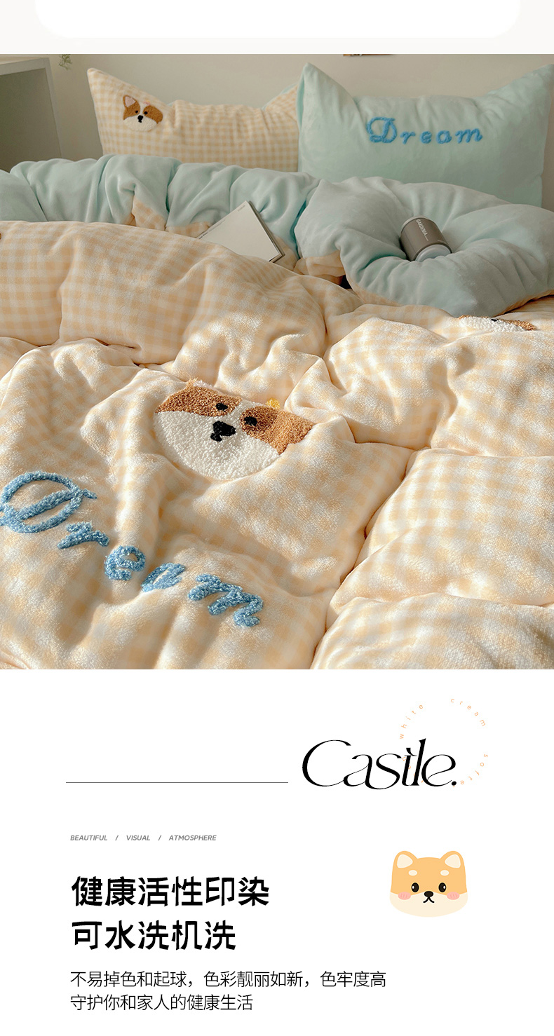 商品名称:顾里家纺 2024新款ins奶萌格子狗狗毛巾绣牛奶绒四件套 黄格小狗
