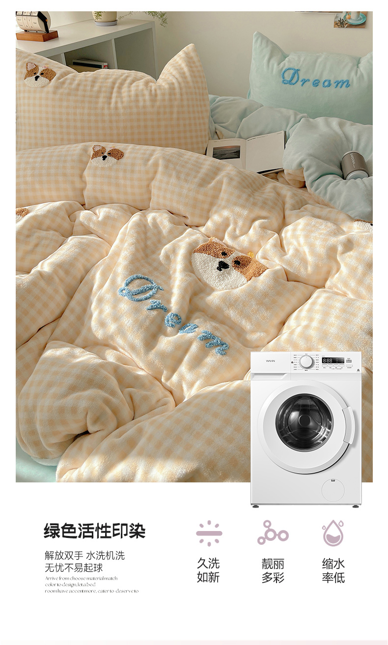 顾里家纺 2024新款ins奶萌格子狗狗毛巾绣牛奶绒四件套 黄格小狗