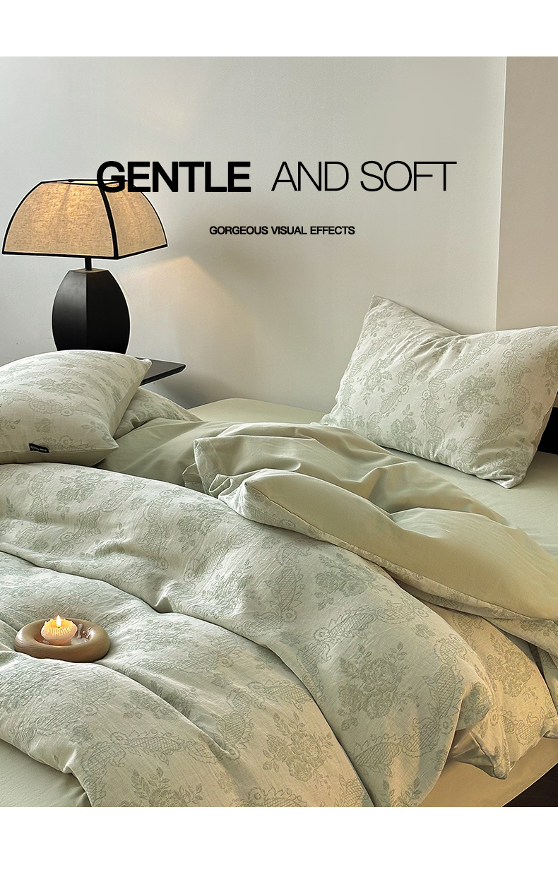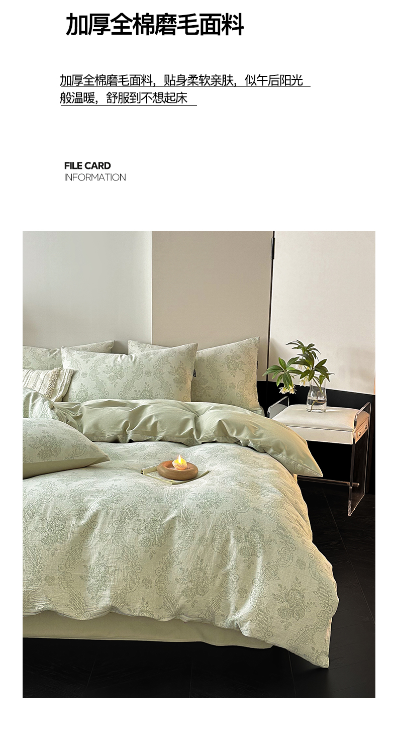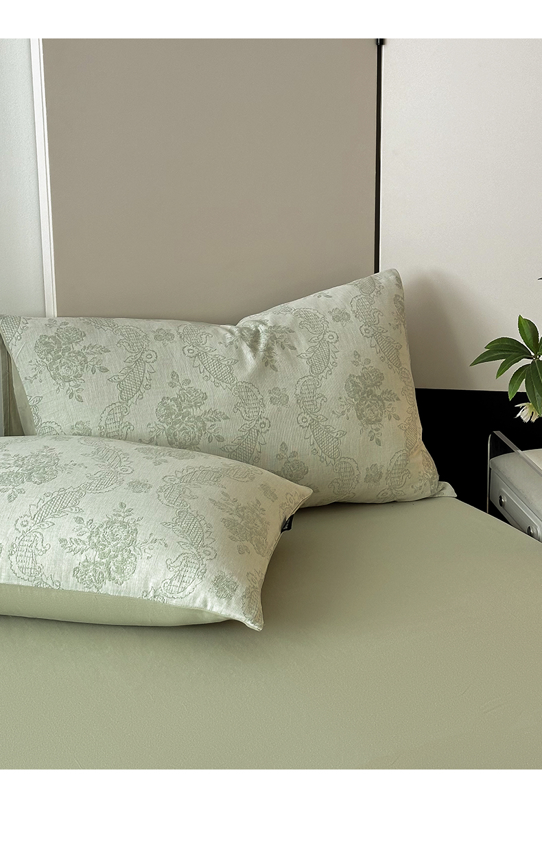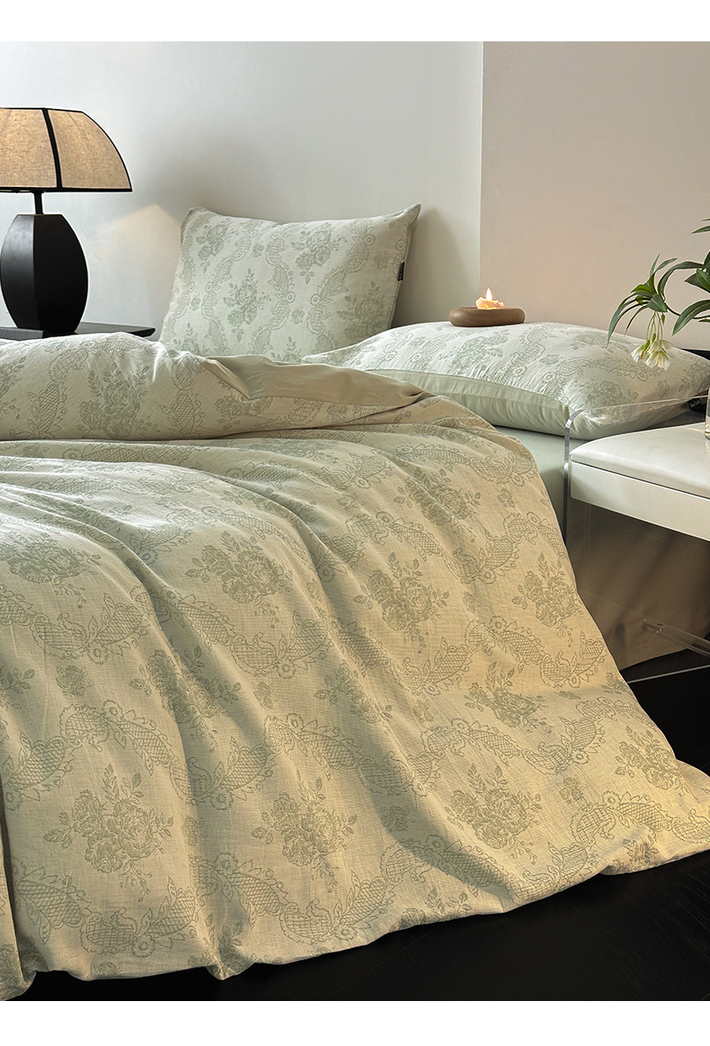 当前位置: 91家纺网 > 商品网购 > 床品套件 > 四件套 > 全棉普通四件套 > 典曼家纺 2024秋冬新款A类三层纱加厚磨毛大提花四件套 玫瑰面纱-绿