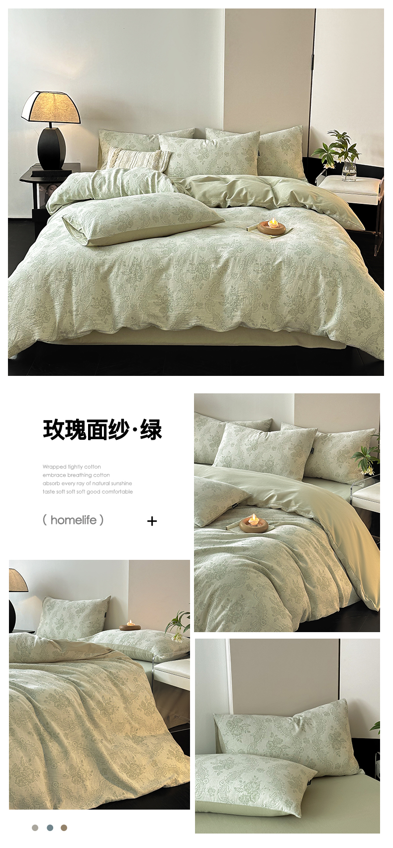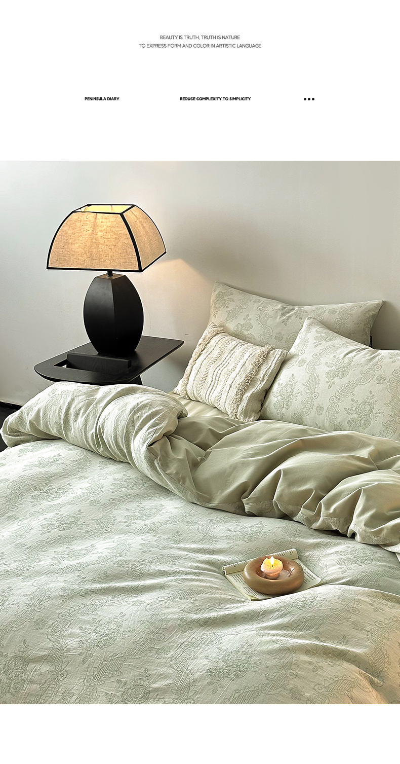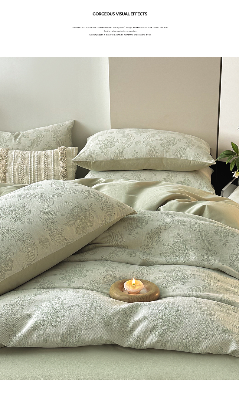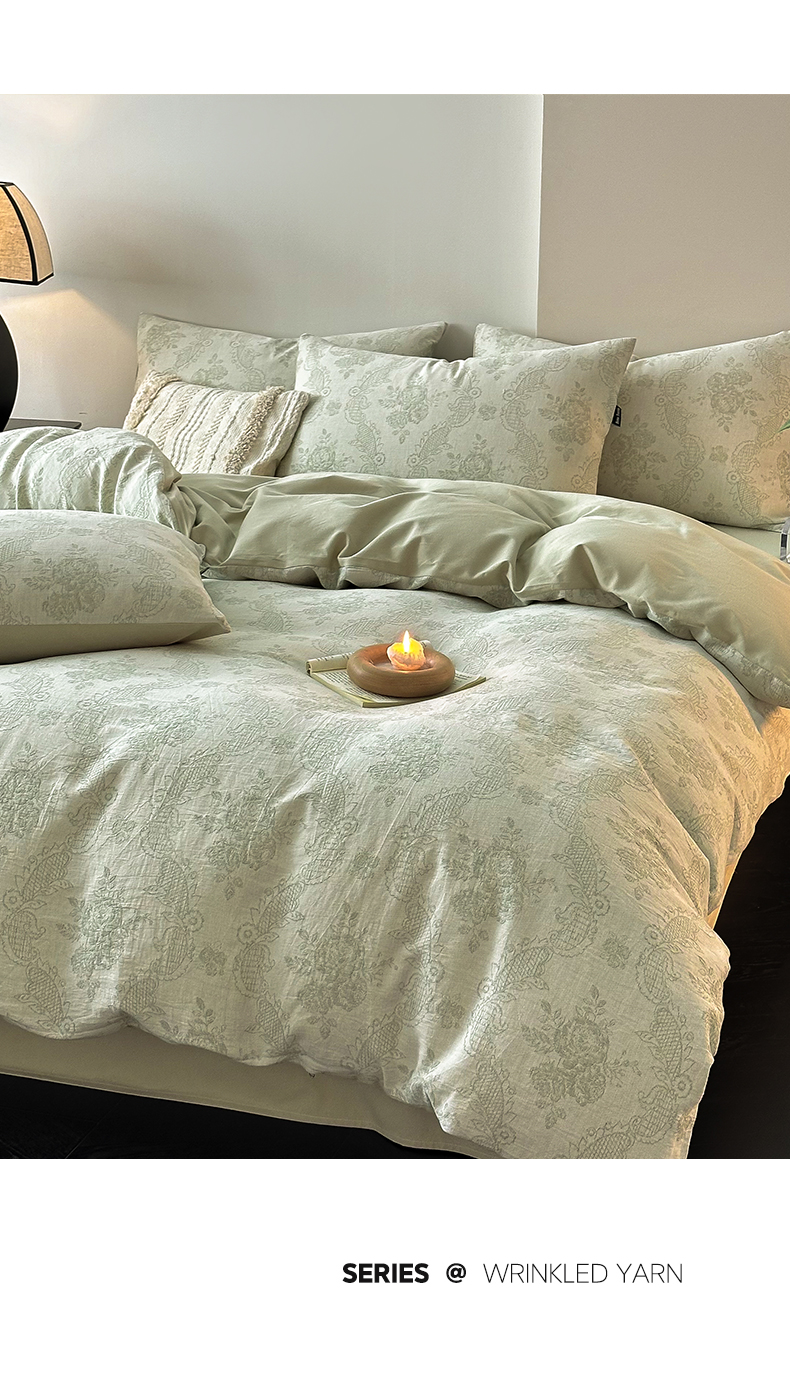 当前位置: 91家纺网 > 商品网购 > 床品套件 > 四件套 > 全棉普通四件套 > 典曼家纺 2024秋冬新款A类三层纱加厚磨毛大提花四件套 玫瑰面纱-绿