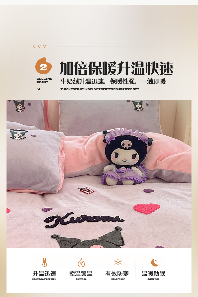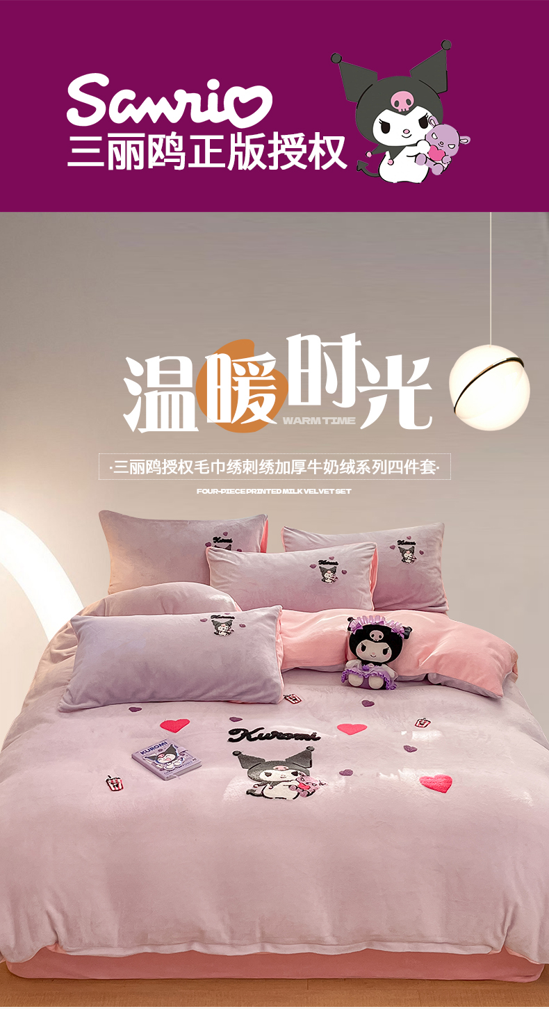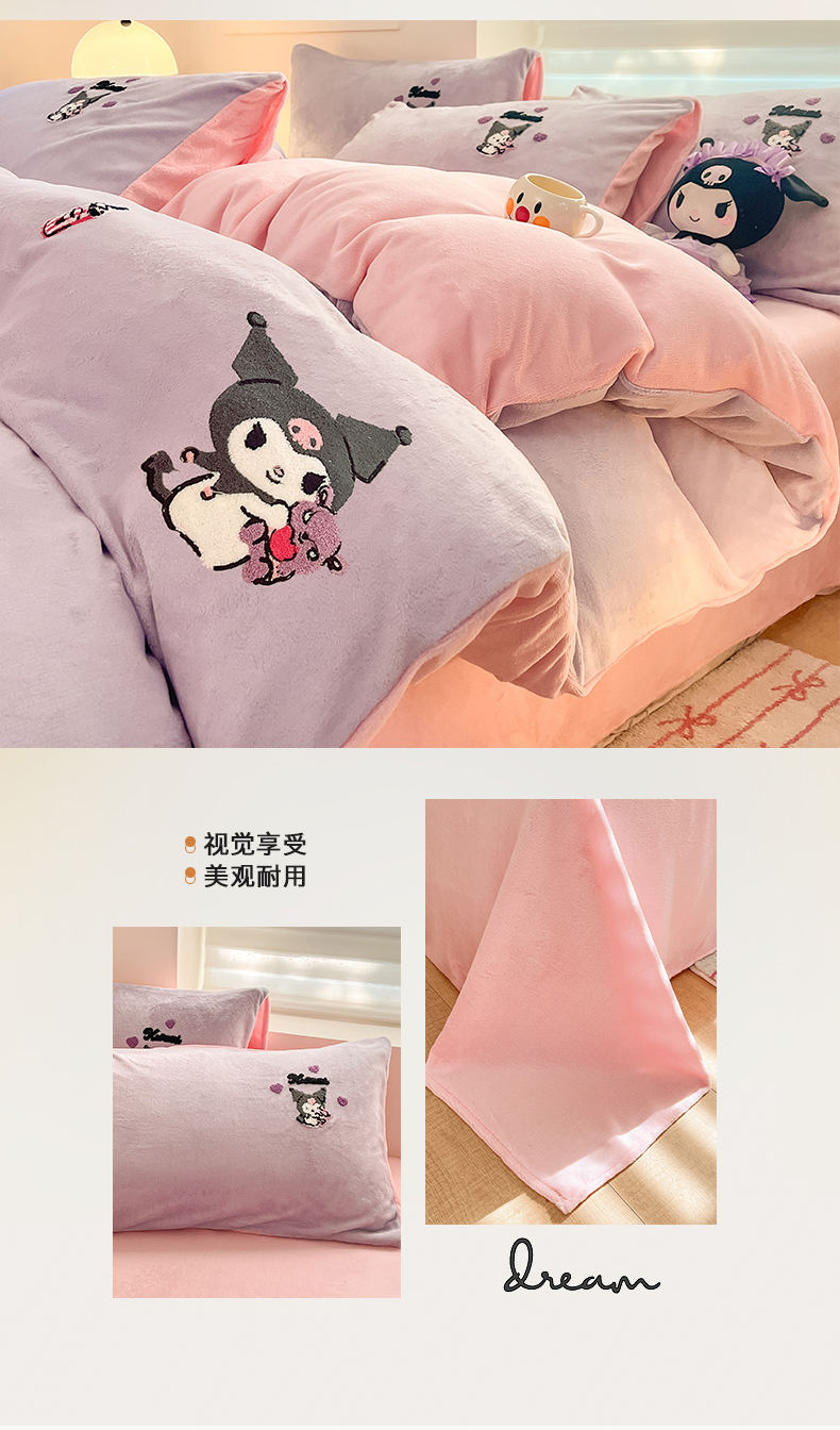 当前位置: 91家纺网 > 商品网购 > 床品套件 > 四件套 > 牛奶绒四件套 > 金爱家 2024新款正版三丽鸥授权毛巾绣刺绣工艺加厚牛奶绒系列四件套 绒毛巾绣-粉紫库洛米