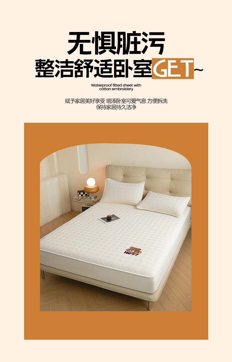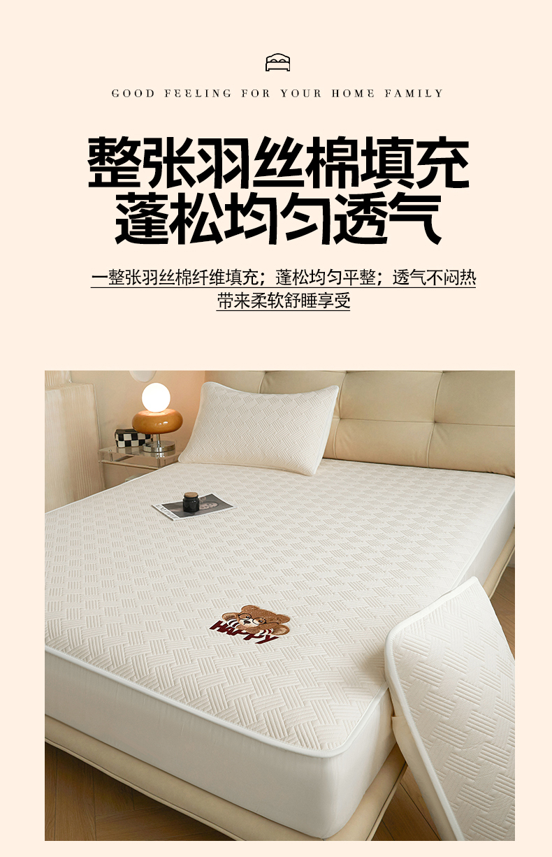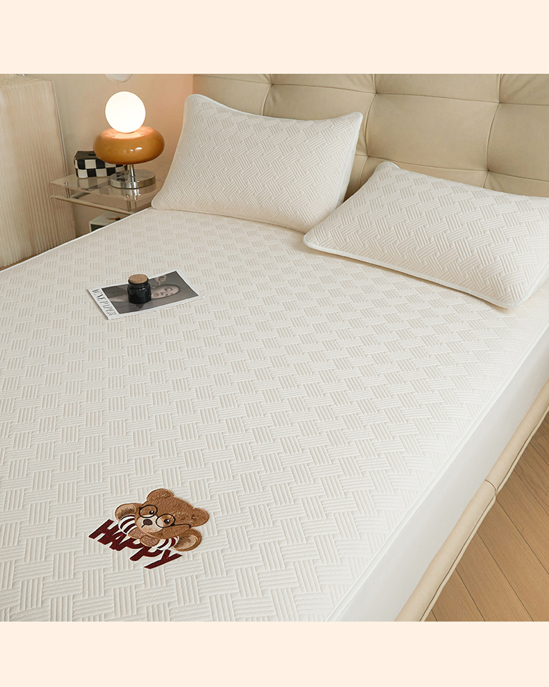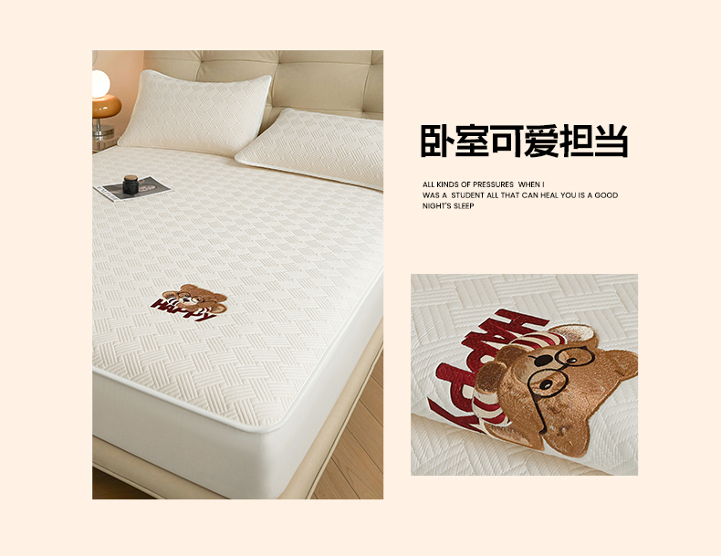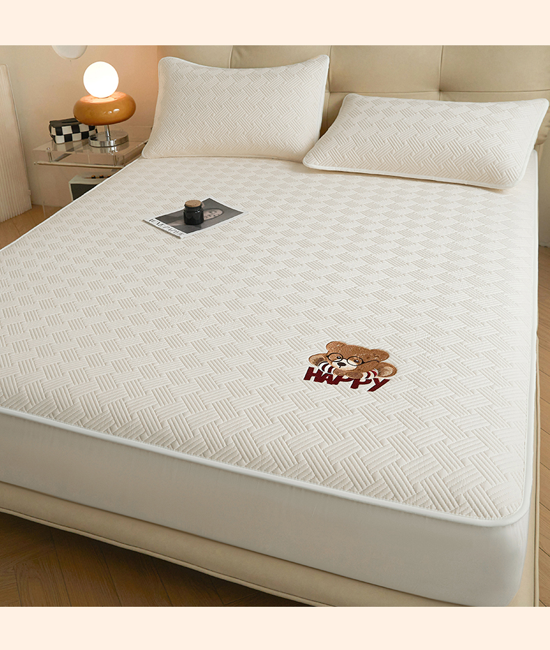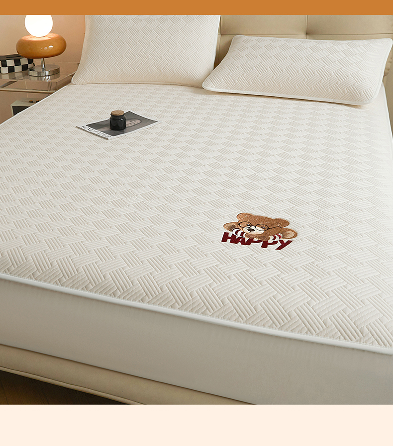 暖季家纺 2025新款40支长绒棉刺绣款全棉夹棉床笠支持定制 博士小熊-奶昔白