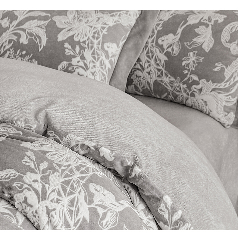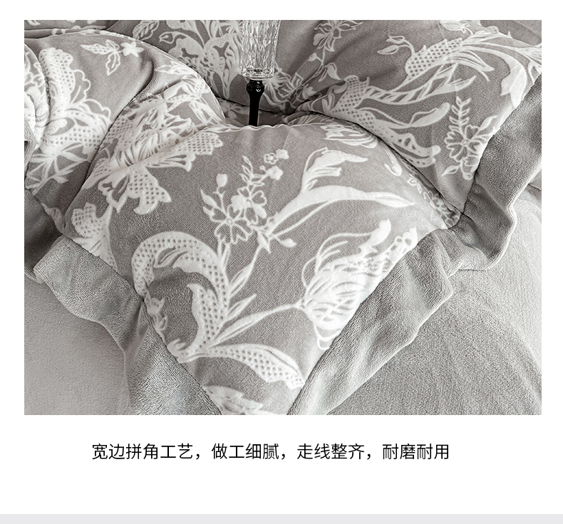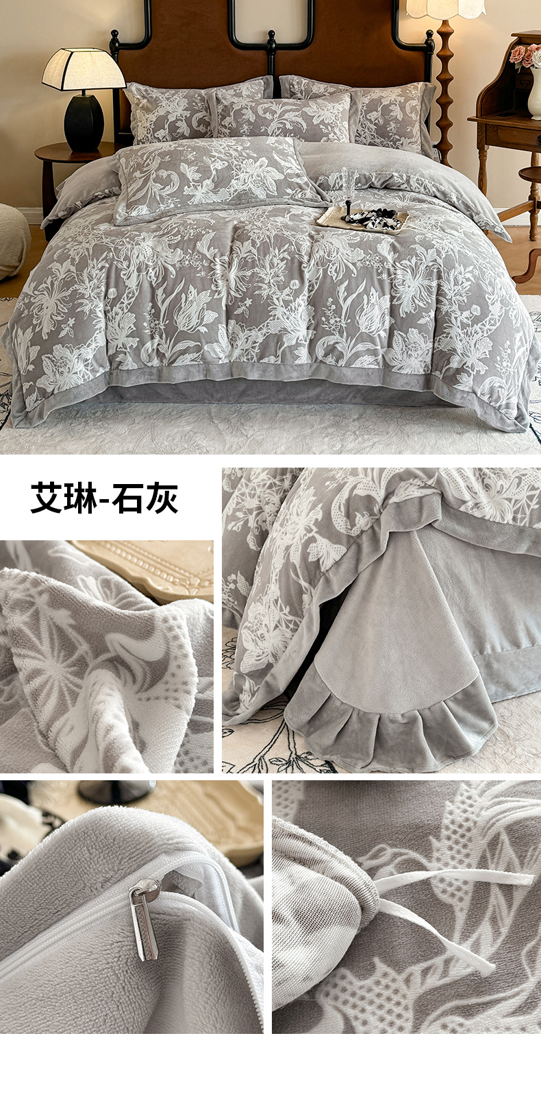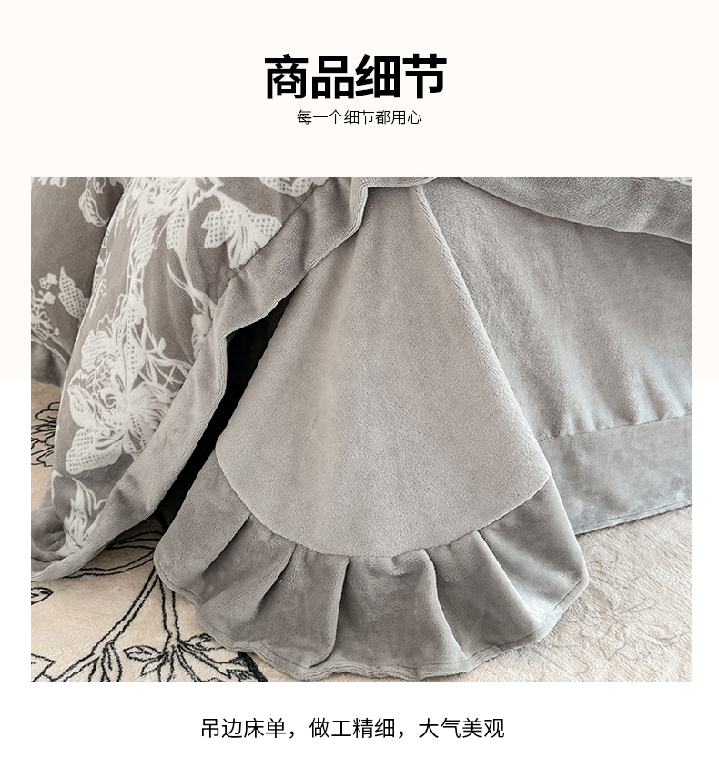 商品名称:慕晨 2024新款高克重全消光A类雕花牛奶绒法式风大宽边拼角吊边床单四件套-风格二 艾琳-石灰