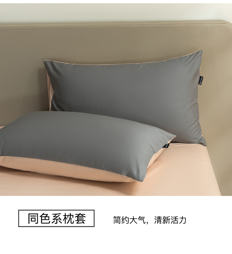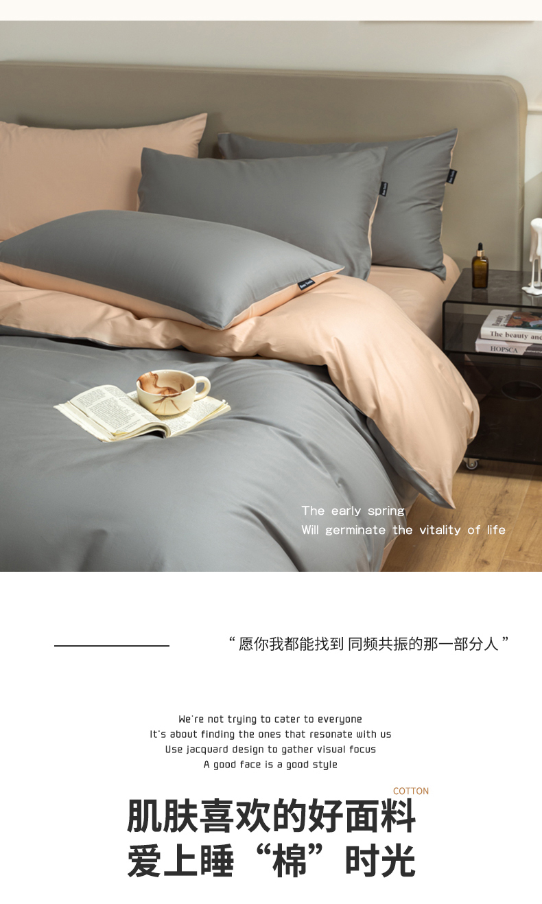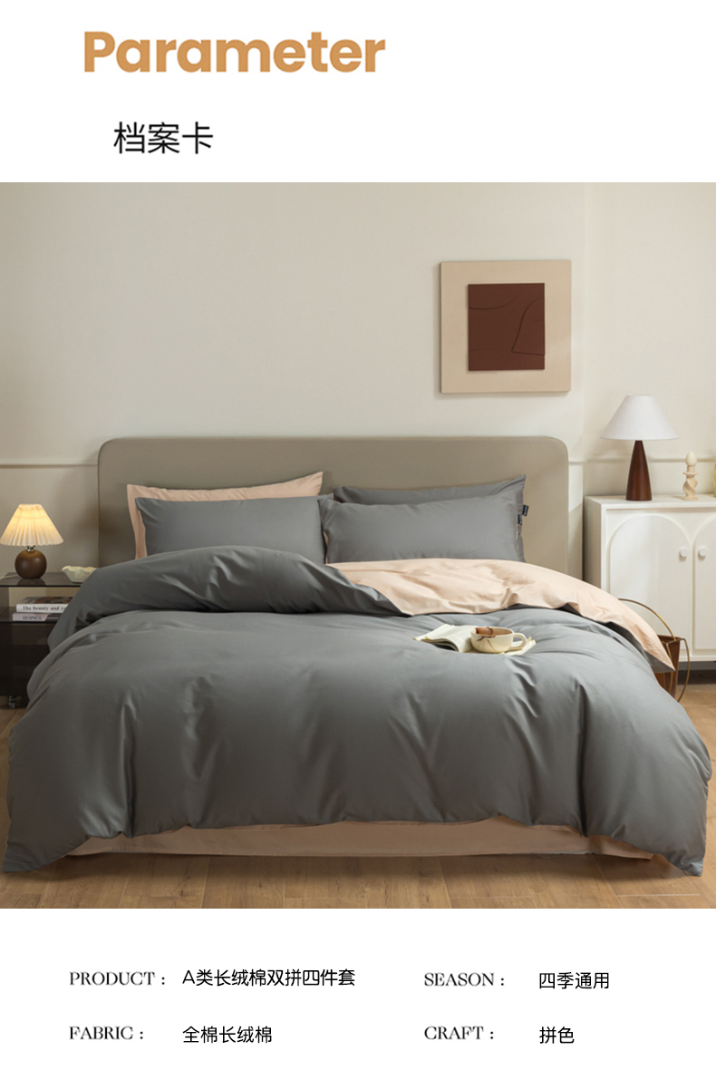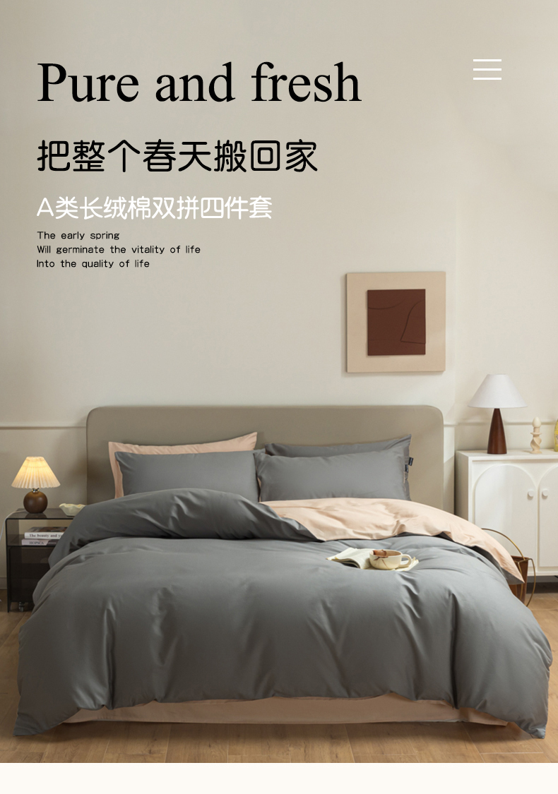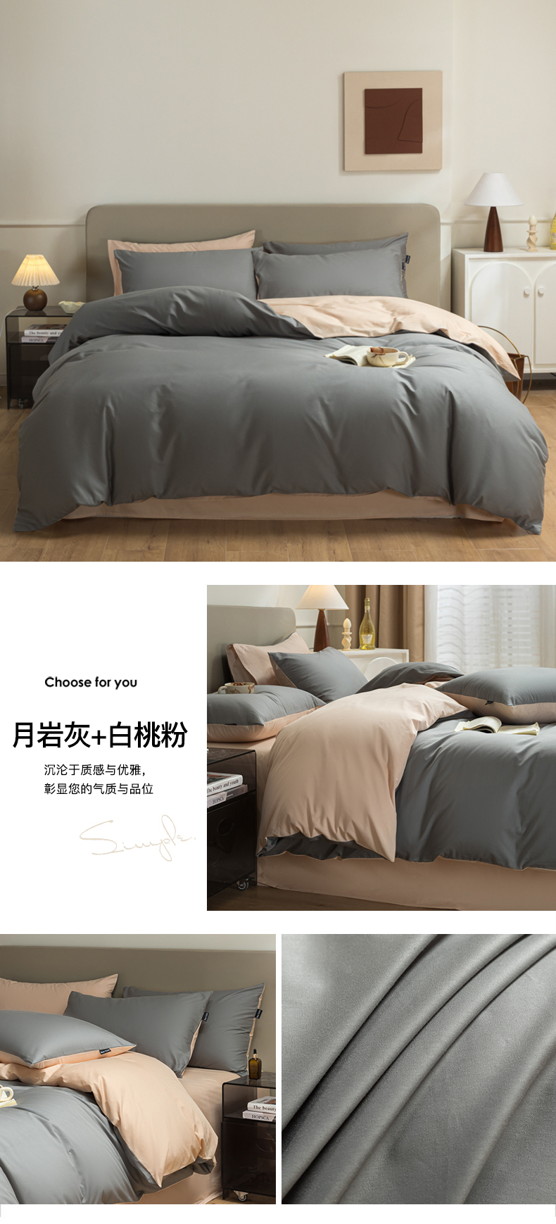 卧趣家纺 2025新品全棉A类长绒棉纯色双拼四件套 月岩灰+白桃粉