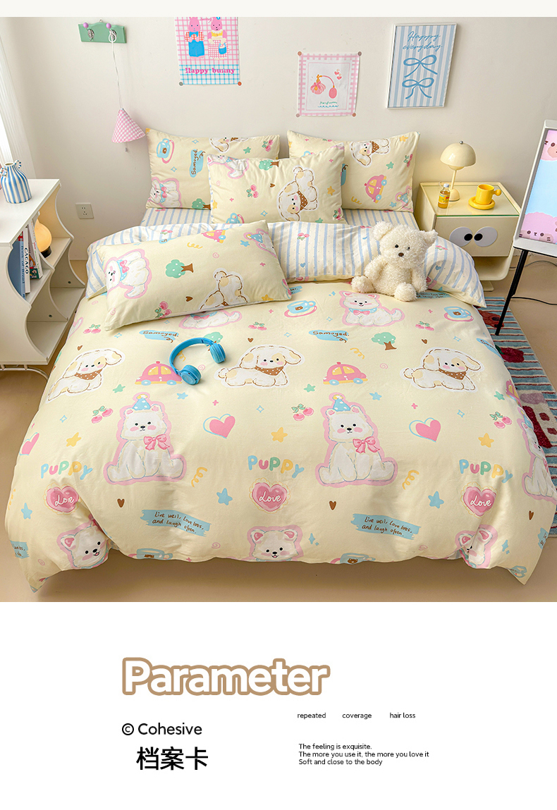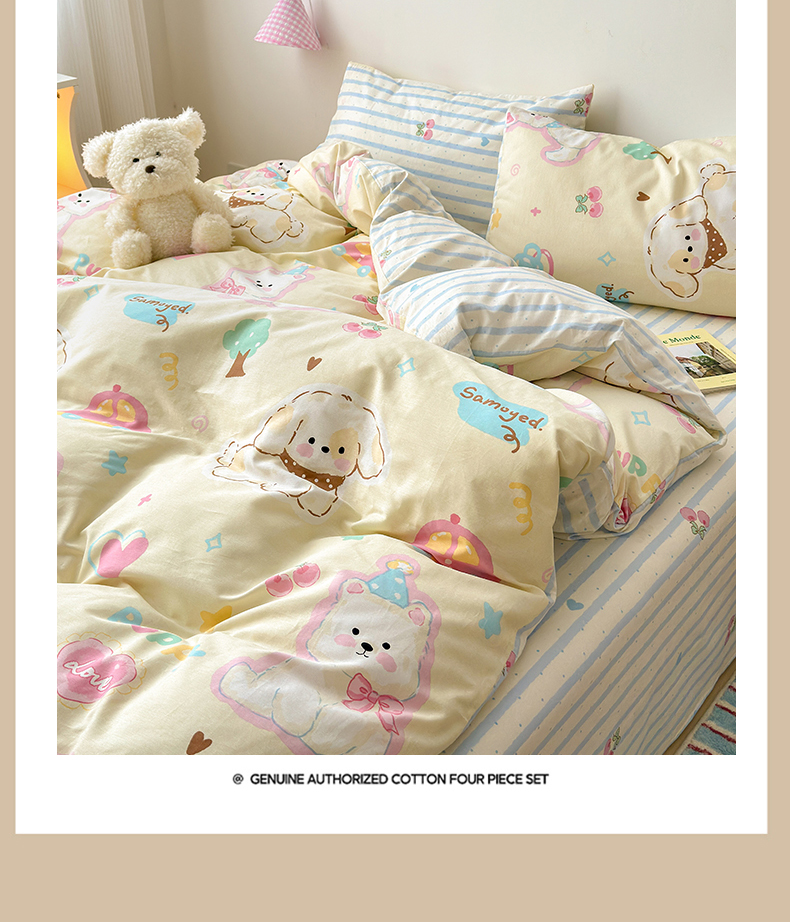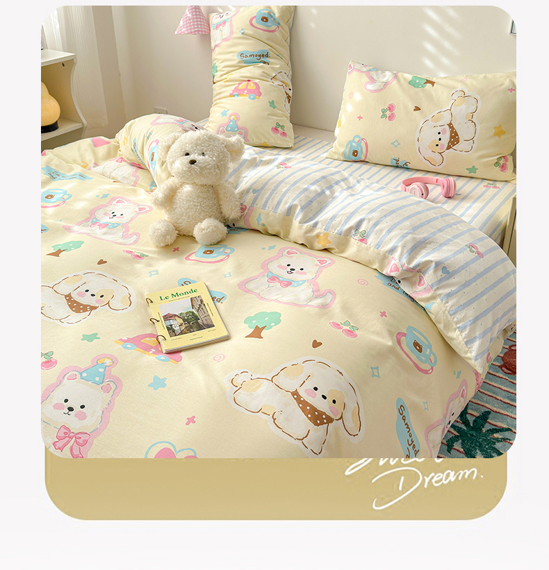 (总)曼之夏 2025新款全棉纯棉40支学生季卡通印花四件套,椰蓝小腊肠,茶茶狗,格子猫,嗨皮狗,开心屋,可爱多,可可汪,玛奇朵,奶昔小熊,泡芙小象,曲奇小狗,趣味熊,甜甜圈,甜心猫咪,童画,小狗日记,樱桃熊仔