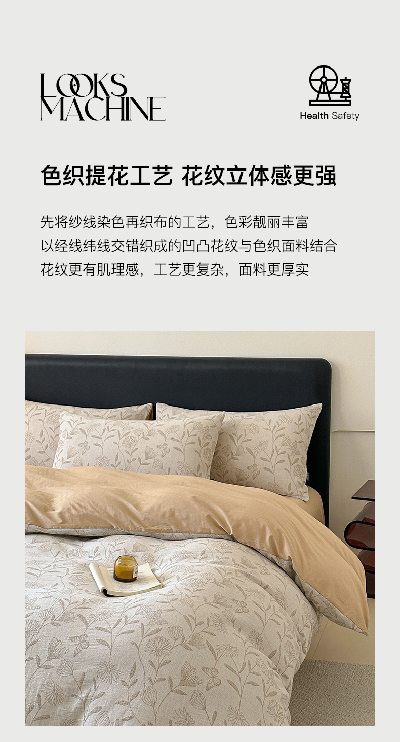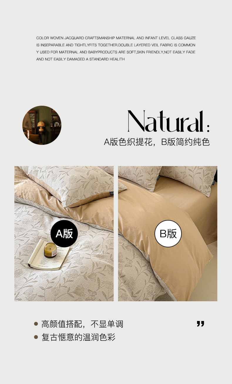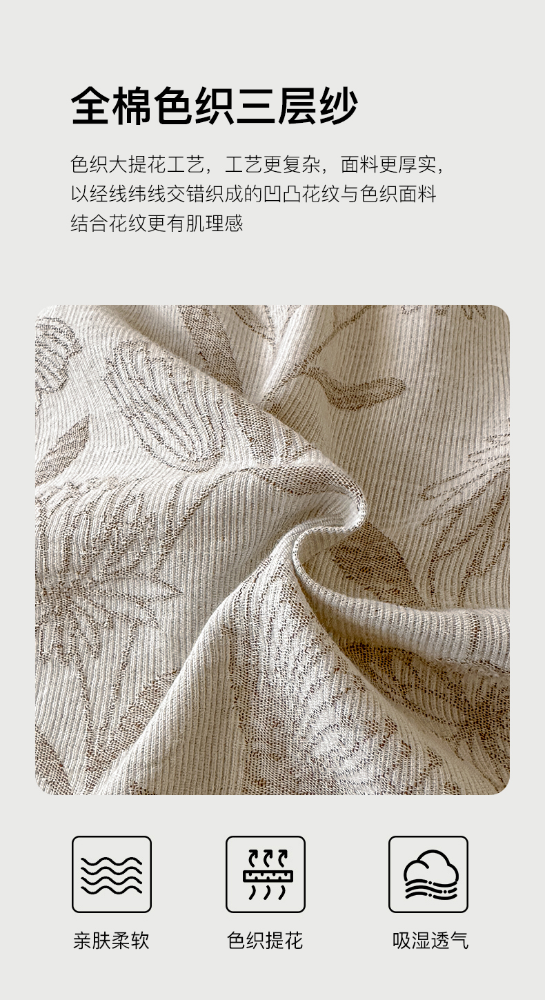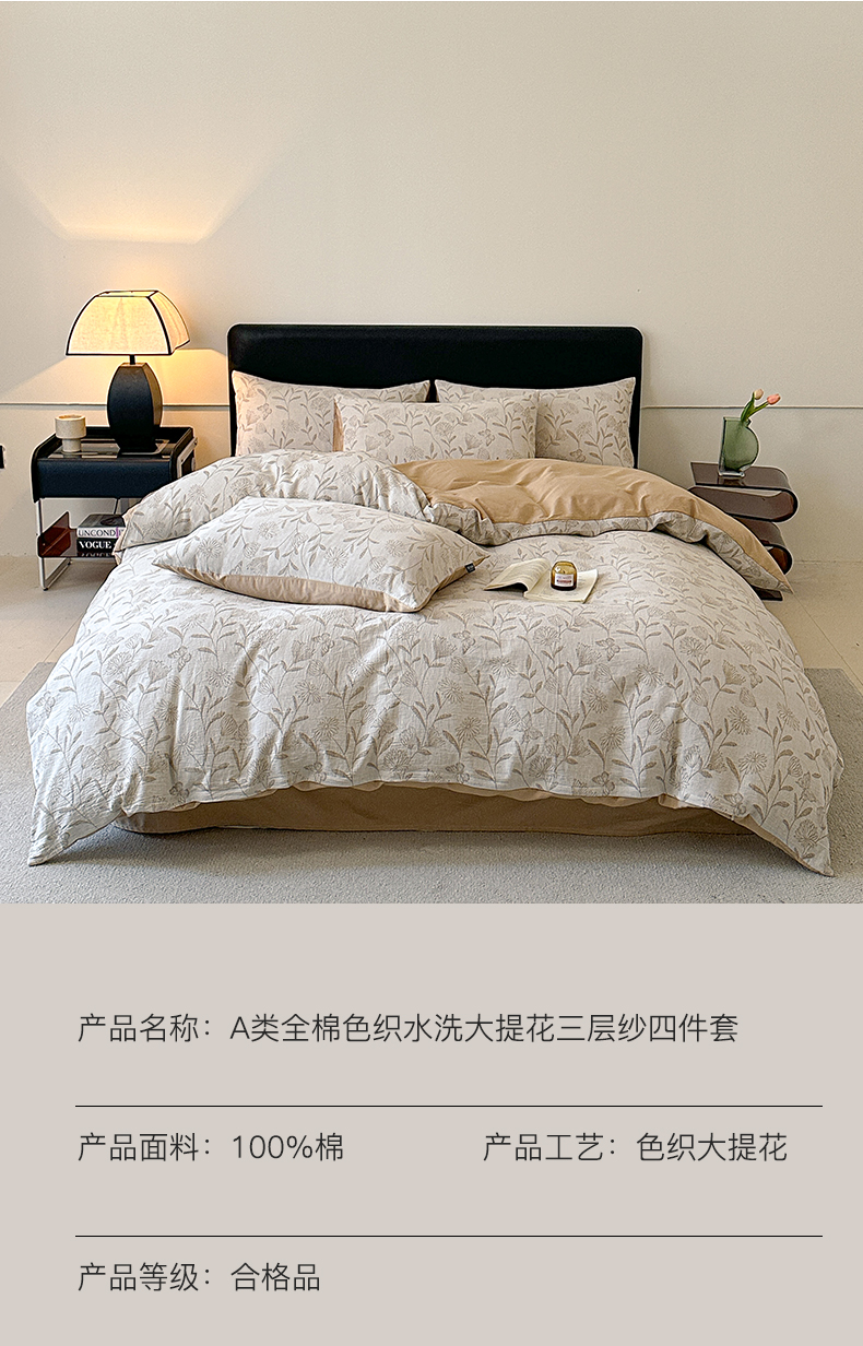 商品名称:格里芬家纺 2025新款全棉色织水洗三层纱提花纯棉四件套 流风余韵-咖