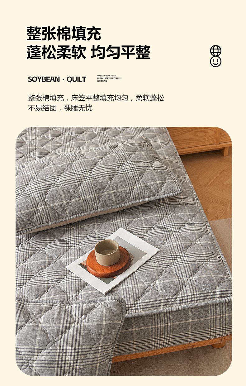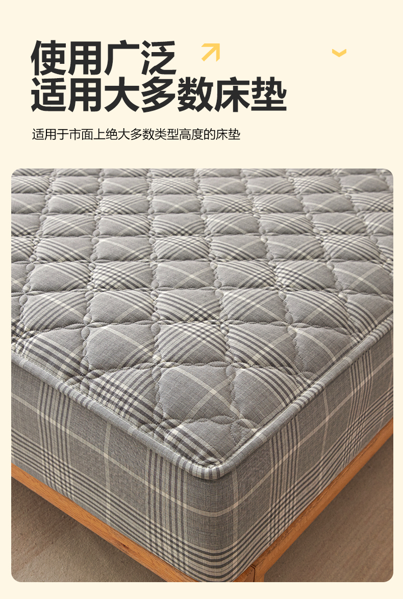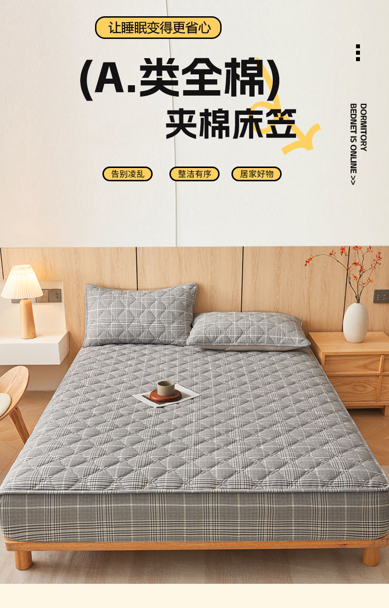 (总)糯米猪家纺 2023新款亲肤棉六面全包夹棉床笠--时尚格,水蓝,深蓝,灰色,白色,米色,粉玉