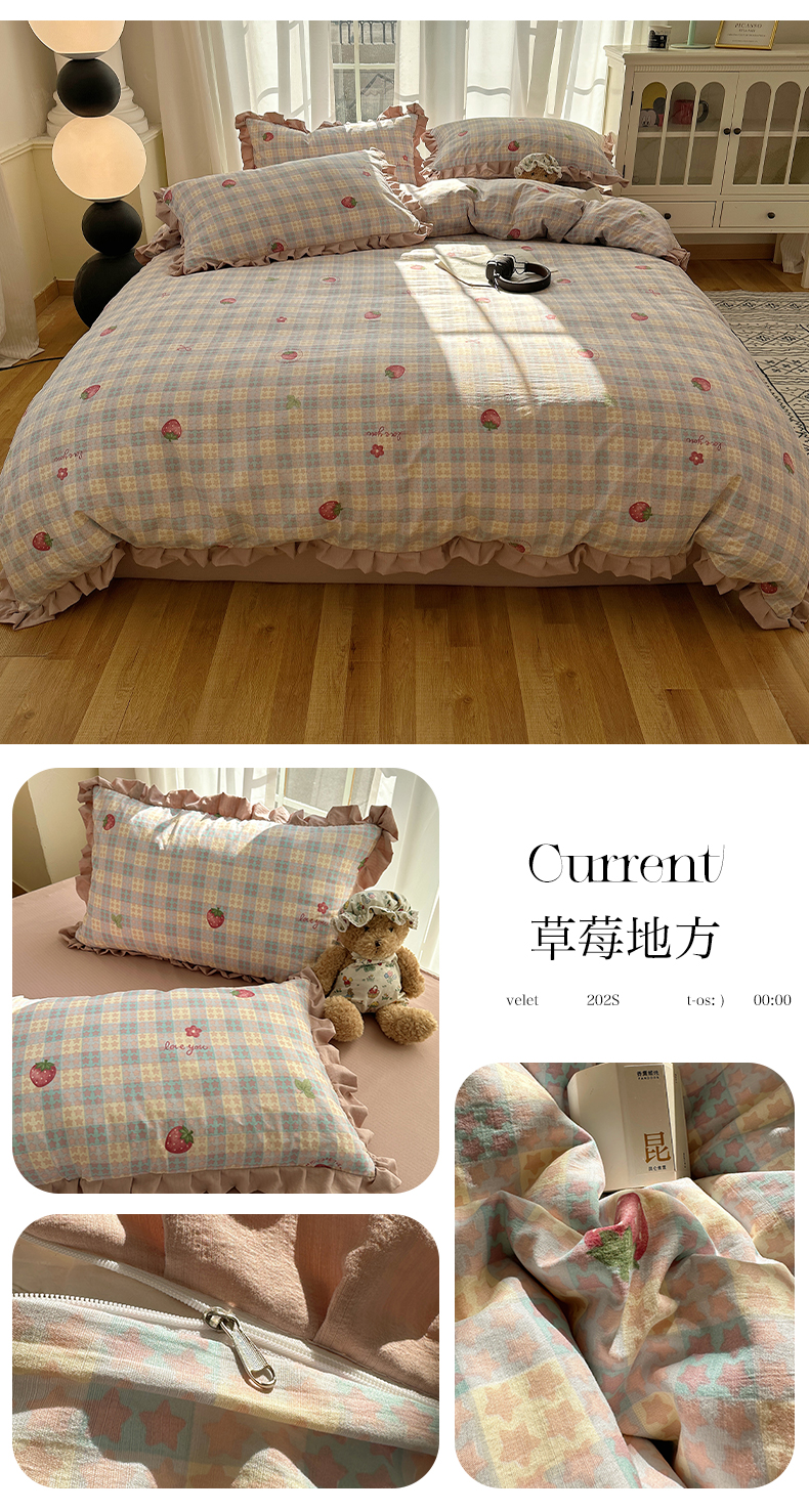 商品名称:韩都2025黑花边双层纱水洗针织棉韩版公主风四件套 草莓地方