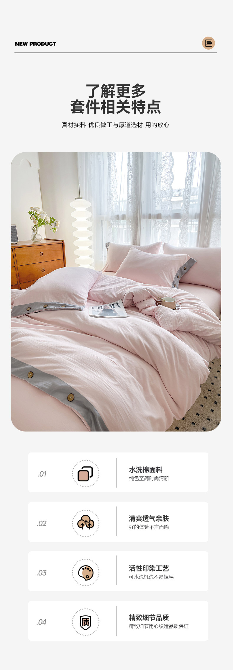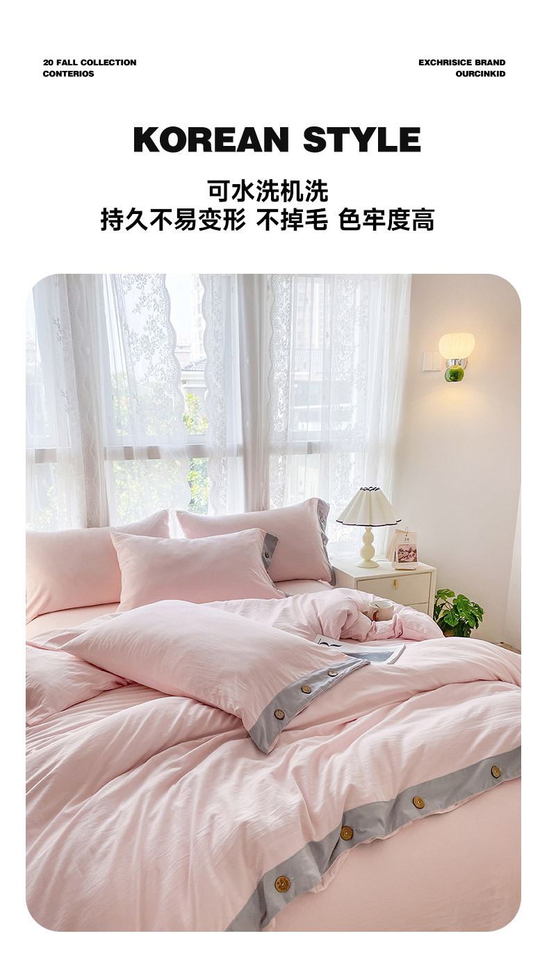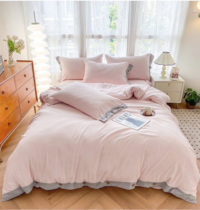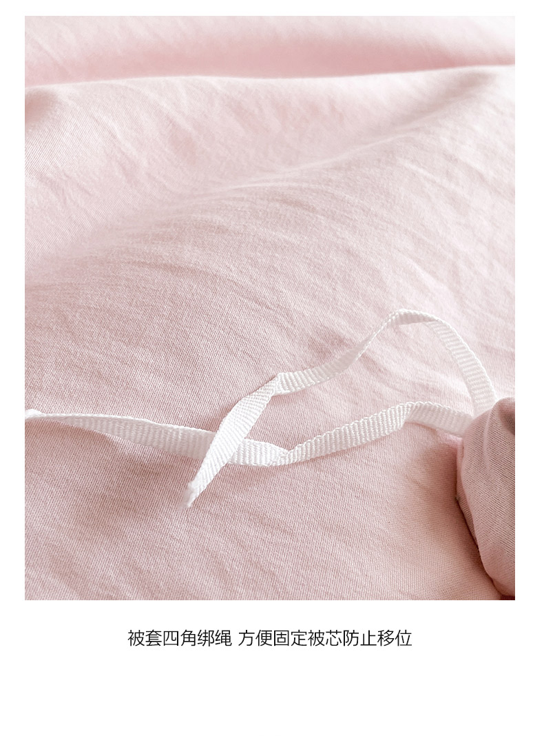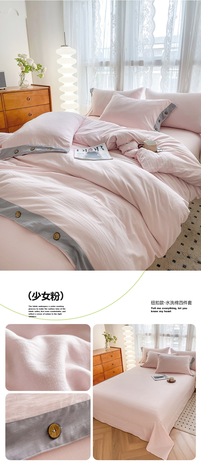 当前位置: 91家纺网 > 商品网购 > 床品套件 > 四件套 > 水洗棉四件套 > 库里梦家纺 2025新款贴边纽扣式纯色水洗棉四件套 贴边纽扣-少女粉