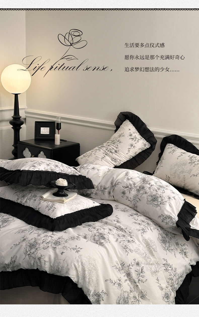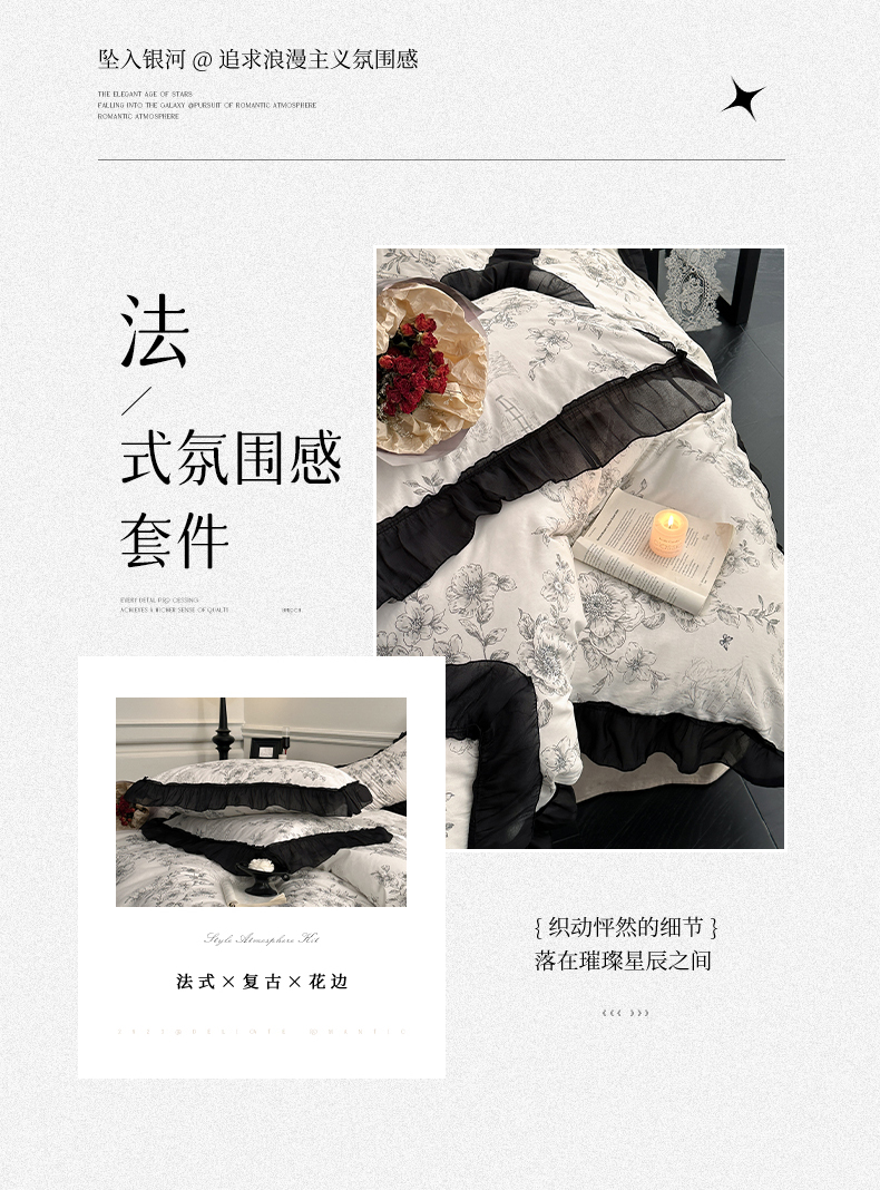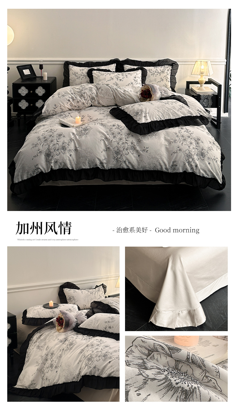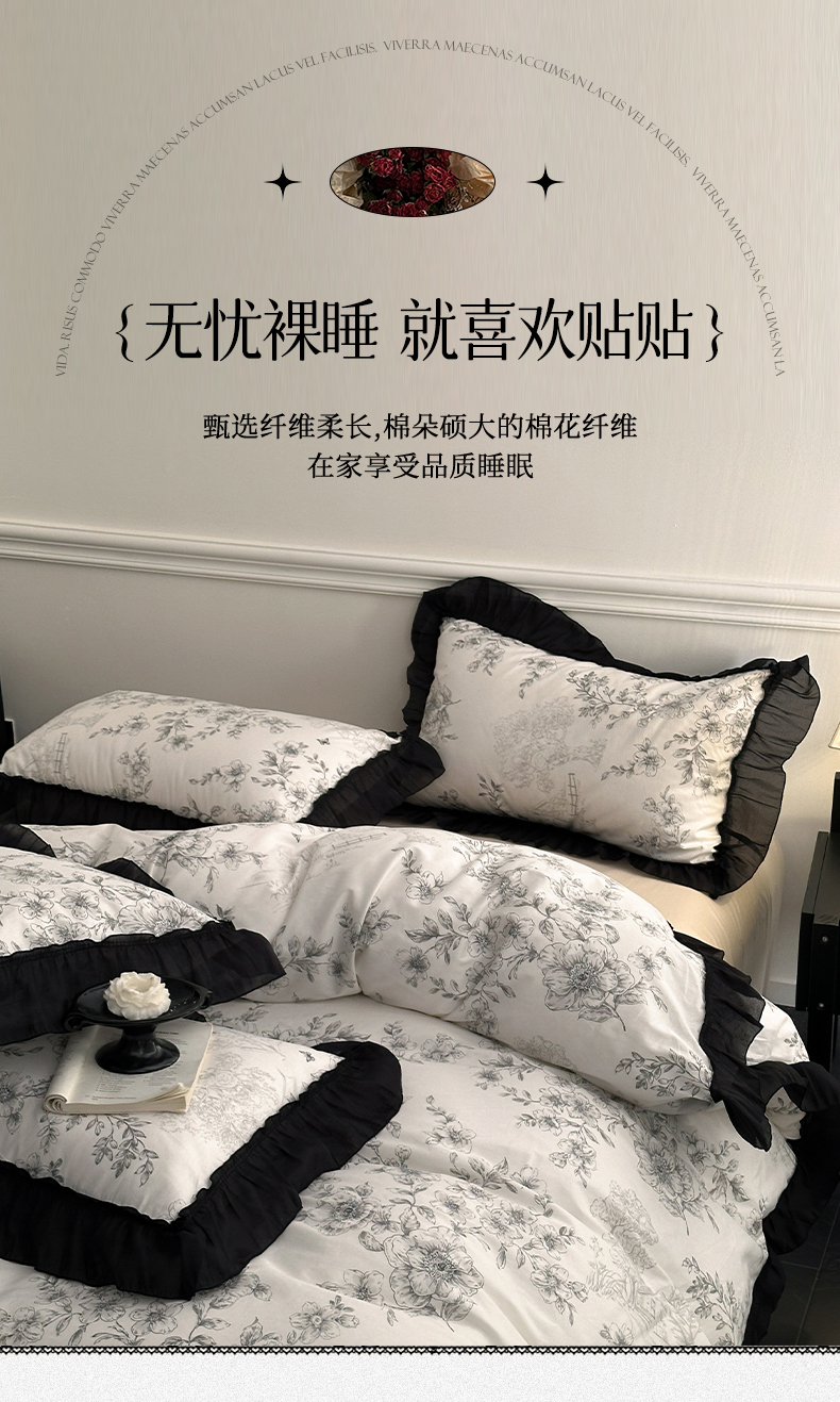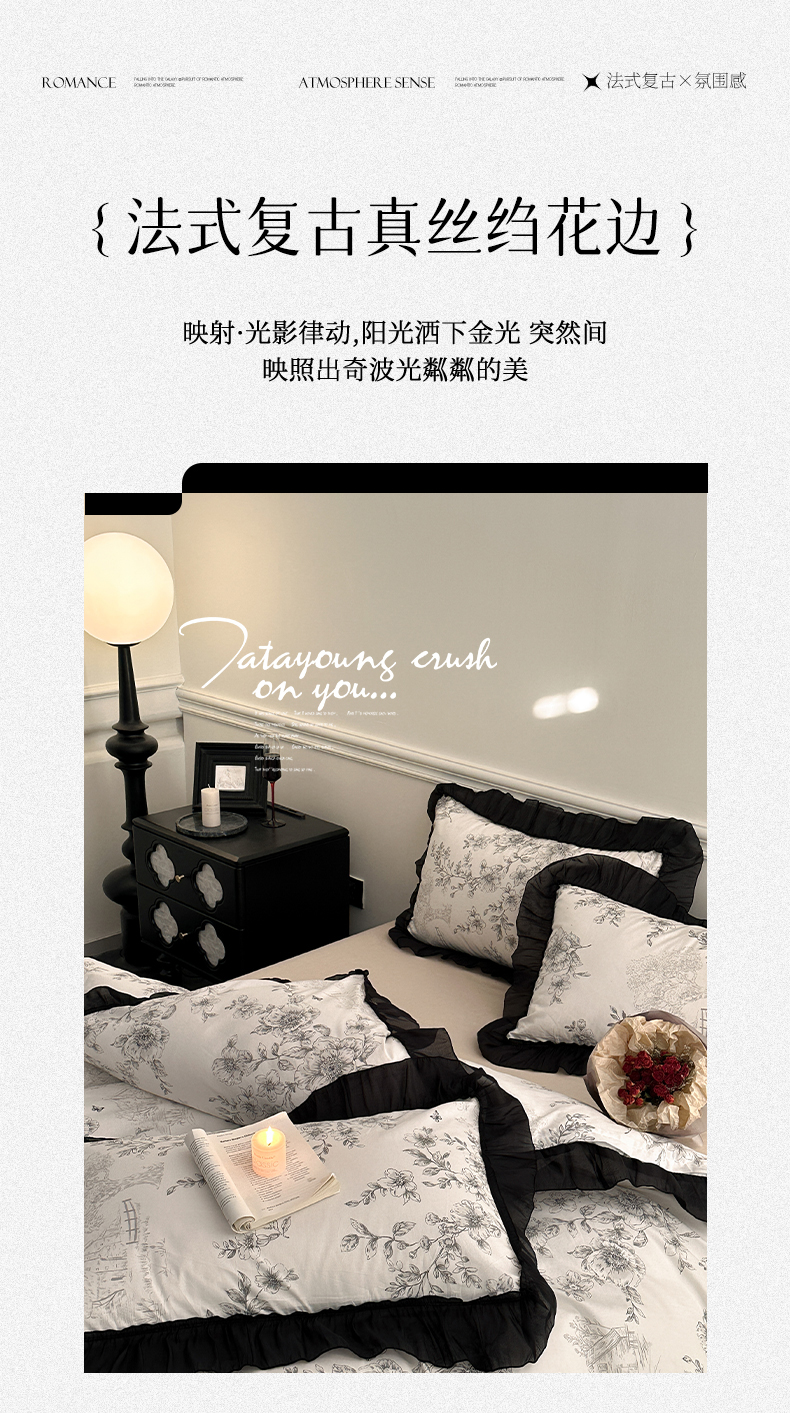当前位置: 91家纺网 > 商品网购 > 床品套件 > 四件套 > 全棉普通四件套 > 蓝邻家纺 2025年新款全棉法式复古真丝绉花边四件套系列 加州风情