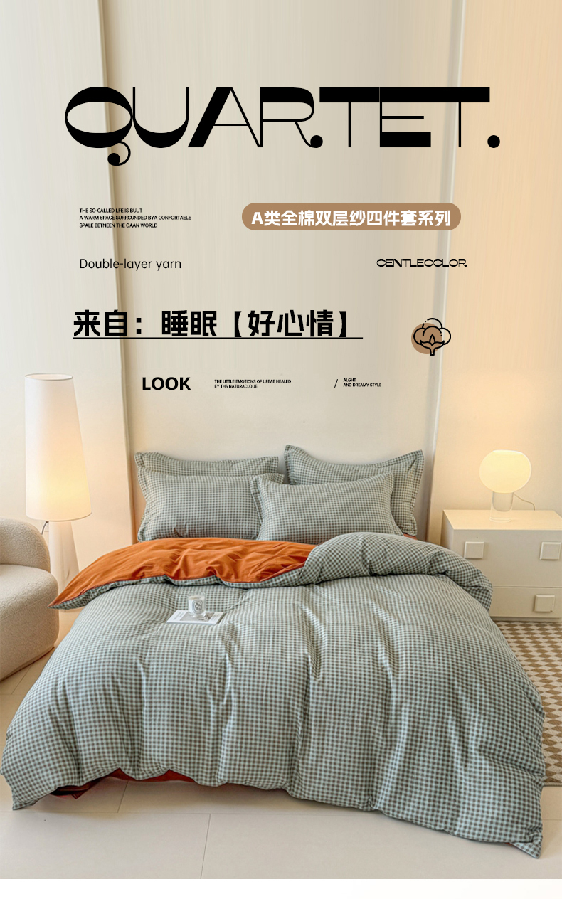 喜四方 2025新款全棉A类母婴级抗菌全棉双层纱四件套 牛津绅士-绿