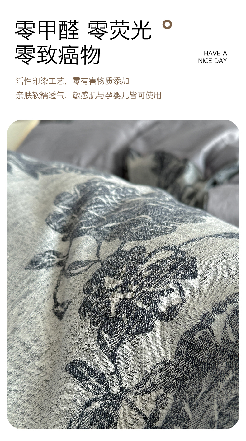 商品名称:蓝米卡夫 2025新品-60S全棉色织大提花四件套(礼盒包装) 蔓春-深蓝