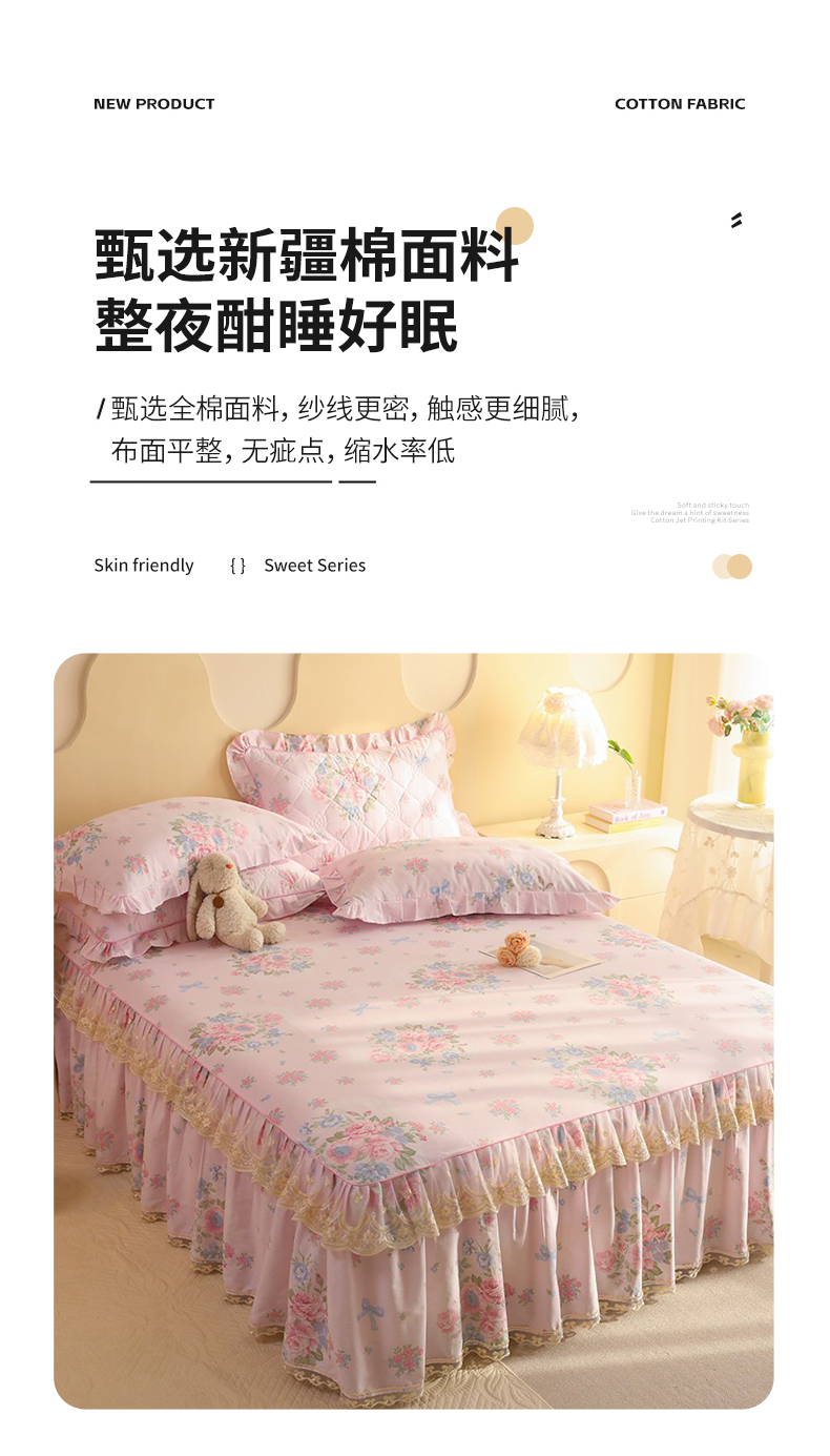 (总)美达家纺 2025新款全棉纯棉AB版蕾丝小花边单层床裙四件套,解语花,南湘,沁雨花叶,悦棠