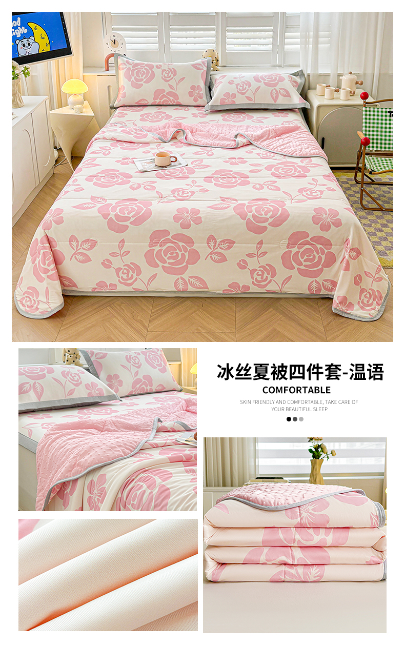 • 91家纺网 家纺一手货源 找家纺 雯豆2025夏季新品冰丝碳光凉席+凉感丝印花夏被四件套卡通小清新绑带席子四件套 冰丝夏被四件套-温语