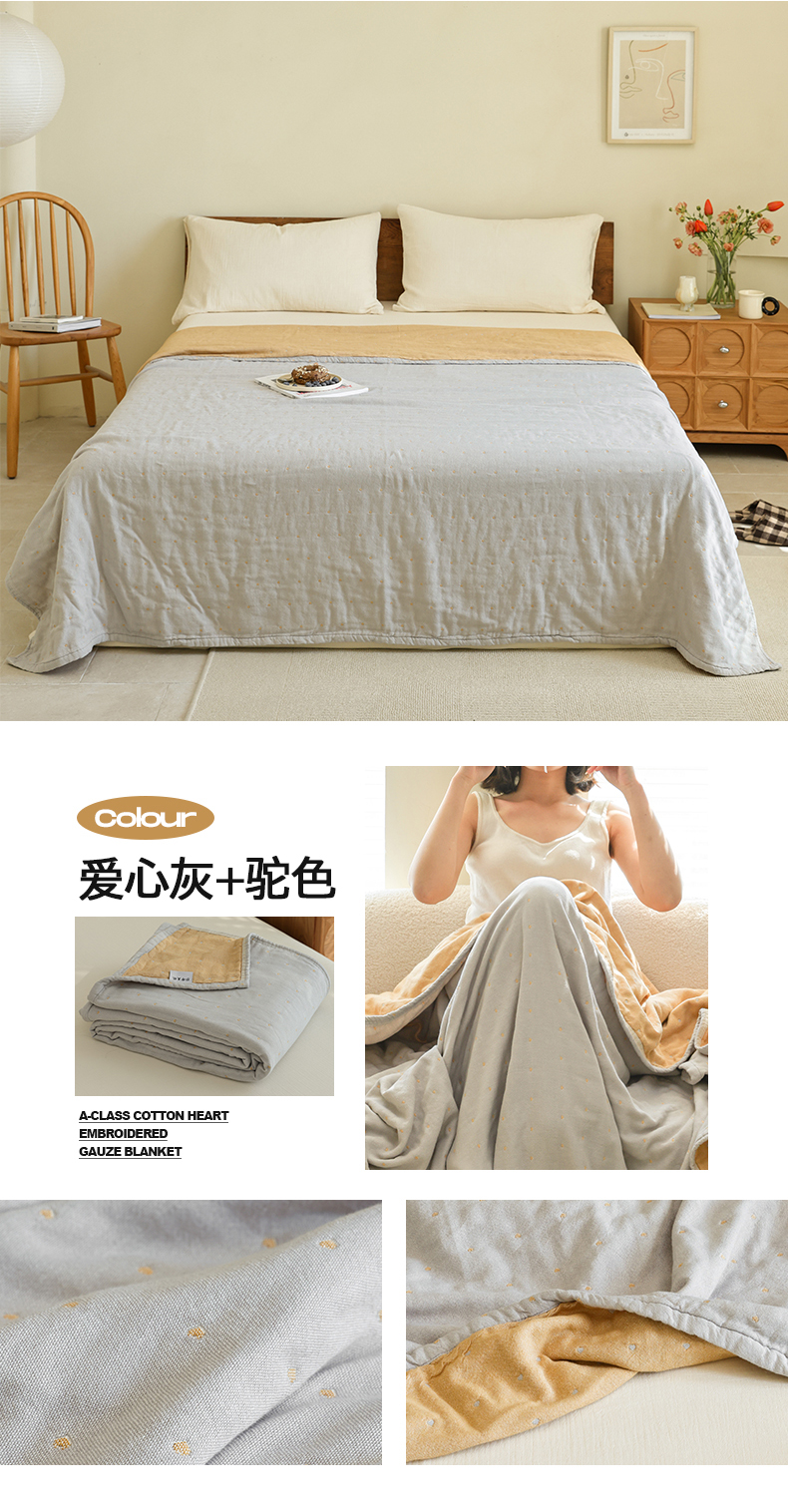 商品名称:雯雨2025新款A类全棉四层爱心刺绣纱布毛巾被 爱心灰+驼色