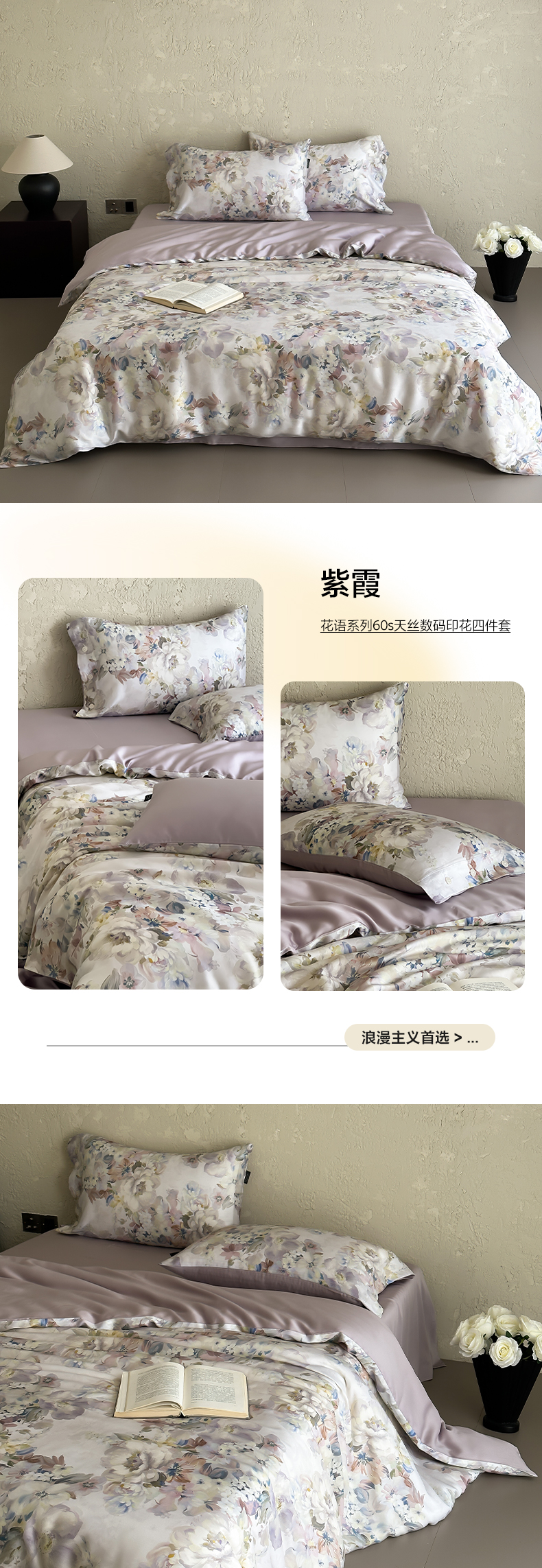 商品名称:三味舒屋 2025新款花语系列60s天丝数码印花四件套 紫霞