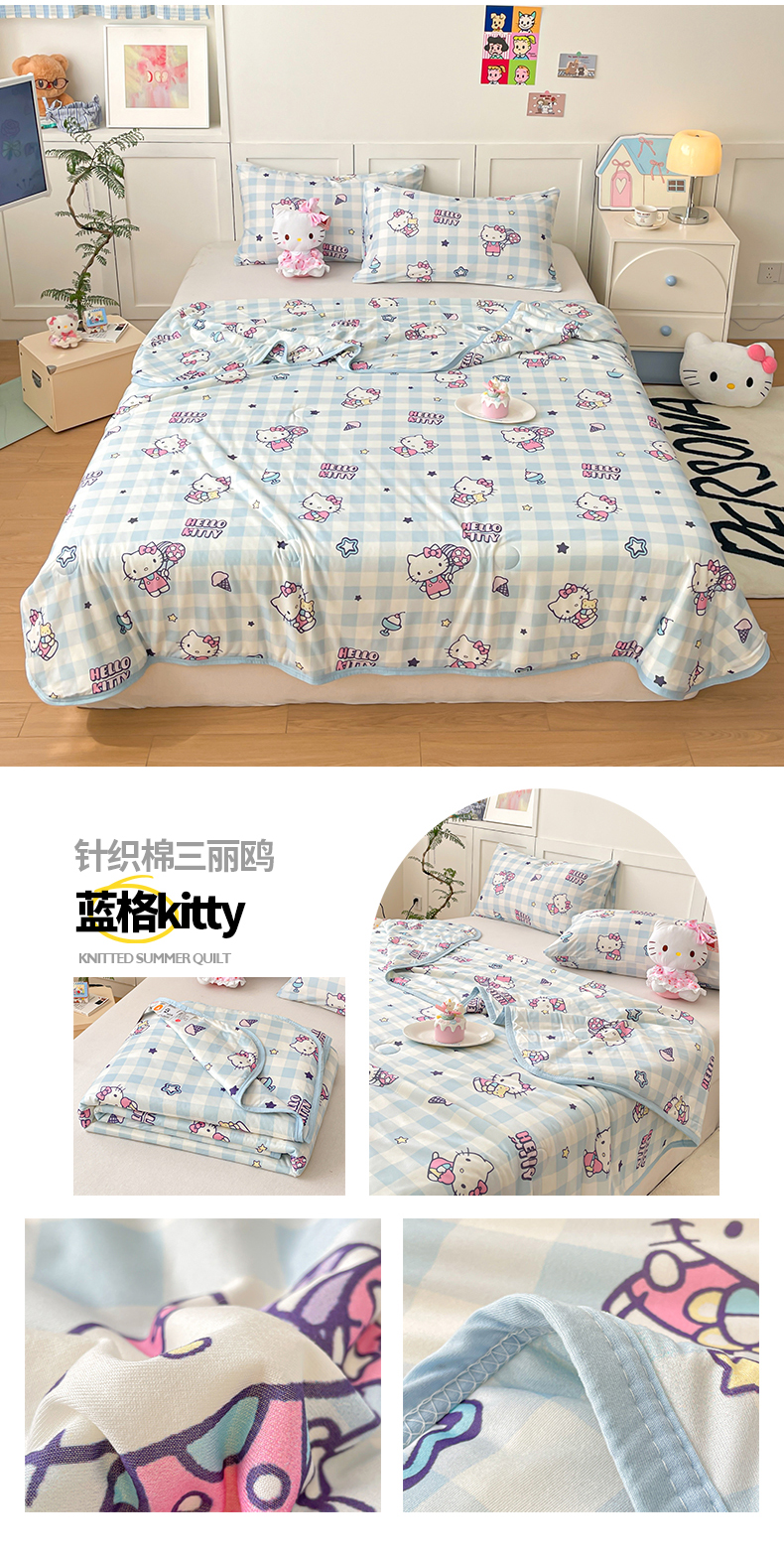 • 91家纺网 家纺一手货源 找家纺 金爱家2025新款A类三丽鸥正版授权高品质牛奶丝软糯针织棉大豆夏被系列详情 针织棉三丽鸥-蓝格kitty