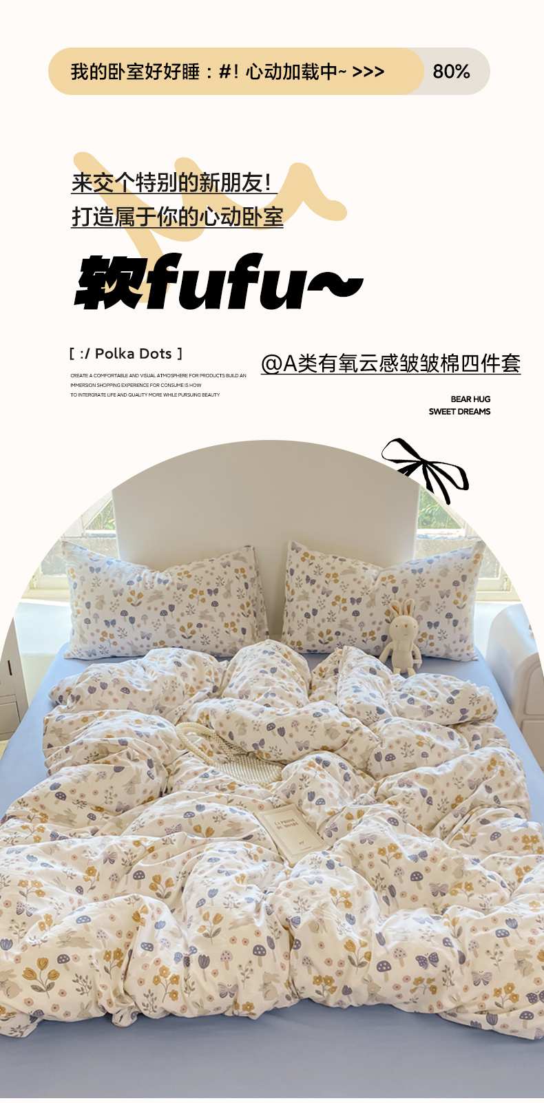 (总)【提供买家秀】2025直播云感皱皱棉四件套水洗棉简约风小碎花被套床笠三件套-叠拍图,一帘幽梦,波点白,蛋糕熊,繁花兔,繁华,馥芮白,馥芮蓝,好事橙双,玫瑰庄园,叛逃小狗,蜻蜓点水,同心结,童话森林,小桃糯糯,幸运狗,组合