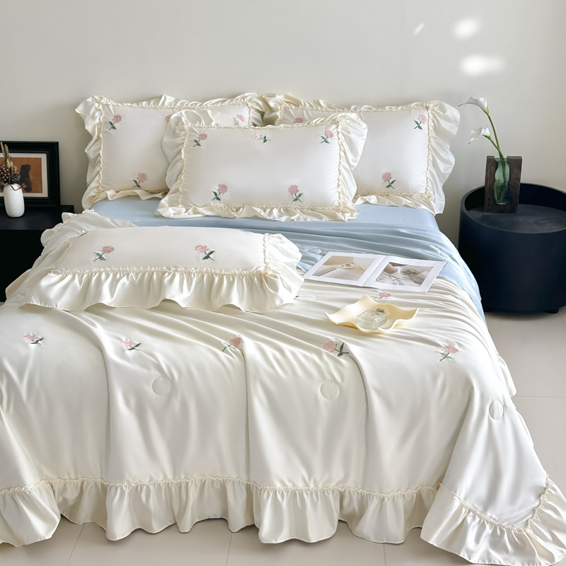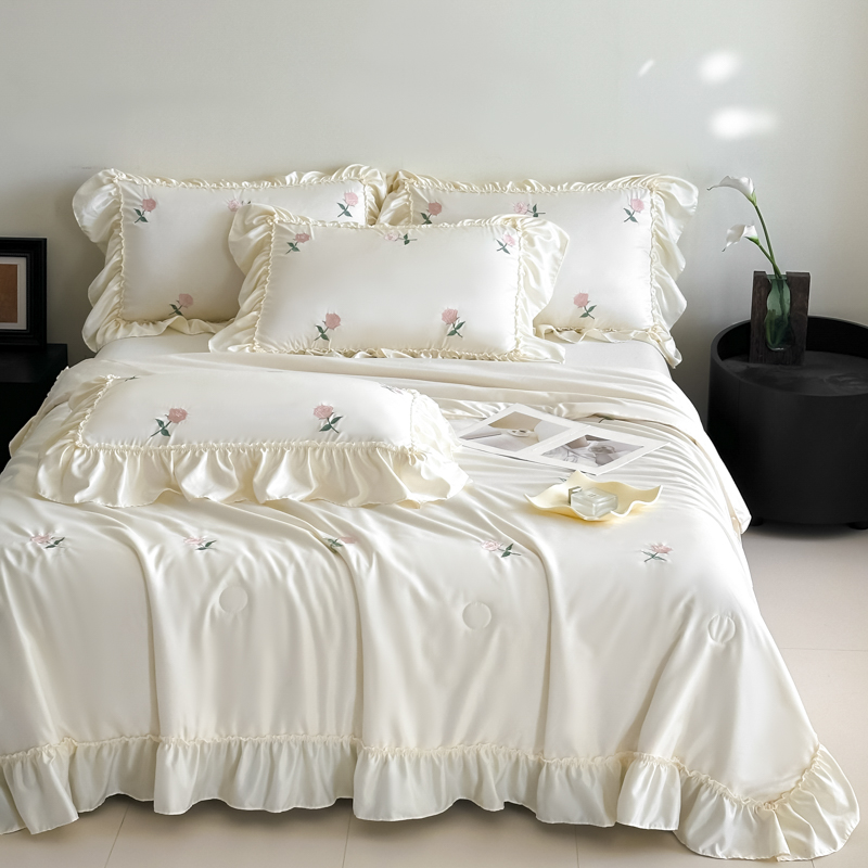 商品名称:红嘴企鹅 2025新款冰丝贴边花边夏被夏凉被空调被四件套 冰丝玫瑰花-粉