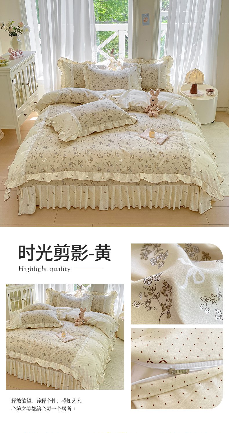 商品名称:皇谱家纺 2025新款A类有氧木棉床裙四件套 时光剪影-黄