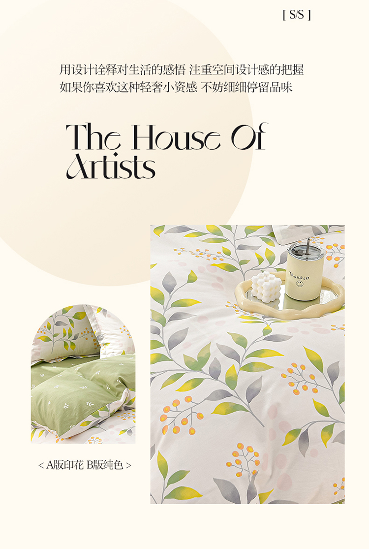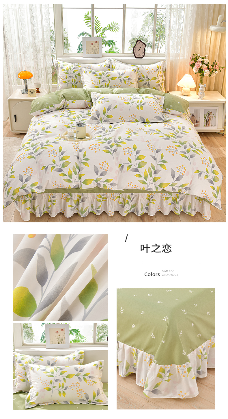 绘萱家居 2025新款100%全棉床裙款斜纹印花四件套 叶之恋