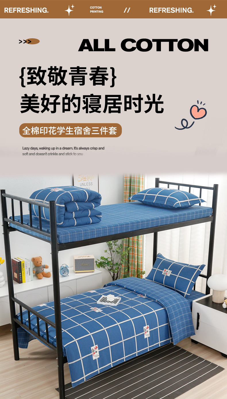 当前位置: 91家纺网 > 商品网购 > 床品套件 > 多件套 > 多件套 > 乐旗家纺 2025新款A类AB版全棉环保印花学生上下铺宿舍三件套六件套 金榜题名-蓝