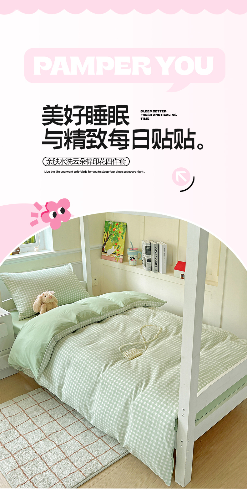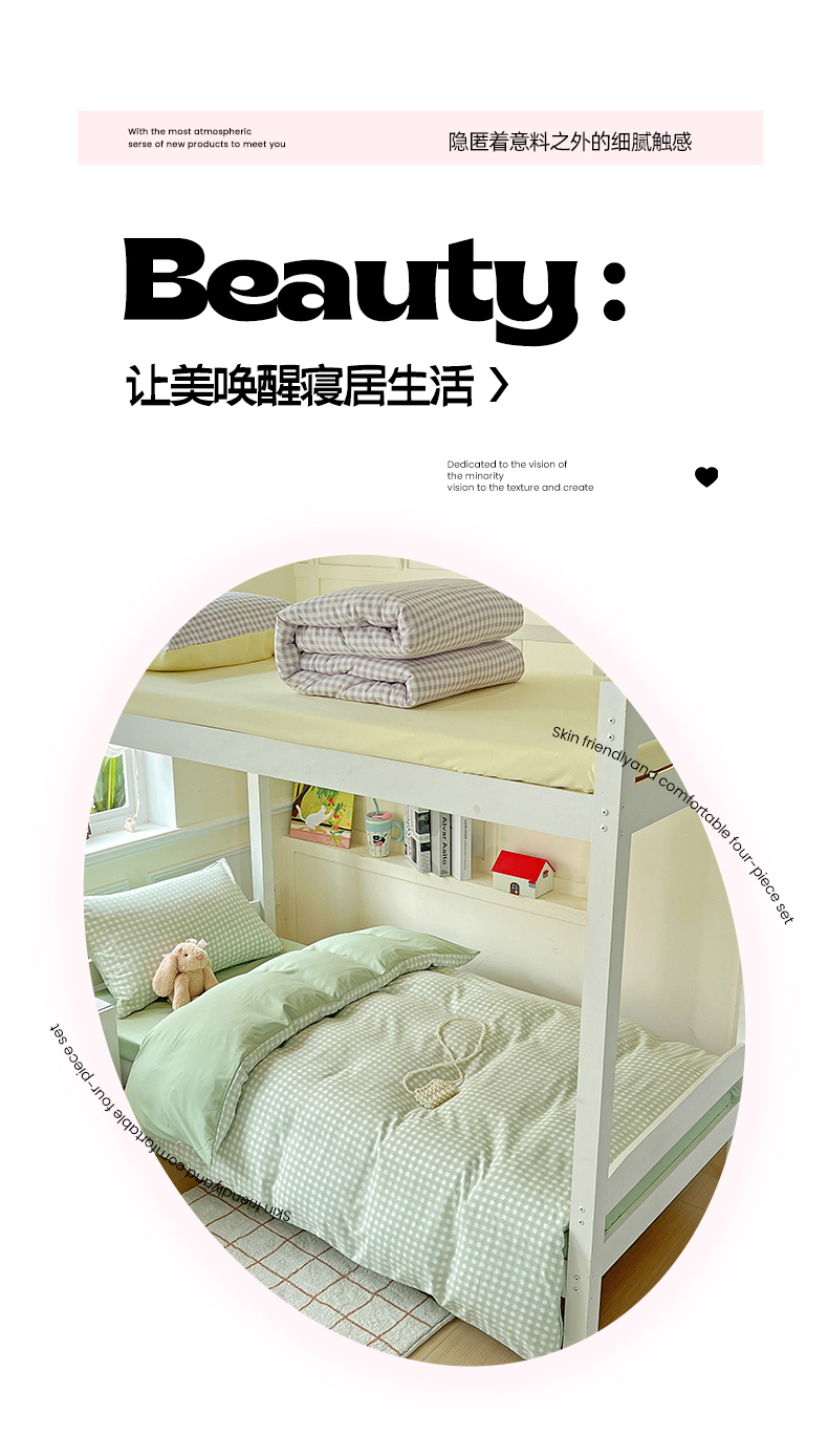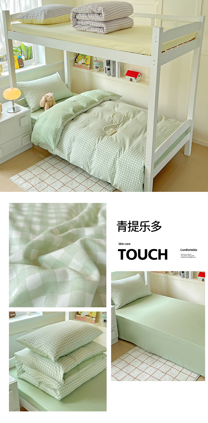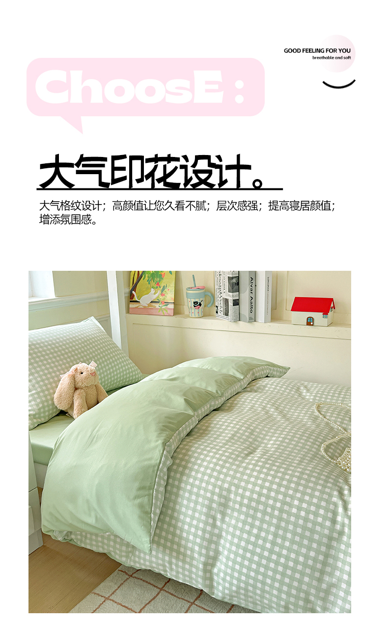 商品名称:妖妖家纺 2025新款软糯水洗棉格子学生三件套 青提乐多