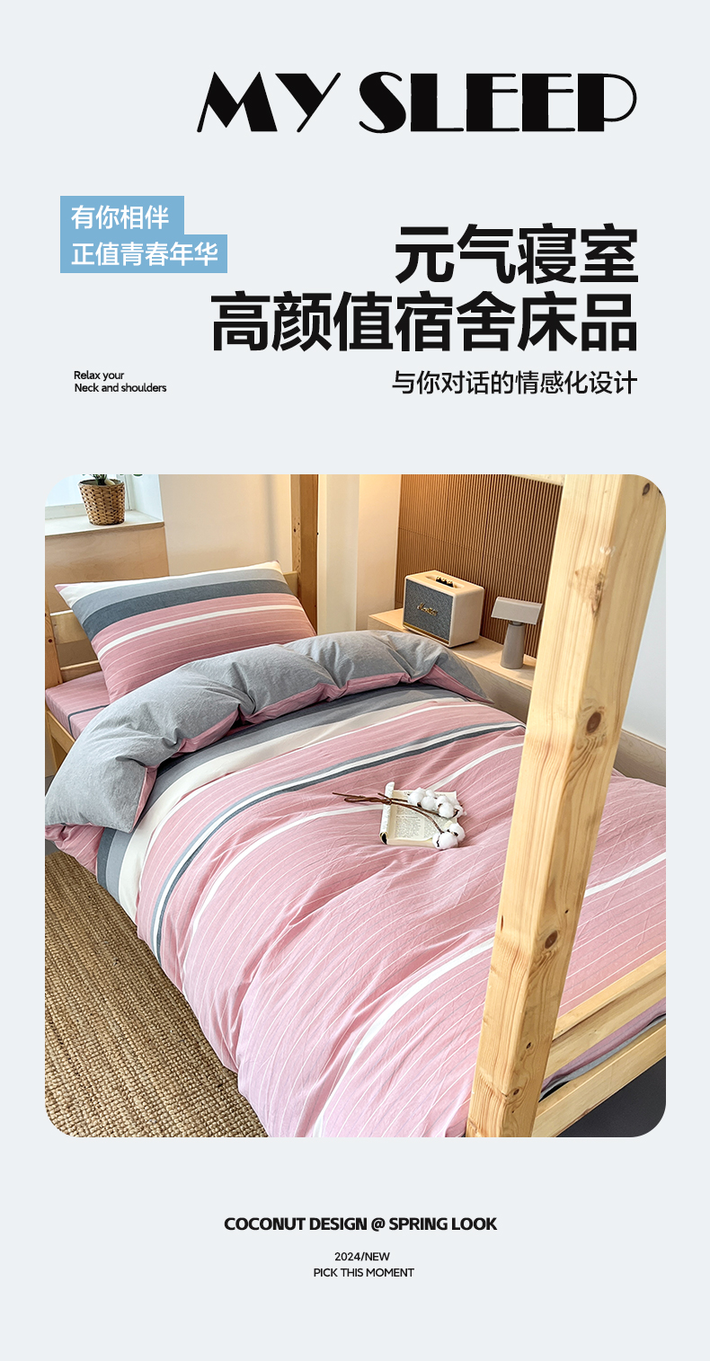 鸣升家纺 2025新款全棉纯棉色织水洗棉学生三件套 格林粉