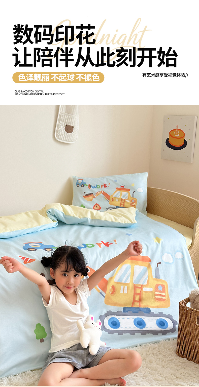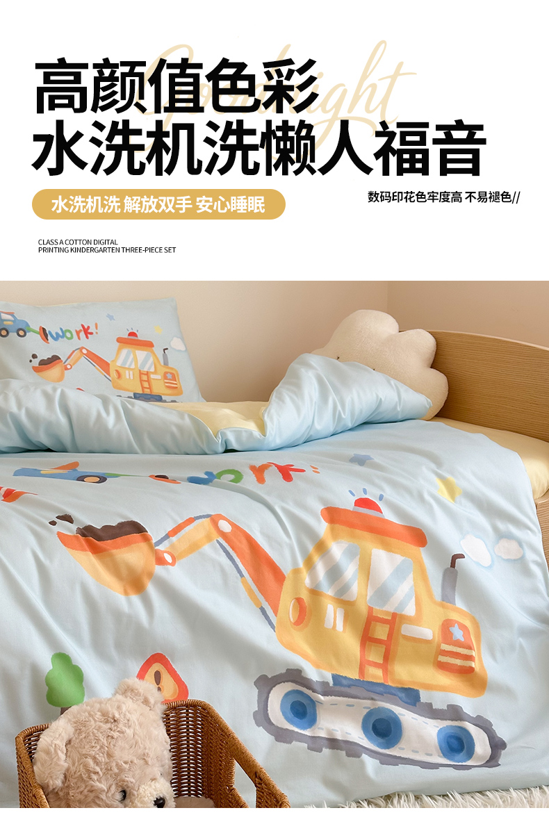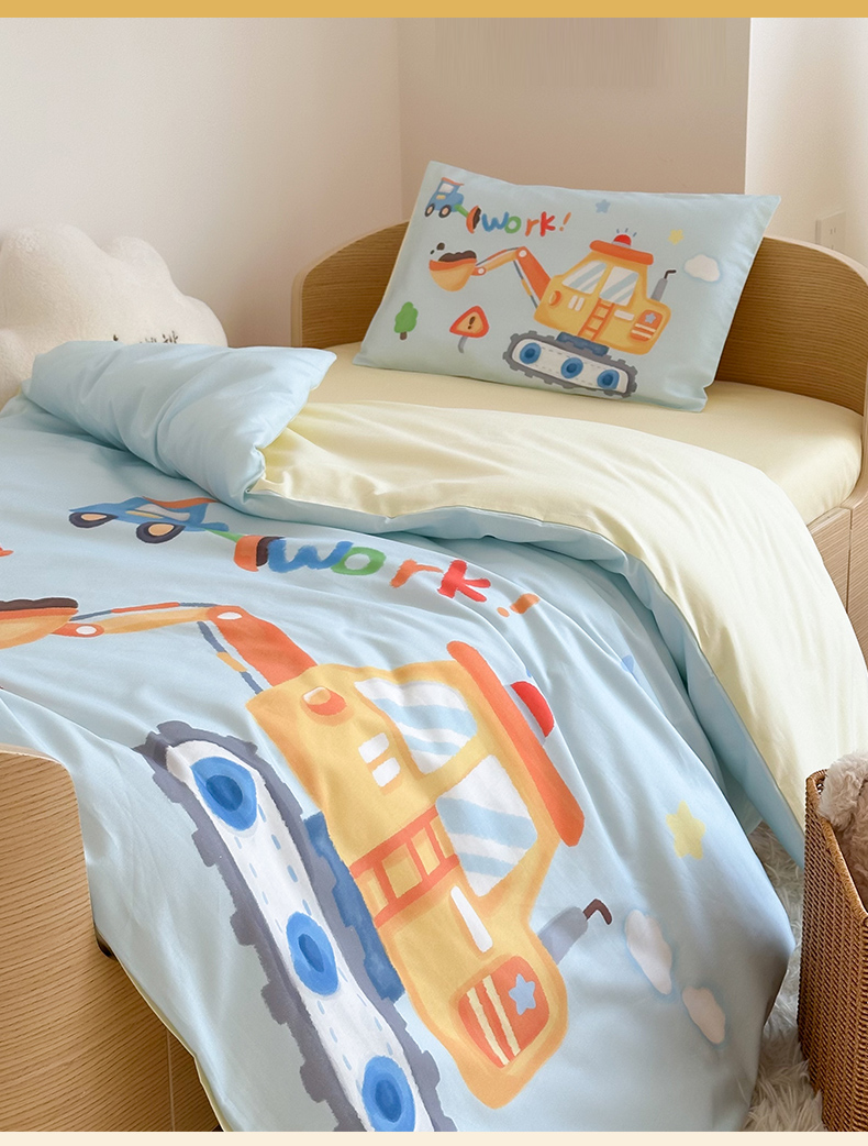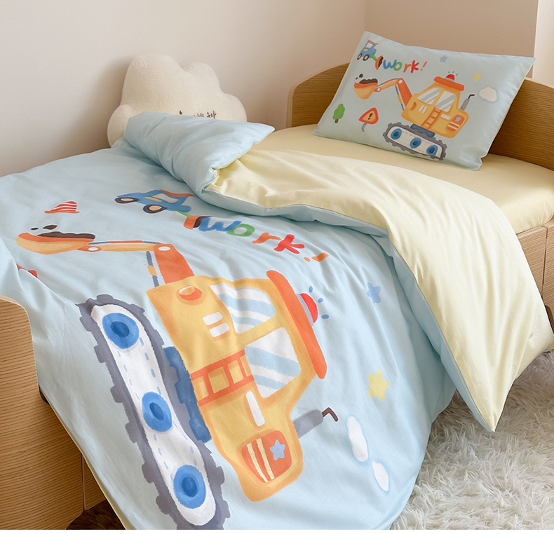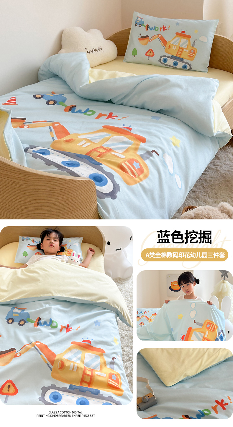当前位置: 91家纺网 > 商品网购 > 床品套件 > 四件套 > 全棉普通四件套 > 嗨生活 2025新款A类全棉纯棉40s数码印花原创大版卡通幼儿园套件 幼儿园三件套 蓝色挖掘