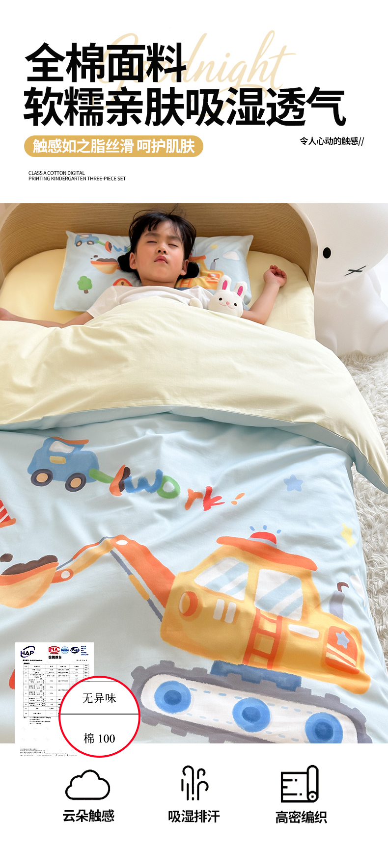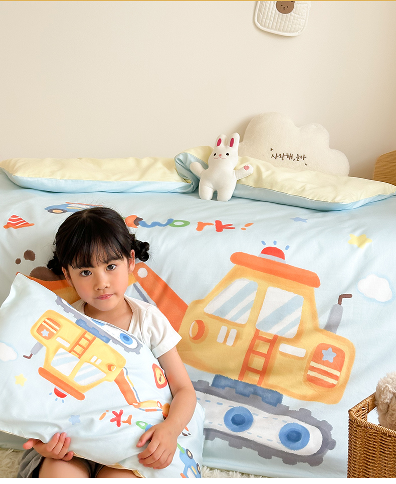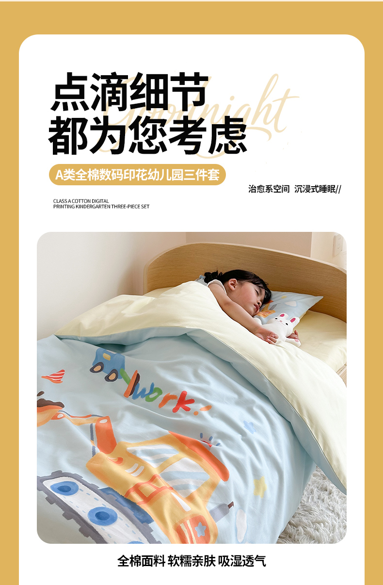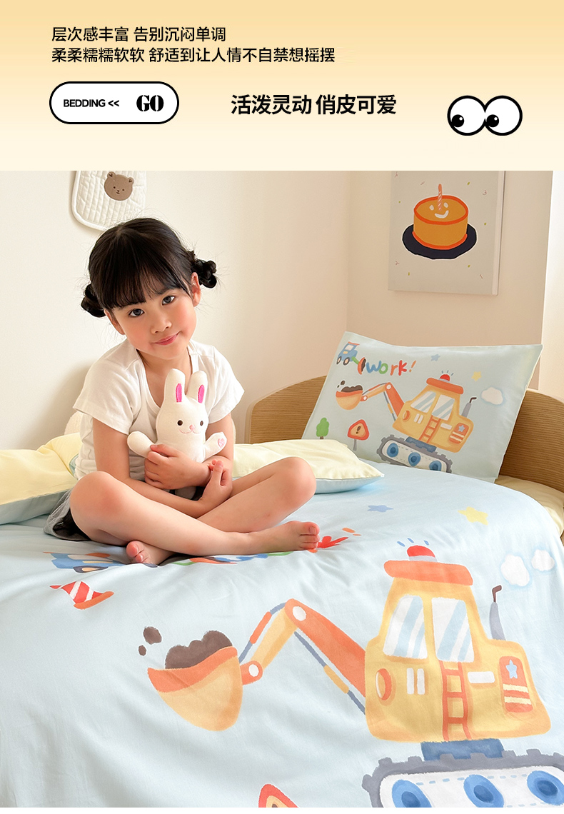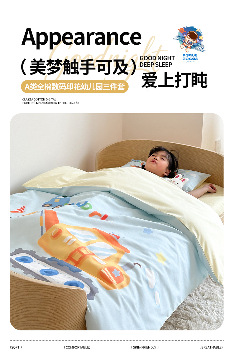 当前位置: 91家纺网 > 商品网购 > 床品套件 > 四件套 > 全棉普通四件套 > 嗨生活 2025新款A类全棉纯棉40s数码印花原创大版卡通幼儿园套件 幼儿园三件套 蓝色挖掘