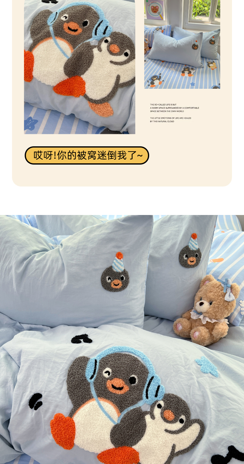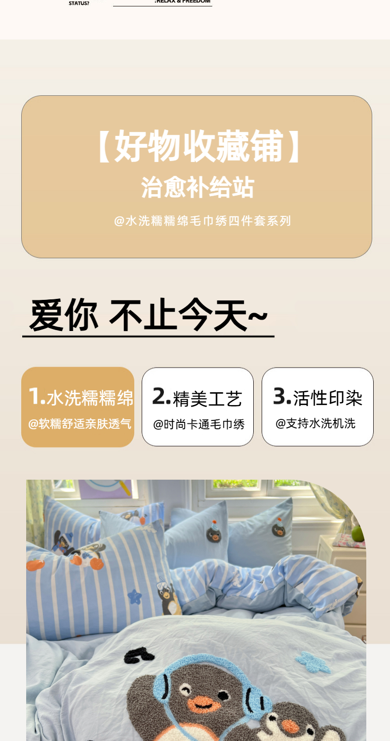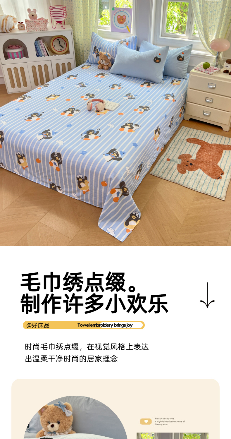 当前位置: 91家纺网 > 商品网购 > 床品套件 > 四件套 > 毛巾绣四件套 > 优尚佳生活馆 2025新款水洗棉印花毛巾绣四件套【提供买家秀】 音乐企鹅