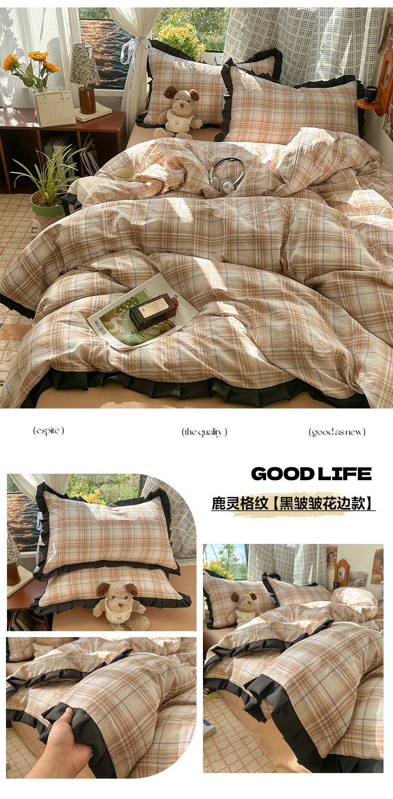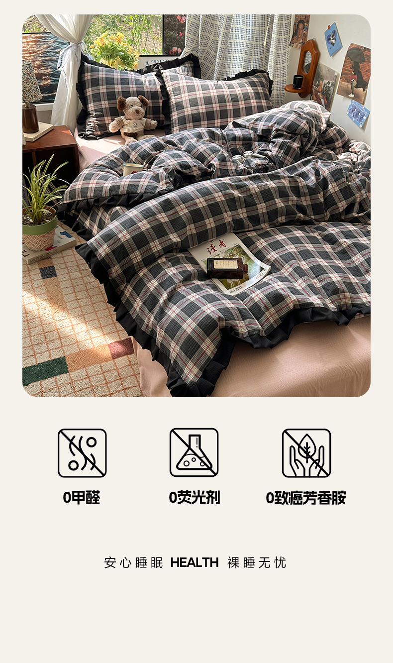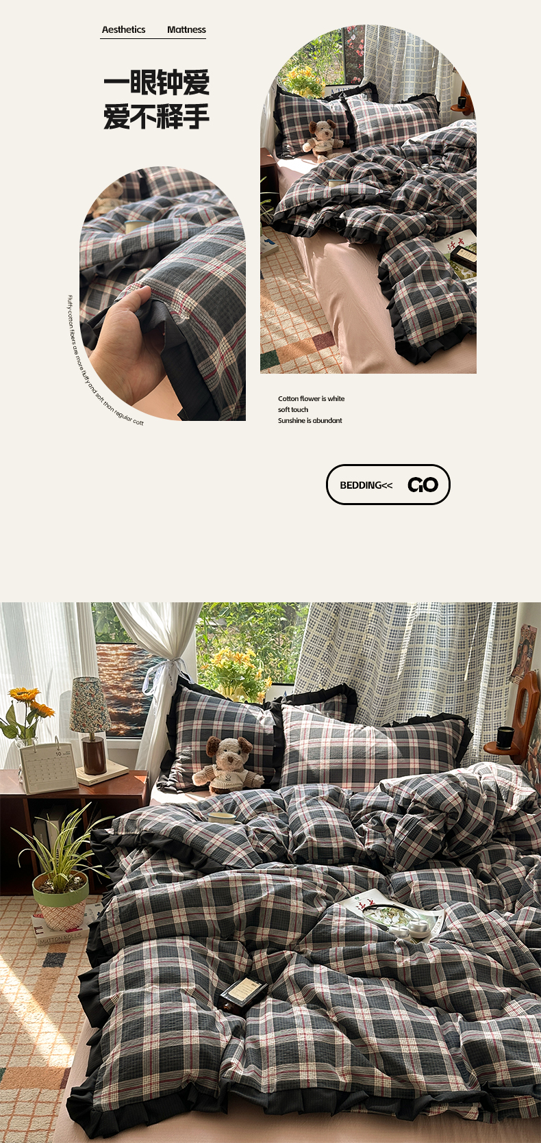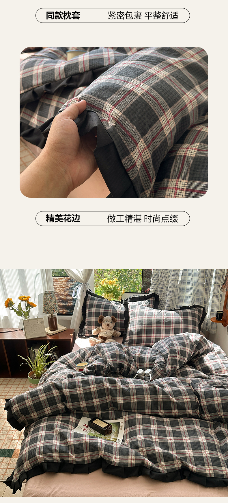 当前位置: 91家纺网 > 商品网购 > 床品套件 > 四件套 > 其它四件套 > 韩巢家纺 2025新款双层纱经典复古风格子被套四件套直播热销款学生宿舍寝室床单三件套 幻夜格纹【黑皱皱花边款】