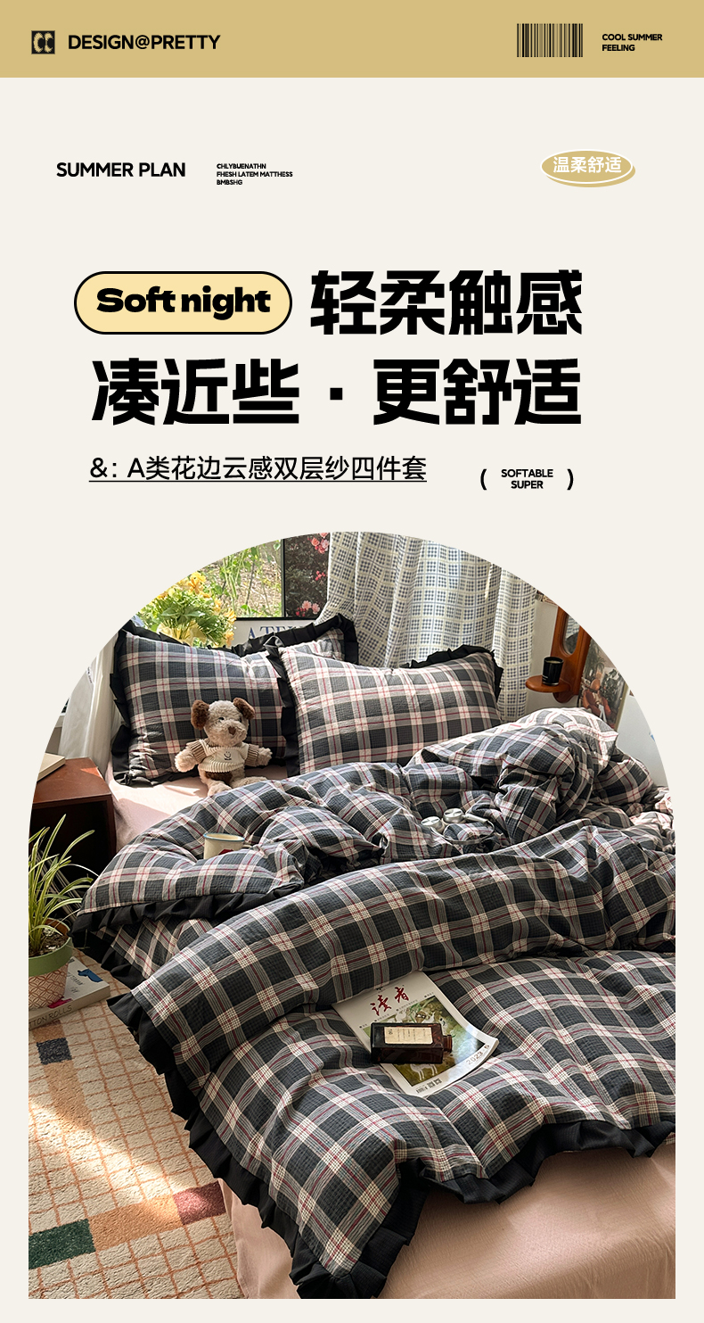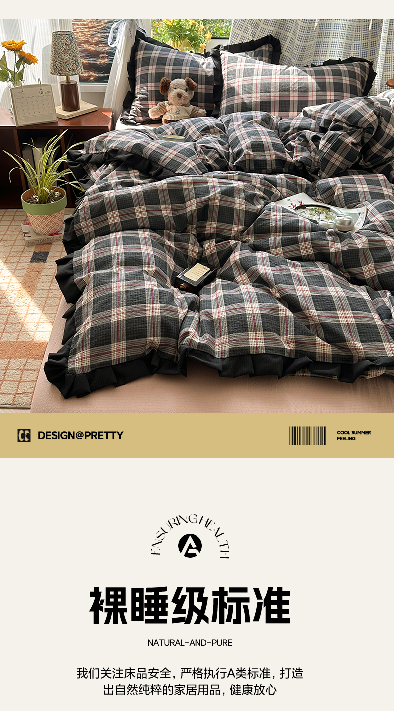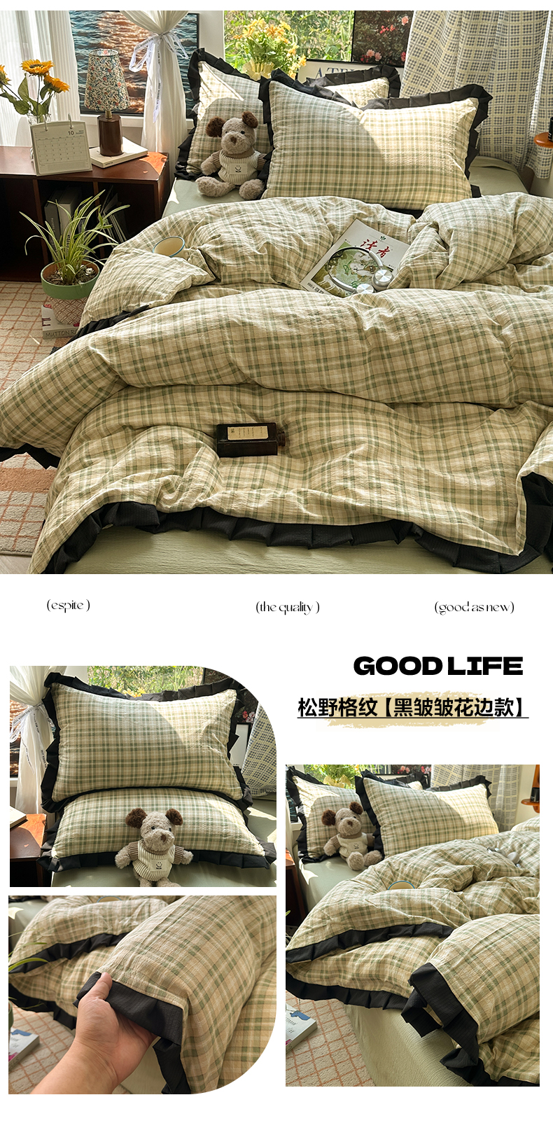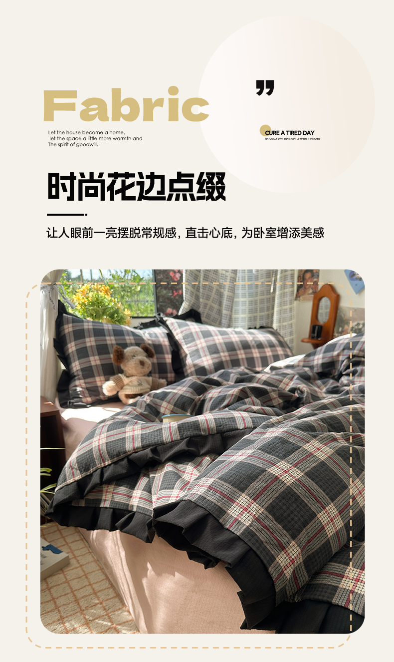 当前位置: 91家纺网 > 商品网购 > 床品套件 > 四件套 > 其它四件套 > 韩巢家纺 2025新款双层纱经典复古风格子被套四件套直播热销款学生宿舍寝室床单三件套 幻夜格纹【黑皱皱花边款】