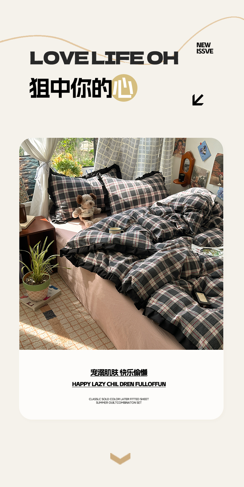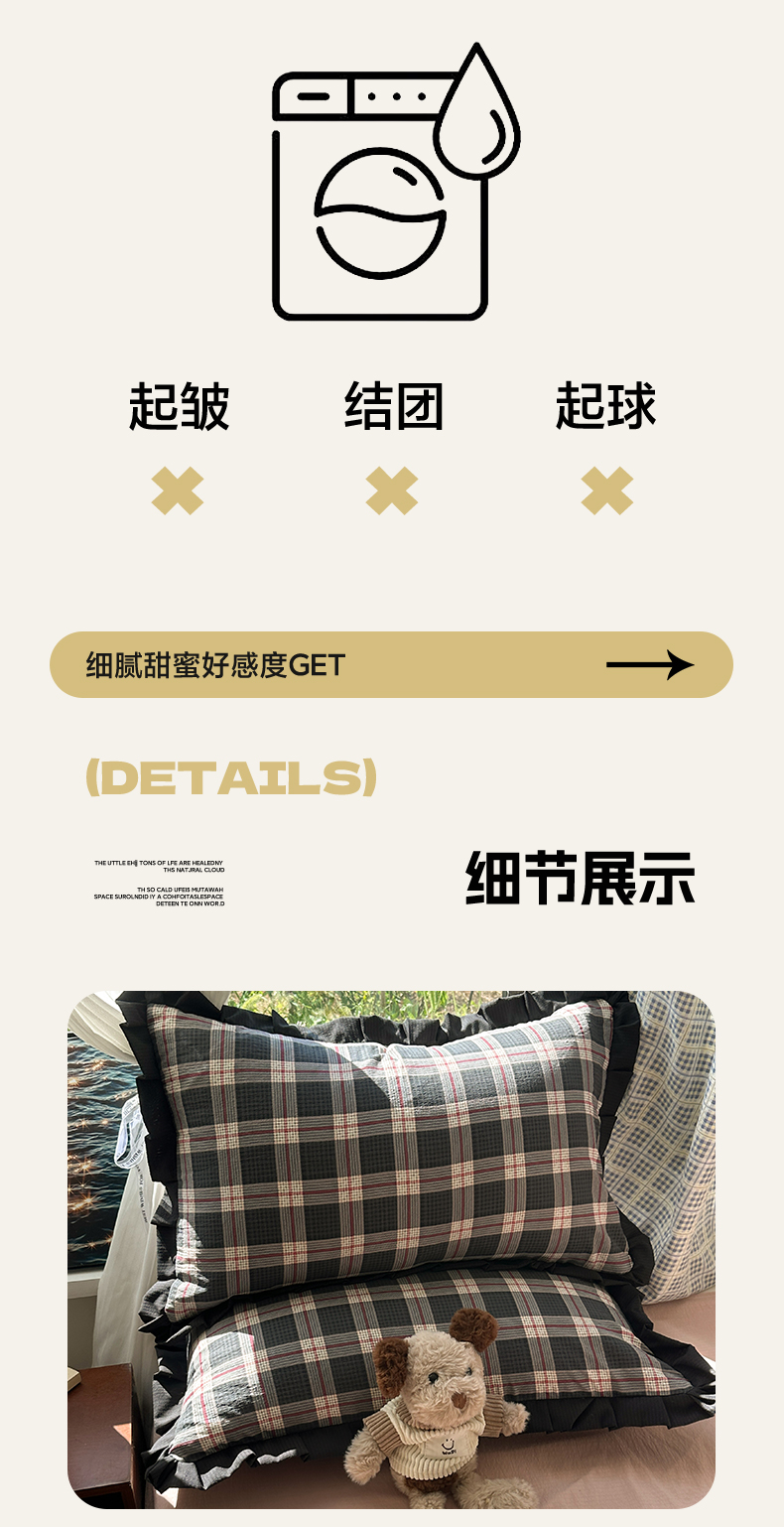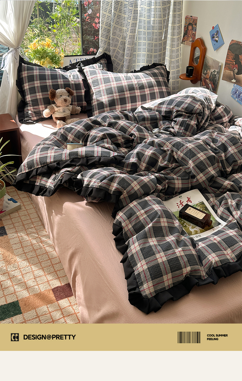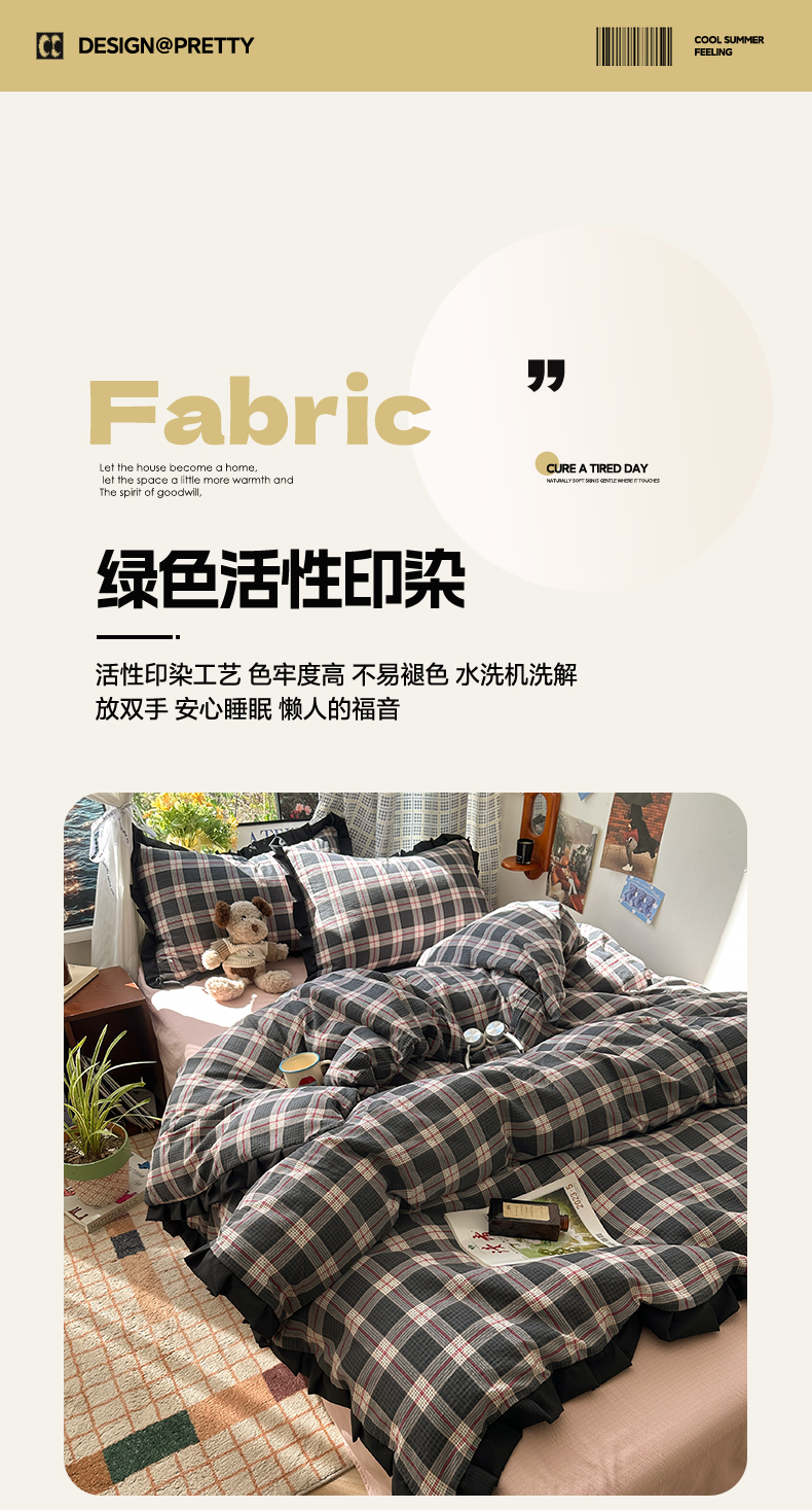 当前位置: 91家纺网 > 商品网购 > 床品套件 > 四件套 > 其它四件套 > 韩巢家纺 2025新款双层纱经典复古风格子被套四件套直播热销款学生宿舍寝室床单三件套 幻夜格纹【黑皱皱花边款】