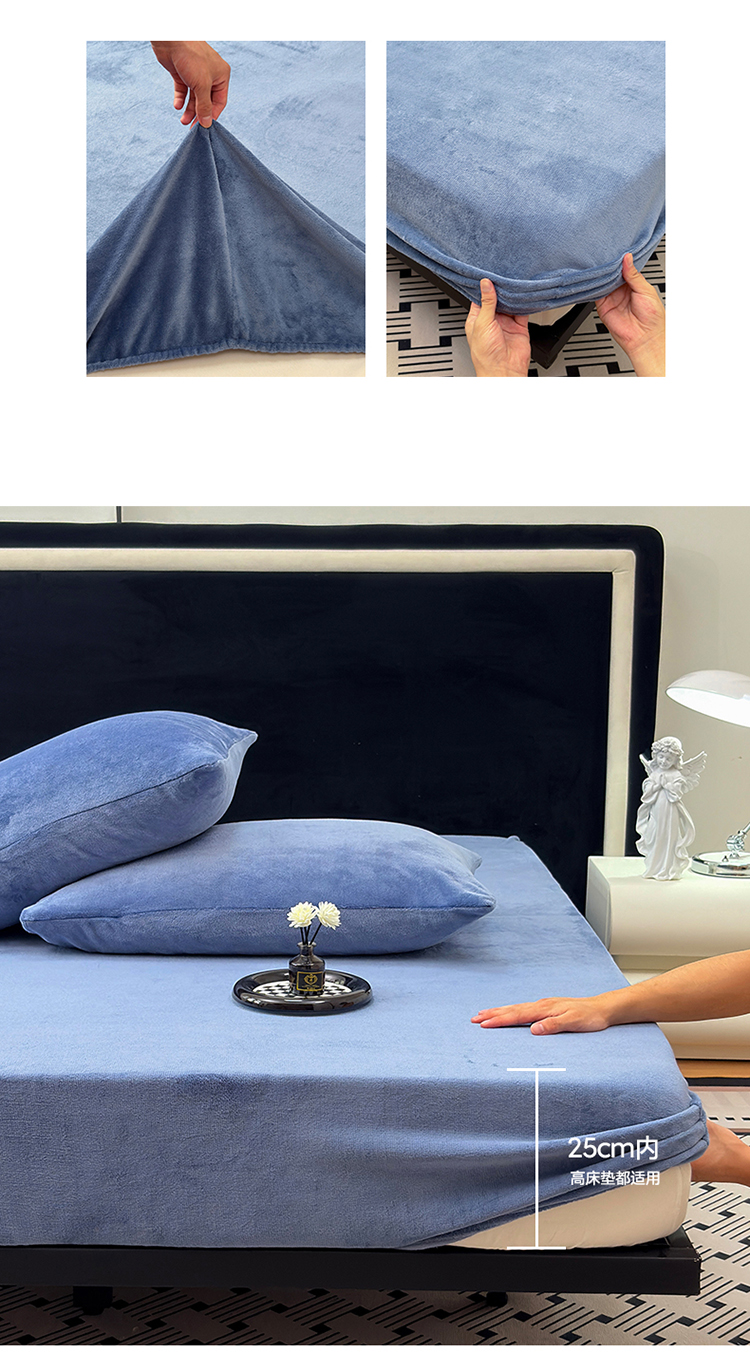 2025新款高克重纯色保暖牛奶绒单床笠枕套 宾利蓝