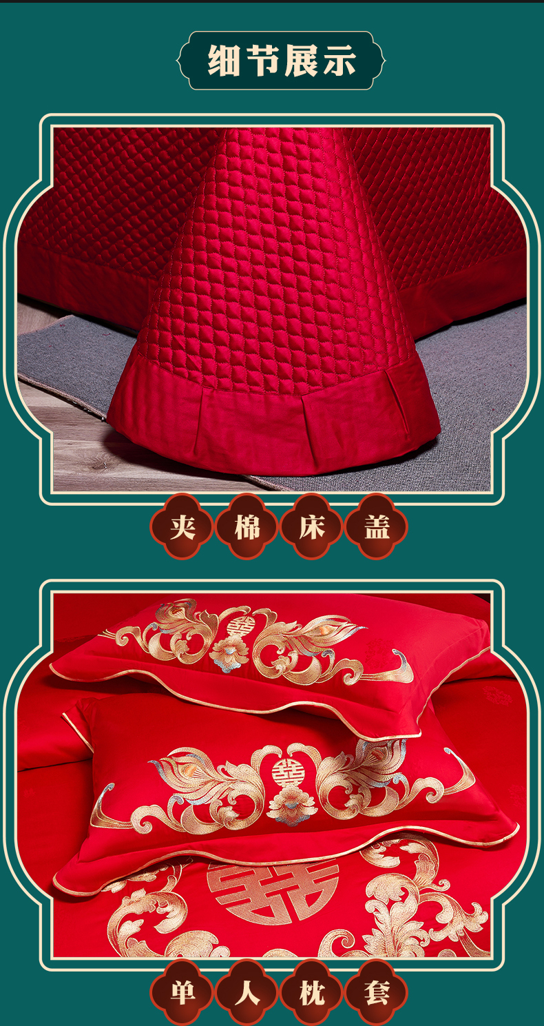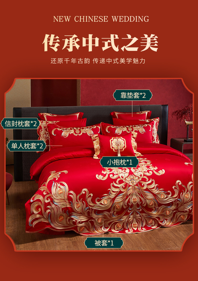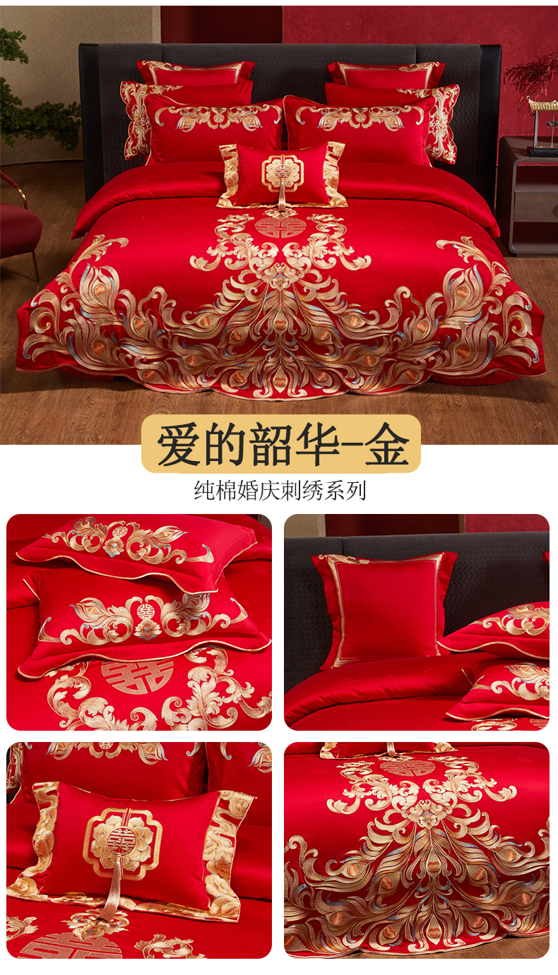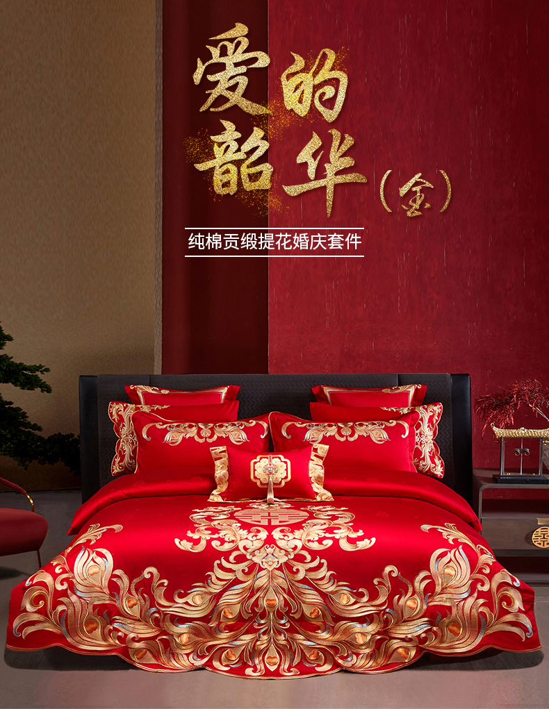 当前位置: 91家纺网 > 商品网购 > 床品套件 > 四件套 > 婚庆四件套 > 宏羽纺家纺 2025新款高支高密全棉提花新中式婚庆多件套 高支高密爱的韶华-金