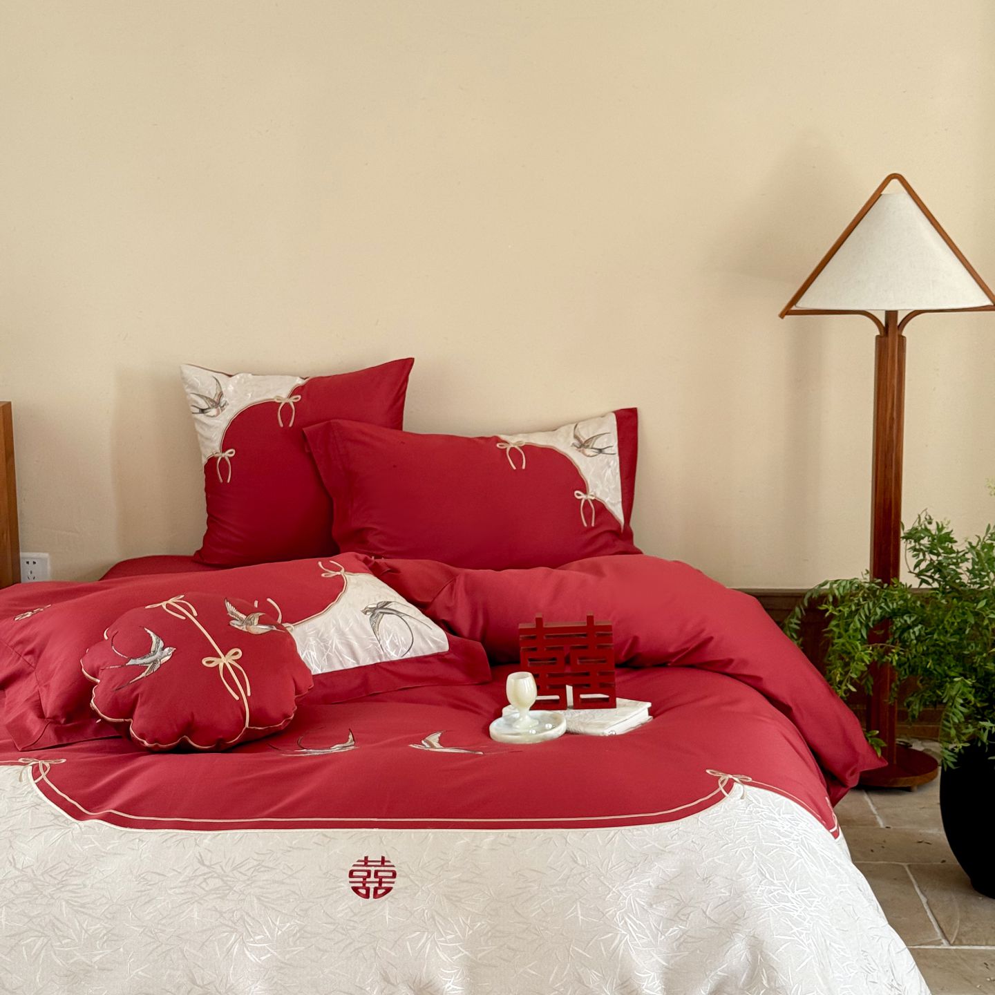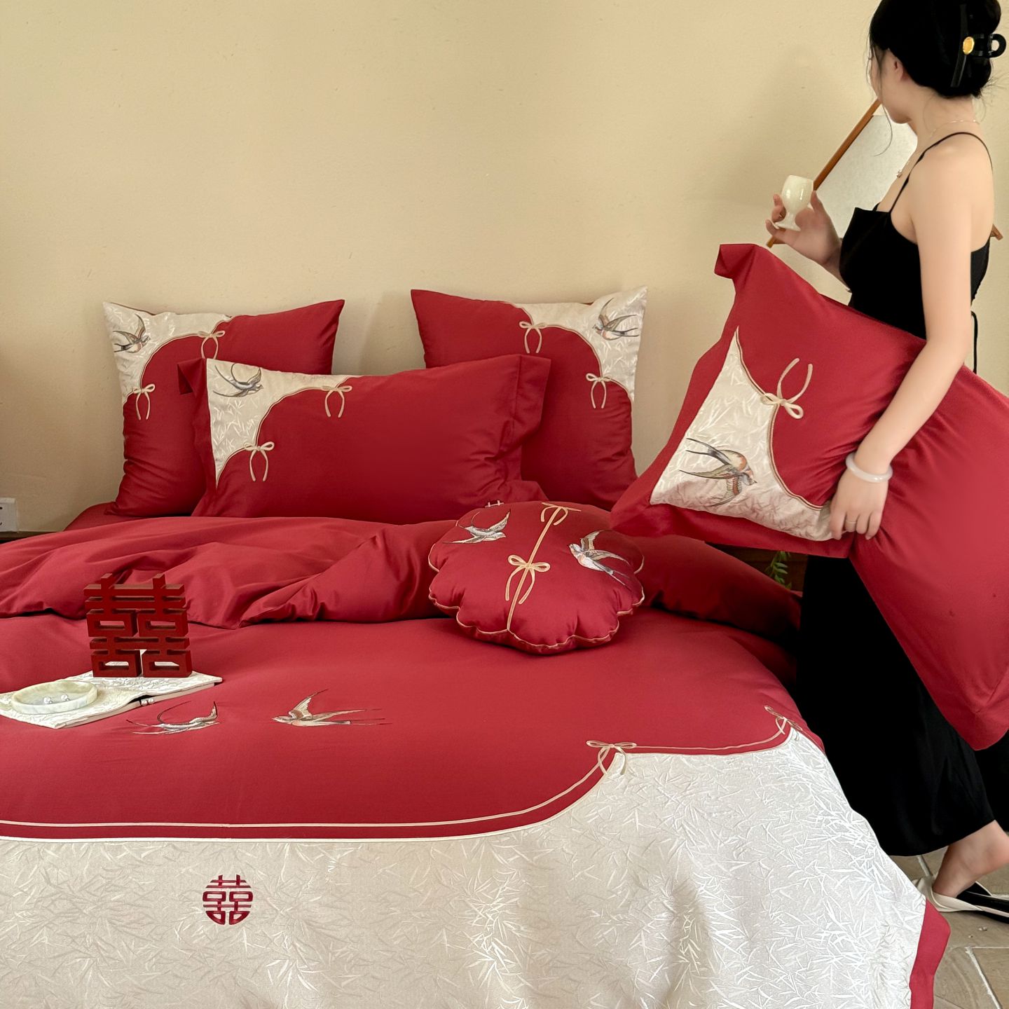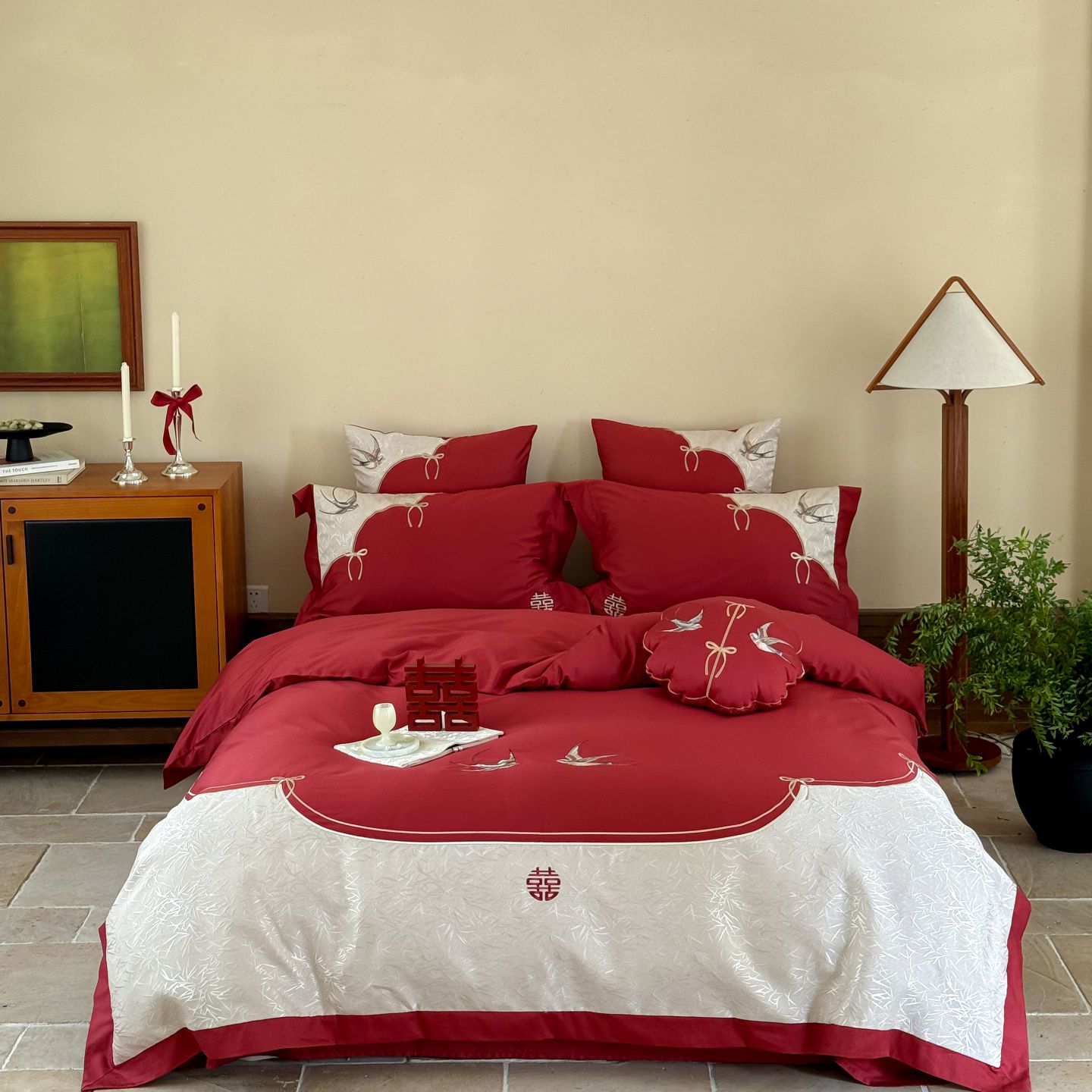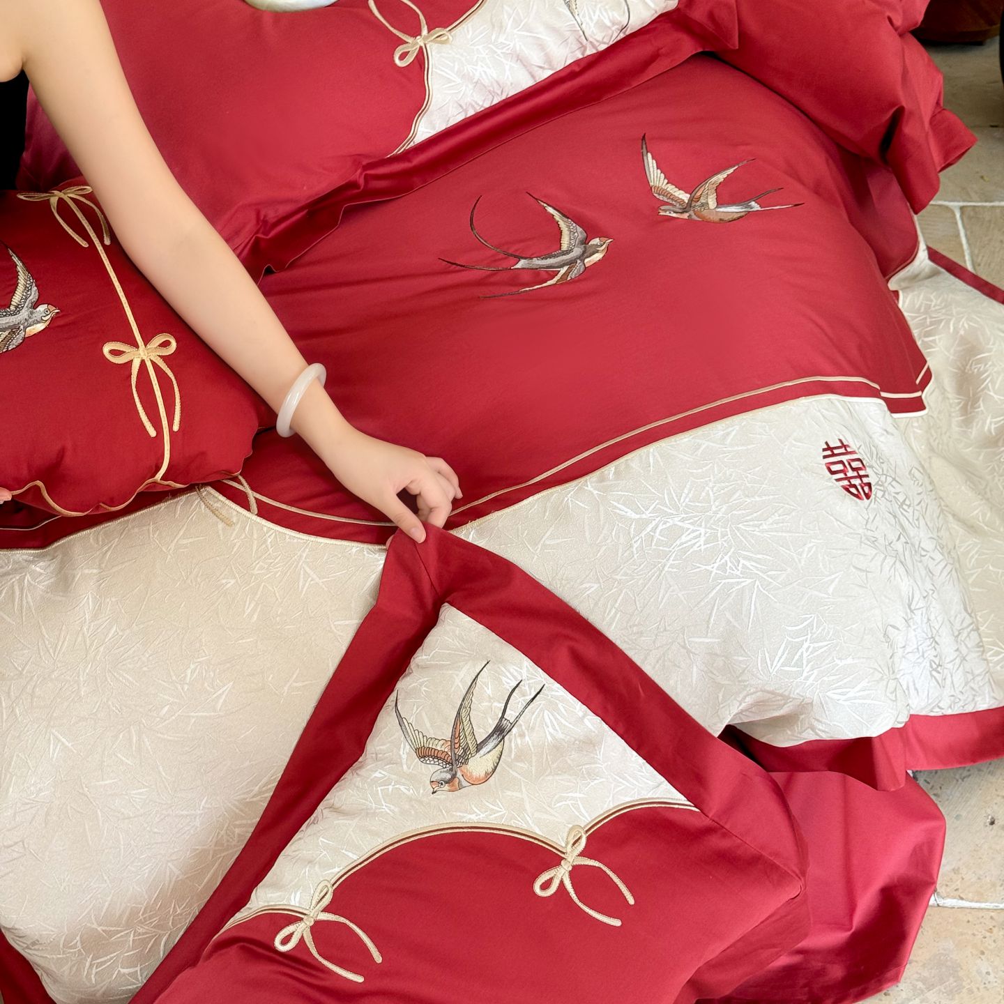 (总)西西家居 25新款100支长绒棉高精密提花拼接大红婚庆四件套-