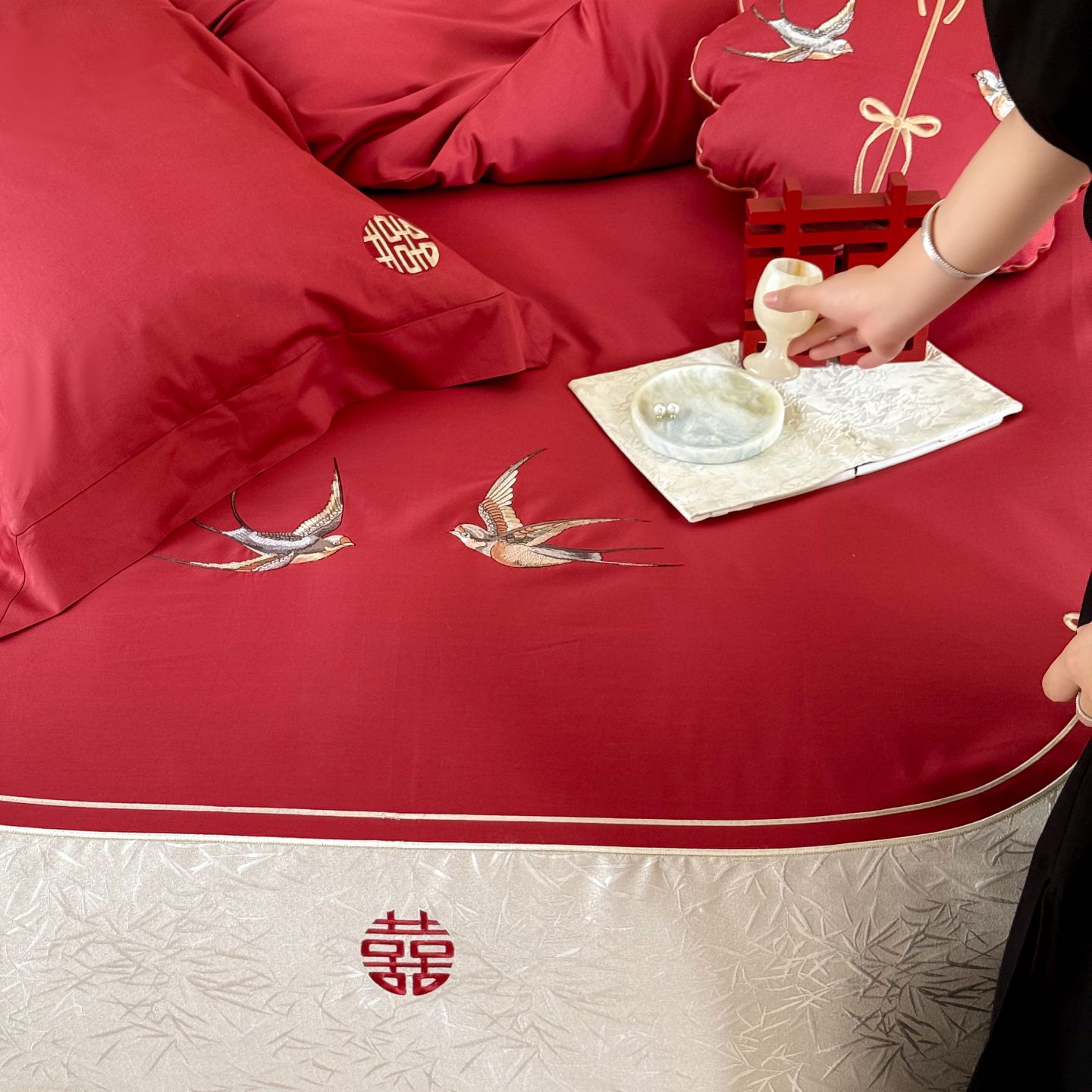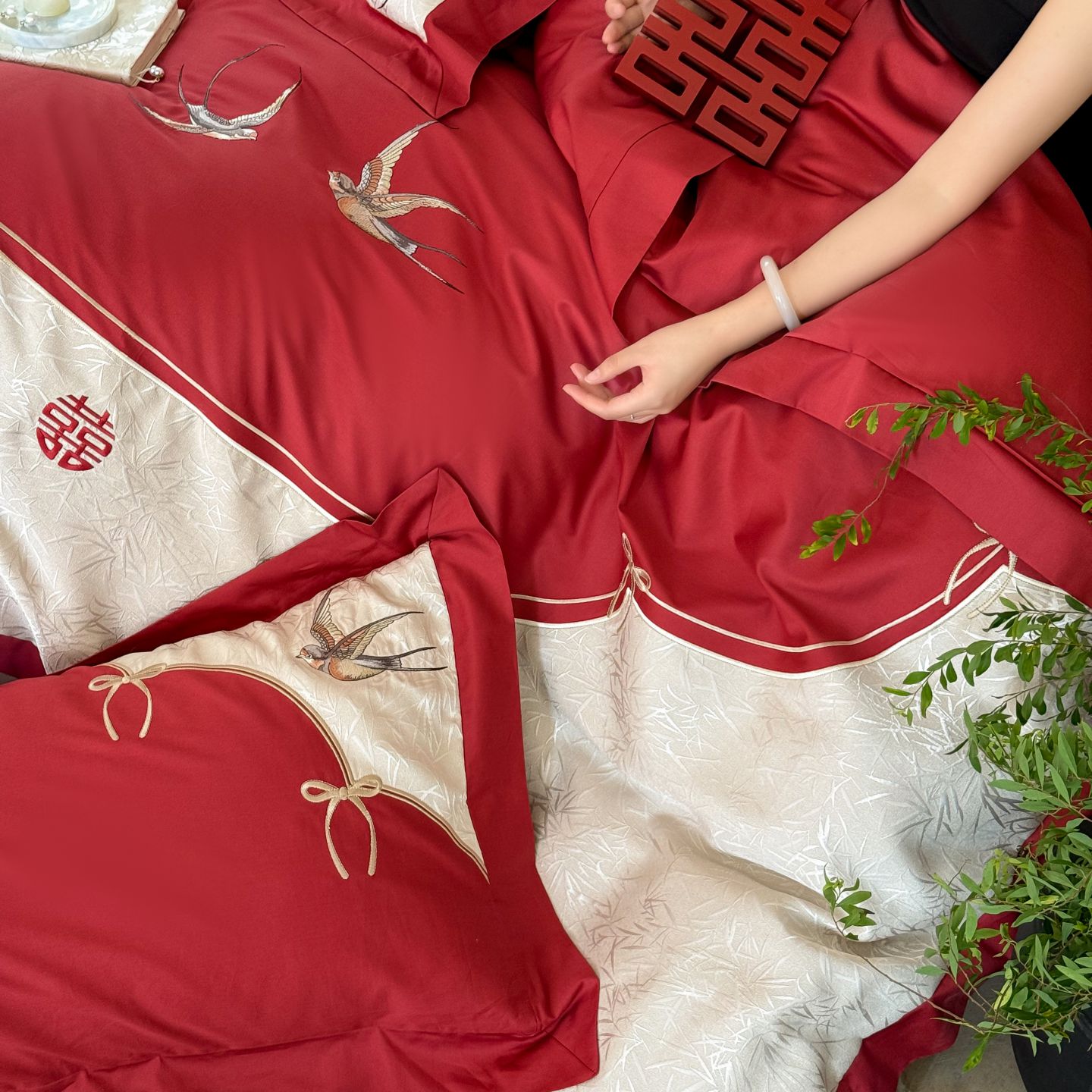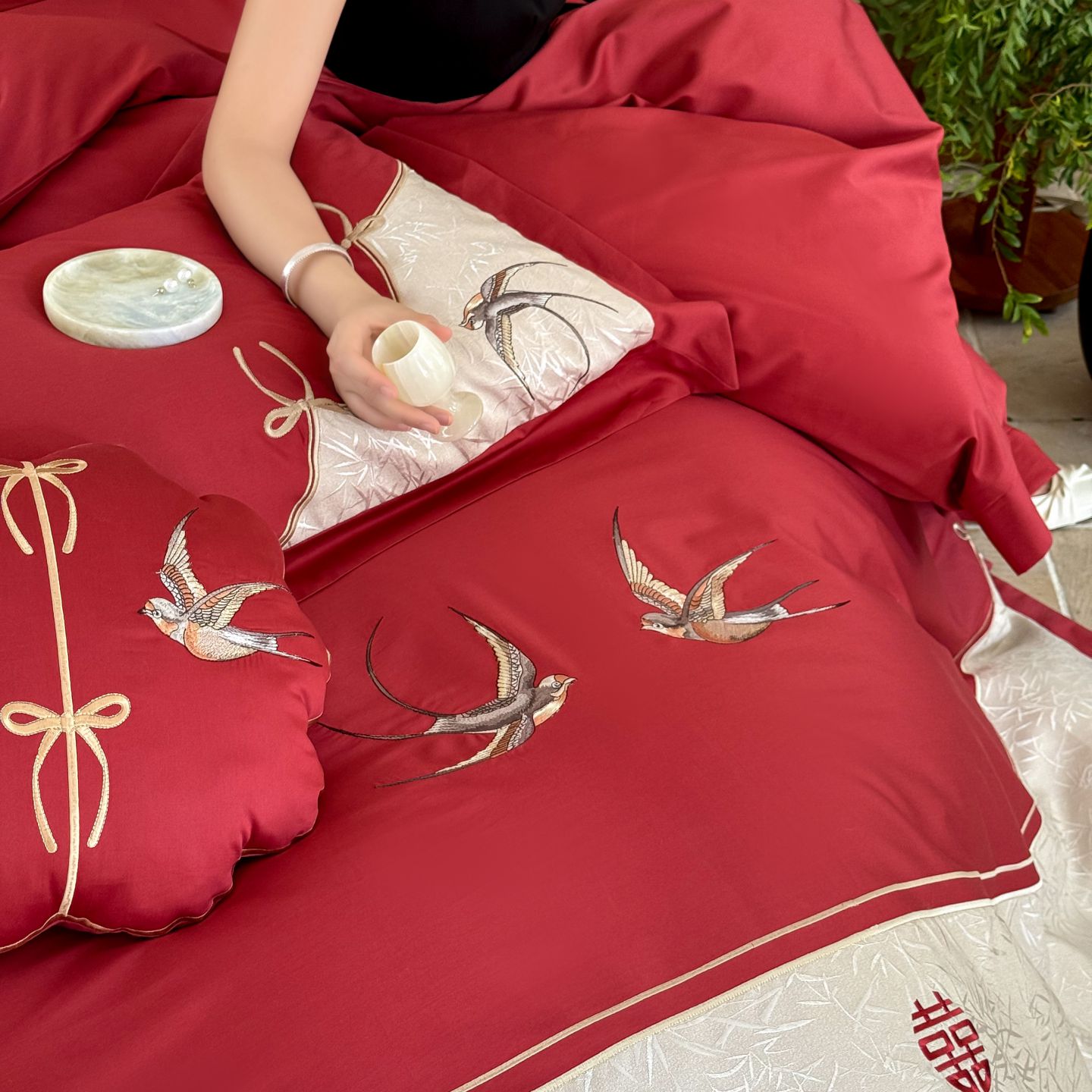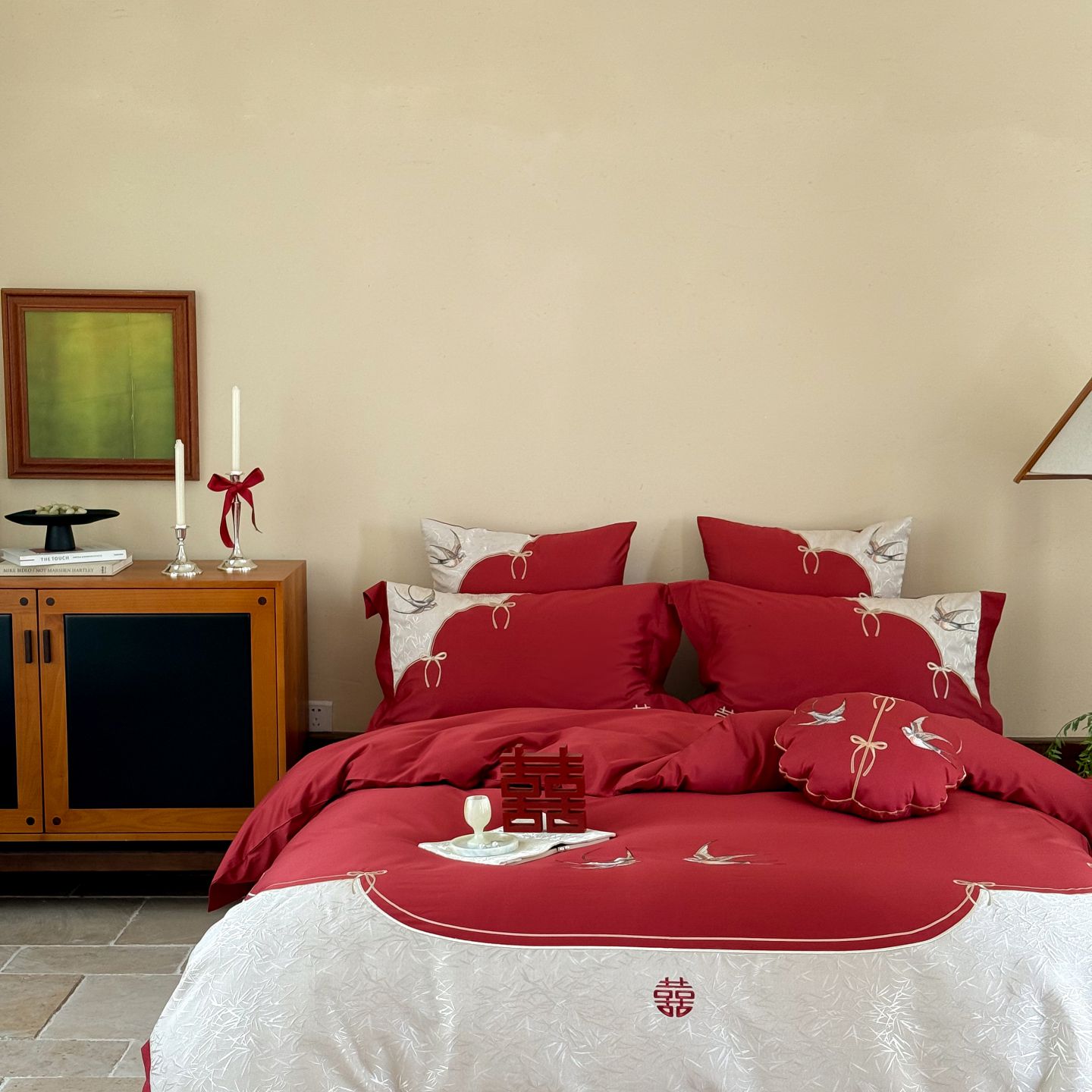 (总)西西家居 25新款100支长绒棉高精密提花拼接大红婚庆四件套-