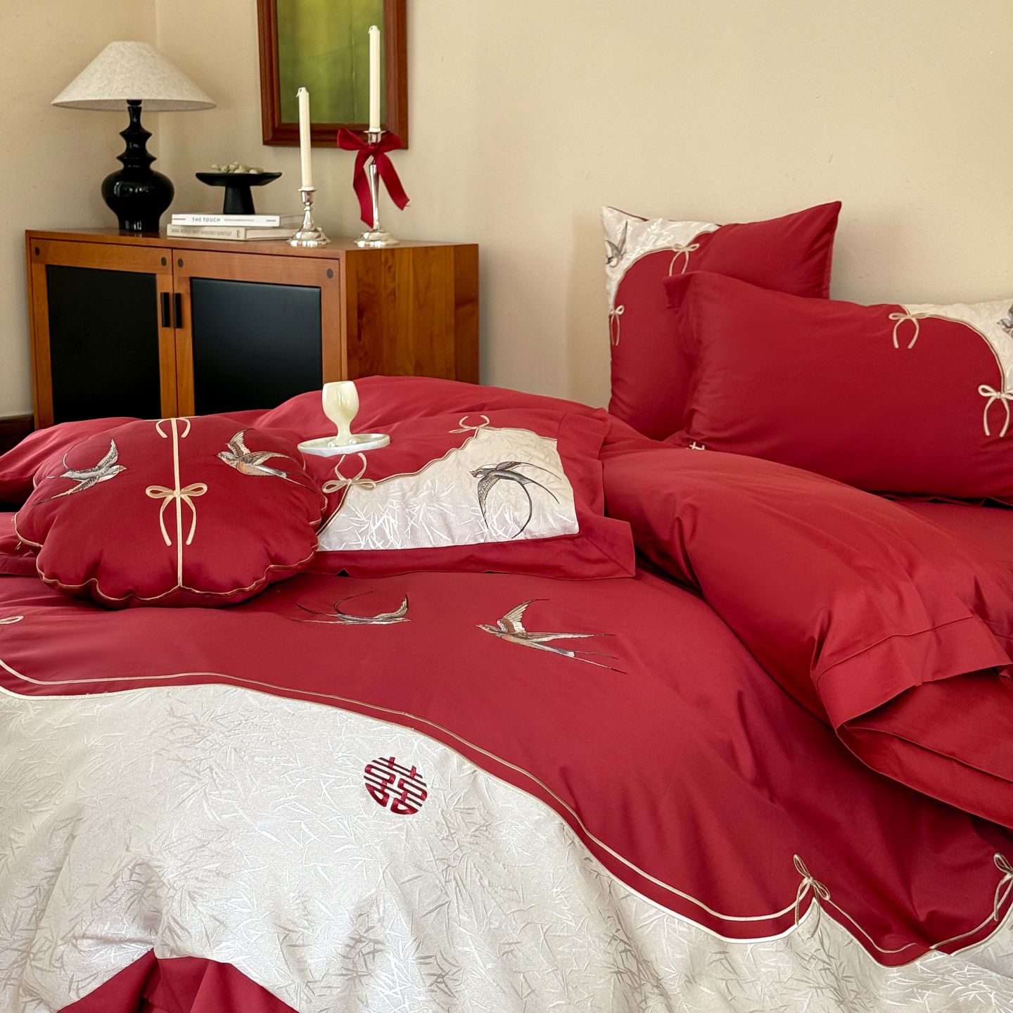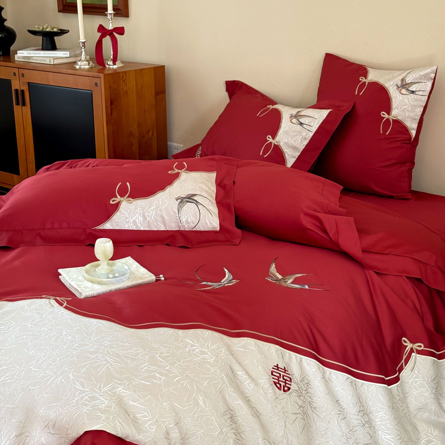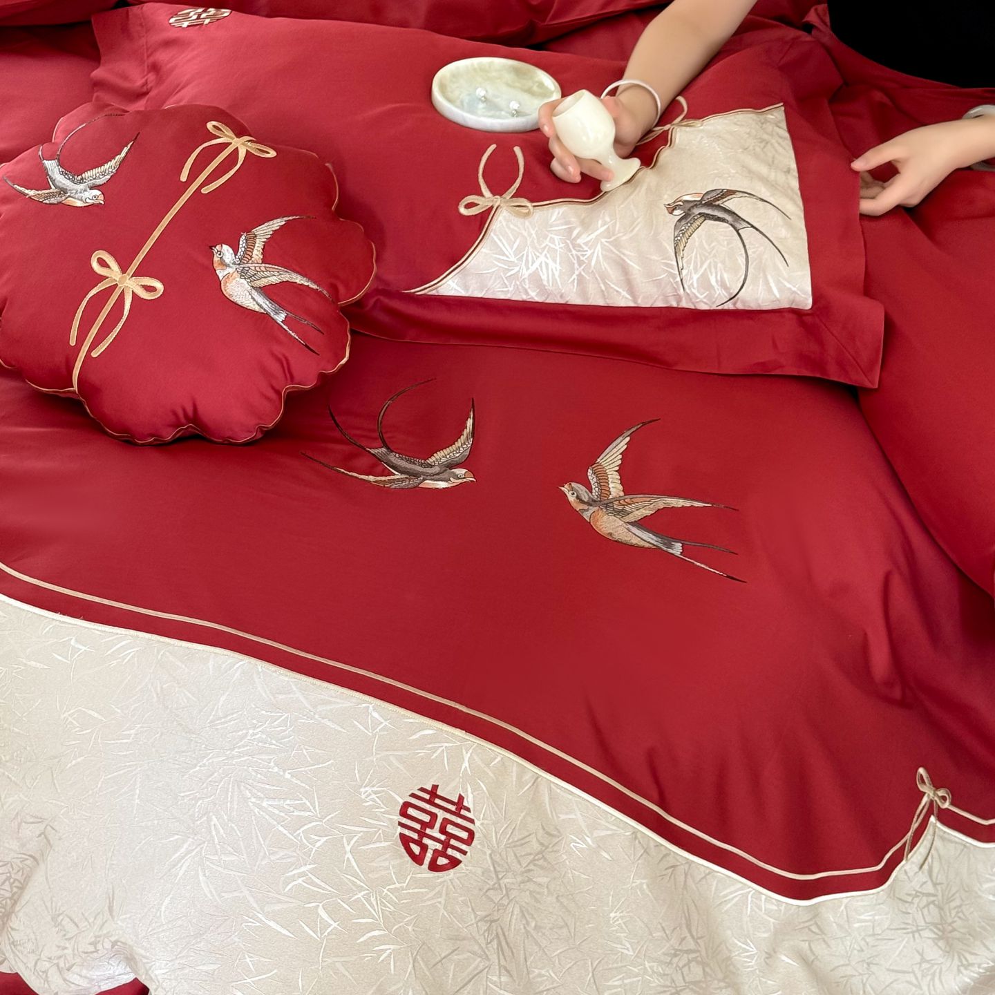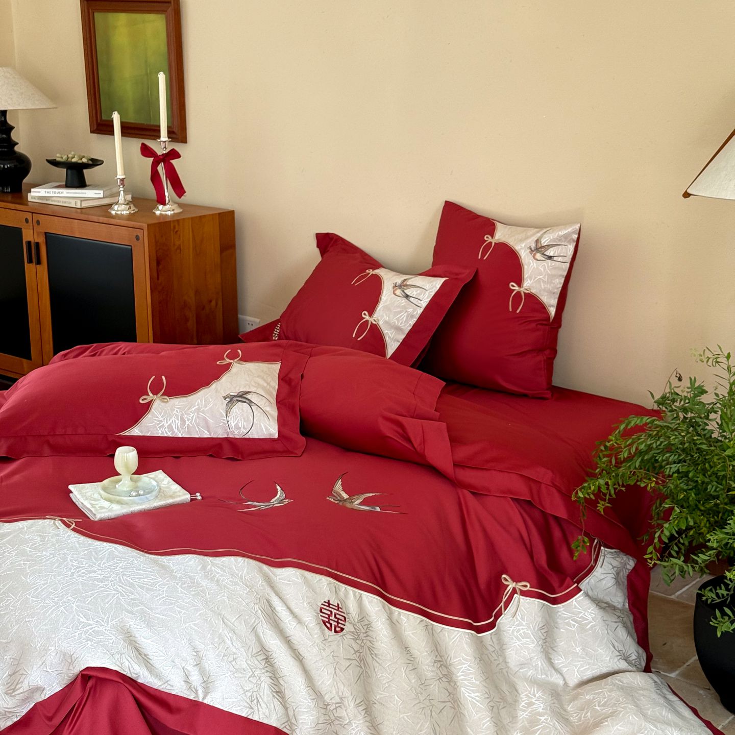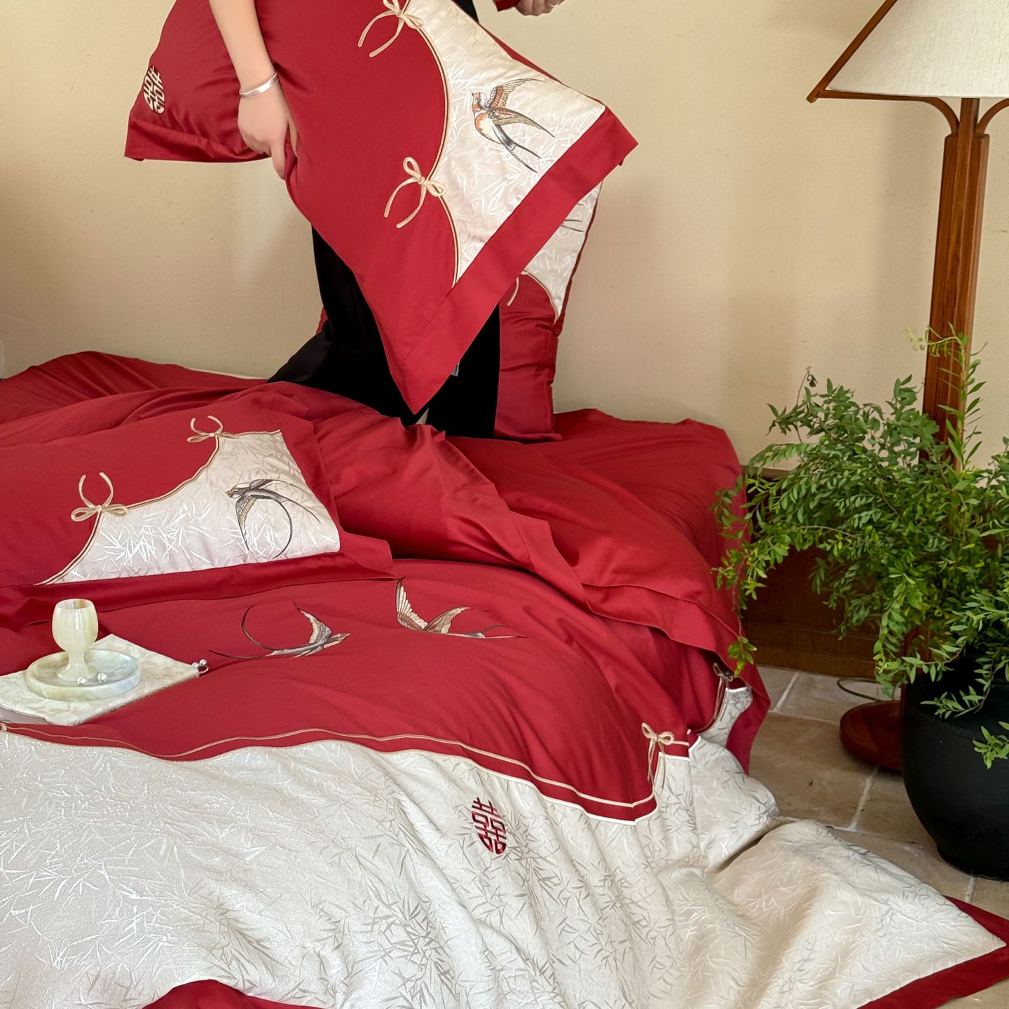 (总)西西家居 25新款100支长绒棉高精密提花拼接大红婚庆四件套-